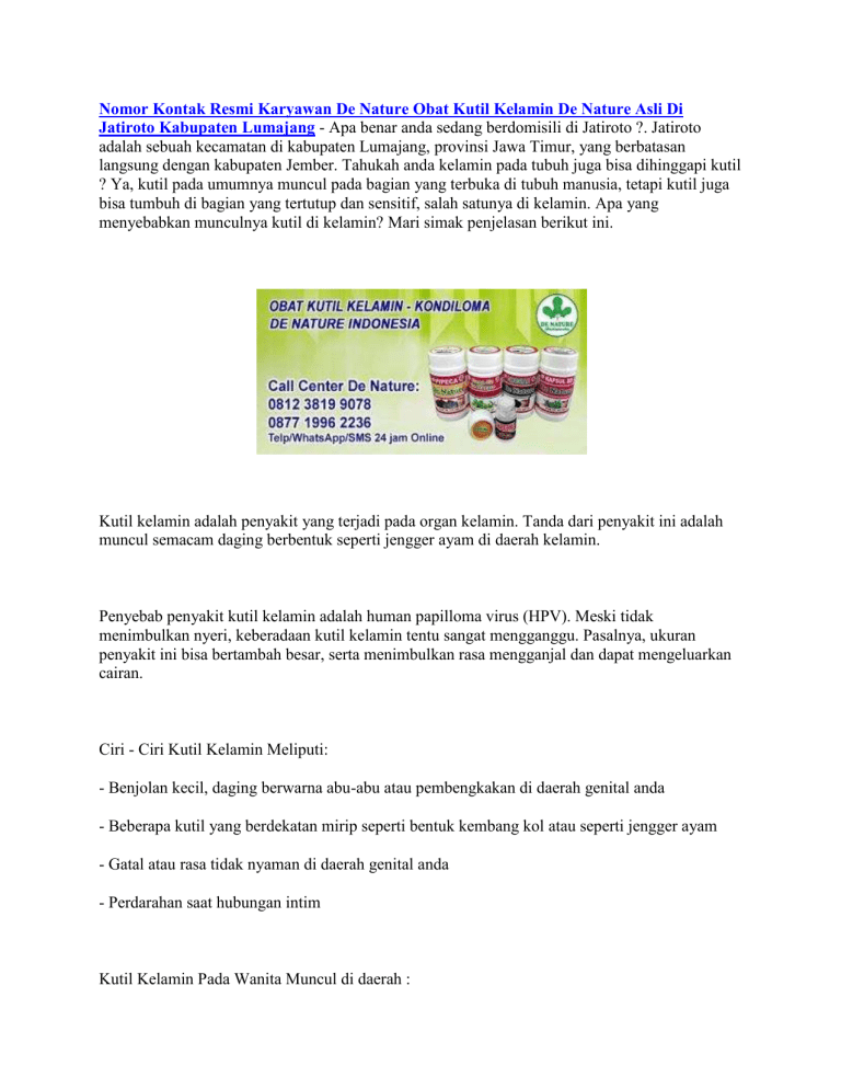 Nomor Kontak Resmi Karyawan De Nature Obat Kutil Kelamin De Nature Asli Di Jatiroto Kabupaten Lumajang - Apa benar anda sedang berdomisili di Jatiroto ?. Jatiroto adalah sebuah kecamatan di kabupaten Lumajang, provinsi Jawa Timur, yang berbatasan langsung dengan kabupaten Jember. Tahukah anda kelamin pada tubuh juga bisa dihinggapi kutil ? Ya, kutil pada umumnya muncul pada bagian yang terbuka di tubuh manusia, tetapi kutil juga bisa tumbuh di bagian yang tertutup dan sensitif, salah satunya di kelamin. Apa yang menyebabkan munculnya kutil di kelamin? Mari simak penjelasan berikut ini. Kutil kelamin adalah penyakit yang terjadi pada organ kelamin. Tanda dari penyakit ini adalah muncul semacam daging berbentuk seperti jengger ayam di daerah kelamin. Penyebab penyakit kutil kelamin adalah human papilloma virus (HPV). Meski tidak menimbulkan nyeri, keberadaan kutil kelamin tentu sangat mengganggu. Pasalnya, ukuran penyakit ini bisa bertambah besar, serta menimbulkan rasa mengganjal dan dapat mengeluarkan cairan. Ciri - Ciri Kutil Kelamin Meliputi: - Benjolan kecil, daging berwarna abu-abu atau pembengkakan di daerah genital anda - Beberapa kutil yang berdekatan mirip seperti bentuk kembang kol atau seperti jengger ayam - Gatal atau rasa tidak nyaman di daerah genital anda - Perdarahan saat hubungan intim Kutil Kelamin Pada Wanita Muncul di daerah : - Anus - Leher rahim - Paha - Vagina Sedangkan Pada Pria Kutil Kelamin muncul di : - Anus - Penis - Paha atas - Uretra Nomor Kontak Resmi Karyawan De Nature Obat Kutil Kelamin De Nature Asli Di Jatiroto Kabupaten Lumajang Kutil kelamin dapat juga diartikan sebagai pembengkakan di alat kelamin dengan warna abu-abu dan kadang-kadang muncul berkelompok dengan rupa seperti kembang kol atau seperti Jengger ayam. Pengobatan Kutil Kelamin Bisa dilihat di chanel youtube kami : Review Lengkap Aturan Pemakaian Obat Kutil Kelamin De Nature Yang Benar Informasi untuk kenyamanan anda, bahwa Produk dari perusahaan kami ini sudah memiliki: - Bersertifikat ISO 9001:2015 - Ijin Resmi Perusahaan dari Kementerian Kesehatan - Ijin BPOM, yang artinya sudah lulus Uji Stabilitas Produk - Sertifikat Halal MUI, sehingga kehalalannya bisa dipertanggung jawabkan - Apoteker Yang berpengalaman - Sudah melewati Proses Sortir Bahan Baku, Guna Menjaga Mutu Produk - Proses Produksi Sesuai Alur CPOTB (Cara Pembuatan Obat Tradisional Yang Baik Dan Benar) Konsultasi dan Pemesanan Obat Kutil Kelamin De Nature ,silahkan hubungi kami di nomor kontak De Nature: 0812-3819-9078 atau 0877-1996-2236. Penelusuran yang terkait: de nature indonesia, testimoni de nature, rekening de nature asli, rekening resmi de nature