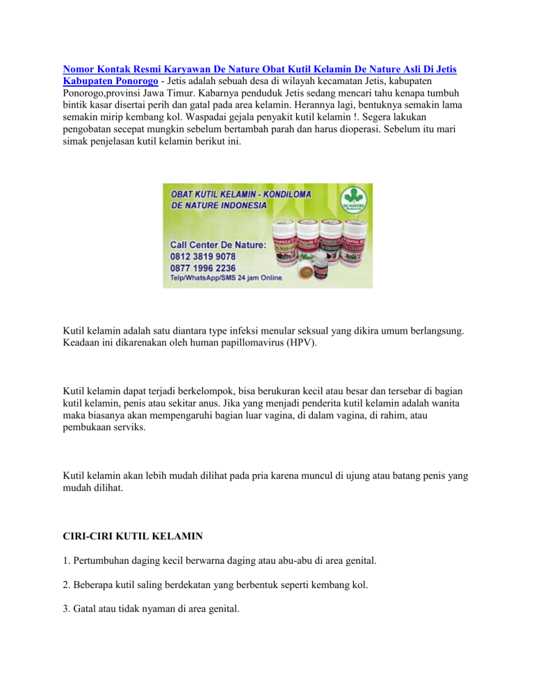 Nomor Kontak Resmi Karyawan De Nature Obat Kutil Kelamin De Nature Asli Di Jetis Kabupaten Ponorogo - Jetis adalah sebuah desa di wilayah kecamatan Jetis, kabupaten Ponorogo,provinsi Jawa Timur. Kabarnya penduduk Jetis sedang mencari tahu kenapa tumbuh bintik kasar disertai perih dan gatal pada area kelamin. Herannya lagi, bentuknya semakin lama semakin mirip kembang kol. Waspadai gejala penyakit kutil kelamin !. Segera lakukan pengobatan secepat mungkin sebelum bertambah parah dan harus dioperasi. Sebelum itu mari simak penjelasan kutil kelamin berikut ini. Kutil kelamin adalah satu diantara type infeksi menular seksual yang dikira umum berlangsung. Keadaan ini dikarenakan oleh human papillomavirus (HPV). Kutil kelamin dapat terjadi berkelompok, bisa berukuran kecil atau besar dan tersebar di bagian kutil kelamin, penis atau sekitar anus. Jika yang menjadi penderita kutil kelamin adalah wanita maka biasanya akan mempengaruhi bagian luar vagina, di dalam vagina, di rahim, atau pembukaan serviks. Kutil kelamin akan lebih mudah dilihat pada pria karena muncul di ujung atau batang penis yang mudah dilihat. CIRI-CIRI KUTIL KELAMIN 1. Pertumbuhan daging kecil berwarna daging atau abu-abu di area genital. 2. Beberapa kutil saling berdekatan yang berbentuk seperti kembang kol. 3. Gatal atau tidak nyaman di area genital. 4. Pendarahan saat atau sesudah hubungan seks. 5. Daging tumbuh diraba umumnya kasar. Virus yang menyebabkan adanya penyakit kutil kelamin adalah Human papilloma virus atau disingkat dengan sebutan HPV. Penderita akan merasakan gatal-gatal pada daerah sekitar genitalnya. Benjolan biasanya tumbuh secara individu, atau benjolan tersebut bisa tumbuh secara berdekatan atau mengelompok lebih besar. Benjolan-benjolan kutil kelamin biasa juga disebut dengan jengger ayam. KOMPLIKASI KUTIL KELAMIN - Kanker - Masalah selama kehamilan - Beresiko HIV Dalam kasus yang jarang, penyakit ini juga bisa menular ketika tangan seorang yang terinfeksi menyentuh area genitalnya sendiri dan kemudian menyentuh area genital pasangannya. Nomor Kontak Resmi Karyawan De Nature Obat Kutil Kelamin De Nature Asli Di Jetis Kabupaten Ponorogo KONDISI FISIK PENYEBAB KUTIL KELAMIN - Stres - Kencing manis atau diabetes melitus - Sistem imun tubuh yang lemah Bisa dilihat di chanel youtube kami : Review Lengkap Aturan Pemakaian Obat Kutil Kelamin De Nature Yang Benar OBAT KUTIL KELAMIN Informasi untuk kenyamanan anda, bahwa Produk dari perusahaan kami ini sudah memiliki: - Bersertifikat ISO 9001:2015 - Ijin Resmi Perusahaan dari Kementerian Kesehatan - Ijin BPOM, yang artinya sudah lulus Uji Stabilitas Produk - Sertifikat Halal MUI, sehingga kehalalannya bisa dipertanggung jawabkan - Apoteker Yang berpengalaman - Sudah melewati Proses Sortir Bahan Baku, Guna Menjaga Mutu Produk - Proses Produksi Sesuai Alur CPOTB (Cara Pembuatan Obat Tradisional Yang Baik Dan Benar) Informasi konsultasi dan pemesanan Obat Kutil Kelamin De Nature ,silahkan hubungi kami di nomor kontak De Nature: 0812-3819-9078 atau 0877-1996-2236. Penelusuran yang terkait: de nature indonesia, testimoni de nature, rekening de nature asli, rekening resmi de nature.