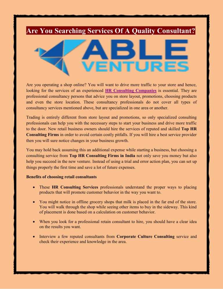 Are You Searching Services Of A Quality Consultant? Are you operating a shop online? You will want to drive more traffic to your store and hence, looking for the services of an experienced HR Consulting Companies is essential. They are professional consultancy persons that advice you on store layout, promotions, choosing products and even the store location. These consultancy professionals do not cover all types of consultancy services mentioned above, but are specialized in one area or another. Trading is entirely different from store layout and promotions, so only specialized consulting professionals can help you with the necessary steps to start your business and drive more traffic to the door. New retail business owners should hire the services of reputed and skilled Top HR Consulting Firms in order to avoid certain costly pitfalls. If you will hire a best service provider then you will sure notice changes in your business growth. You may hold back assuming this an additional expense while starting a business, but choosing a consulting service from Top HR Consulting Firms in India not only save you money but also help you succeed in the new venture. Instead of using a trial and error action plan, you can set up things properly the first time and save a lot of future expenses. Benefits of choosing retail consultants These HR Consulting Services professionals understand the proper ways to placing products that will promote customer behavior in the way you want to. You might notice in offline grocery shops that milk is placed in the far end of the store. You will walk through the shop while seeing other items to buy in the sideway. This kind of placement is done based on a calculation on customer behavior. When you look for a professional retain consultant to hire, you should have a clear idea on the results you want. Interview a few reputed consultants from Corporate Culture Consulting service and check their experience and knowledge in the area. Retail business is not a regulated niche, so particular degrees are not needed to work as retail consultants. However, they need to have sound experience in the area where your business includes. Ask for references and a free estimate of plans and actions they can do for you. Finding a professional consultant or HR Learning and Development service provider is not an easy task. You have to do some careful research to find the best service. Most consulting professionals do work from distance, but are ready to reach your destination if needed. Check if the consultant has the potential to increase your sales and leads. With many consulting professionals, choosing the most experienced and skilled consultancy service is a difficult task. You have to ask your business associates, colleagues, friends and relatives for references and recommendations on reliable and reputed service providers. Look at online sources such as web directories, forums and review sites to collect reliable information about consultancy services that can deliver quality results in terms of traffic and profit.