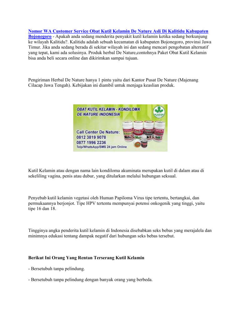 Nomor WA Customer Service Obat Kutil Kelamin De Nature Asli Di Kalitidu Kabupaten Bojonegoro - Apakah anda sedang menderita penyakit kutil kelamin ketika sedang berkunjung ke wilayah Kalitidu?. Kalitidu adalah sebuah kecamatan di kabupaten Bojonegoro, provinsi Jawa Timur. Jika anda sedang berada di sekitar wilayah ini dan sedang mencari pengobatan alternatif yang tepat, kami ada solusinya. Produk herbal De Nature,contohnya Paket Obat Kutil Kelamin bisa anda beli secara online dan dikirimkan sampai tujuan. Pengiriman Herbal De Nature hanya 1 pintu yaitu dari Kantor Pusat De Nature (Majenang Cilacap Jawa Tengah). Kebijakan ini diambil untuk menjaga keaslian produk. Kutil Kelamin atau dengan nama lain kondiloma akuminata merupakan kutil di dalam atau di sekeliling vagina, penis atau dubur, yang ditularkan melalui hubungan seksual. Penyebab kutil kelamin vegetasi oleh Human Papiloma Virus tipe tertentu, bertangkai, dan permukaannya berjonjot. Tipe HPV tertentu mempunyai potensi onkogenik yang tinggi, yaitu tipe 16 dan 18. Tingginya angka penderita kutil kelamin di Indonesia disebabkan seks bebas yang merajalela dan minimnya edukasi tentang dampak negatif dari hubungan seks bebas tersebut. Berikut Ini Orang Yang Rentan Terserang Kutil Kelamin - Bersetubuh tanpa pelindung. - Bersetubuh tanpa pelindung dengan banyak orang yang berbeda. - Stres dan menderita infeksi virus lainnya seperti HIV atau herpes pada waktu yang sama. - Berhubungan seks dengan seseorang yang tidak diketahui riwayat seksual. Penyakit Kutil kelamin atau Genital Warts ( kutil kemaluan ) ditularkan terutama melalui kontak seksual.Dalam kasus yang jarang, penularan dapat terjadi secara tidak langsung setelah menggunakan handuk yang terkontaminasi. Bayi juga dapat terinfeksi selama proses kelahiran. Nomor WA Customer Service Obat Kutil Kelamin De Nature Asli Di Kalitidu Kabupaten Bojonegoro Tanda-Tanda Dan Ciri Penyakit Kutil Kelamin - Pendarahan - Kutil bisa berdarah - Pada wanita muncul di bibir vagina, serviks, vagina - Warna Kutil di kelamin hitam agak kemerahan, abu-abu agak kemerahan, cokelat agak kemerahan dan juga merah. - Munculnya Benjolan di kelamin secara bergerombol - Nyeri - Kemerahan - Menyerupai Jengger Ayam - Menyerupai Kembang Kol - Terasa Gatal - Tidak Nyaman - Berbau - Perih - Benjolan berisi daging - Bentuk benjolan kecil - Bengkak Penderita penyakit kutil kelamin yang telah terinveksi disarankan untuk segera melakukan pengobatan secepat mungkin sebelum Virus HPV penyebab kutil kelamin makin banyak (berkembang biak). Bisa dilihat di chanel youtube kami : Review Lengkap Aturan Pemakaian Obat Kutil Kelamin De Nature Yang Benar Obat Kutil Kelamin Alami Konsultasi dan Pemesanan Obat Kutil Kelamin De Nature silahkan hubungi kami di nomor kontak De Nature: 0812-3819-9078 atau 0877-1996-2236. Informasi untuk kenyamanan anda, bahwa Produk dari perusahaan kami ini sudah memiliki: - Bersertifikat ISO 9001:2015 - Ijin Resmi Perusahaan dari Kementerian Kesehatan - Ijin BPOM, yang artinya sudah lulus Uji Stabilitas Produk - Sertifikat Halal MUI, sehingga kehalalannya bisa dipertanggung jawabkan - Apoteker Yang berpengalaman - Sudah melewati Proses Sortir Bahan Baku, Guna Menjaga Mutu Produk - Proses Produksi Sesuai Alur CPOTB (Cara Pembuatan Obat Tradisional Yang Baik Dan Benar) Penelusuran yang terkait: de nature indonesia, testimoni de nature, cv de nature indonesia kabupaten cilacap jawa tengah, kantor pusat de nature indonesia