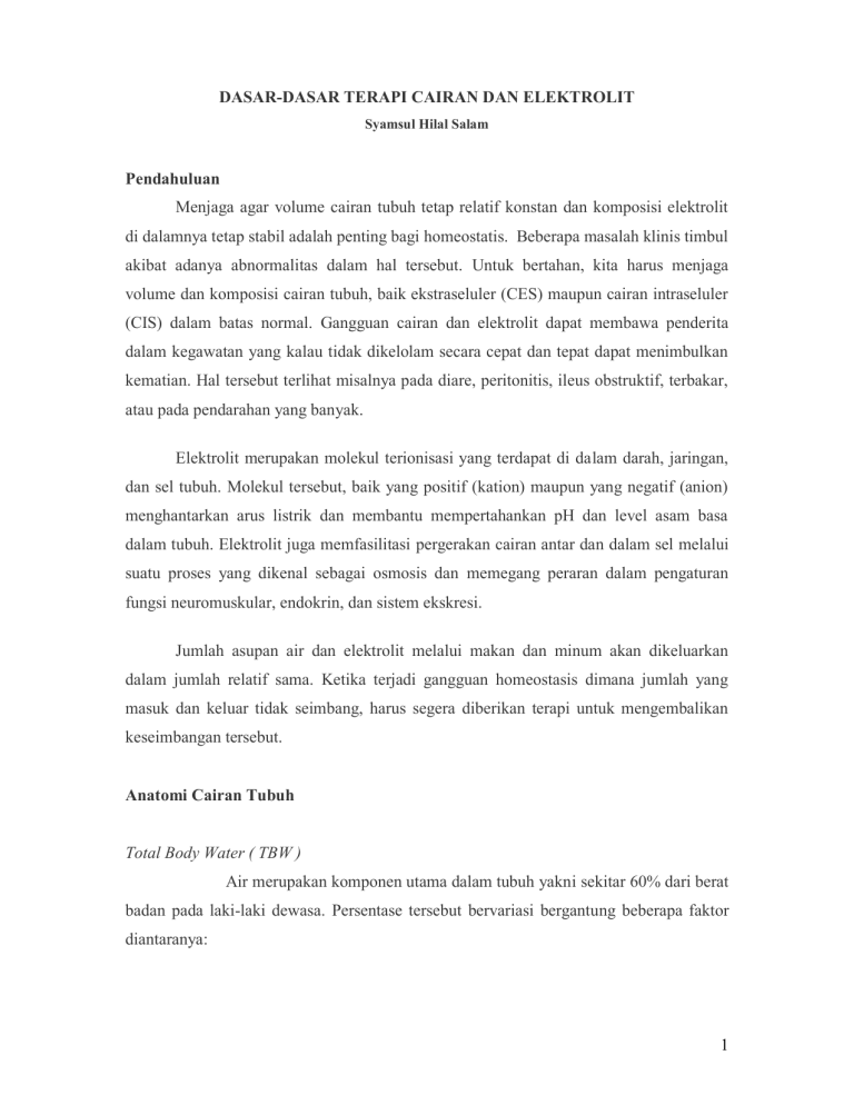 DASAR-DASAR TERAPI CAIRAN DAN ELEKTROLIT Syamsul Hilal Salam Pendahuluan Menjaga agar volume cairan tubuh tetap relatif konstan dan komposisi elektrolit di dalamnya tetap stabil adalah penting bagi homeostatis. Beberapa masalah klinis timbul akibat adanya abnormalitas dalam hal tersebut. Untuk bertahan, kita harus menjaga volume dan komposisi cairan tubuh, baik ekstraseluler (CES) maupun cairan intraseluler (CIS) dalam batas normal. Gangguan cairan dan elektrolit dapat membawa penderita dalam kegawatan yang kalau tidak dikelolam secara cepat dan tepat dapat menimbulkan kematian. Hal tersebut terlihat misalnya pada diare, peritonitis, ileus obstruktif, terbakar, atau pada pendarahan yang banyak. Elektrolit merupakan molekul terionisasi yang terdapat di dalam darah, jaringan, dan sel tubuh. Molekul tersebut, baik yang positif (kation) maupun yang negatif (anion) menghantarkan arus listrik dan membantu mempertahankan pH dan level asam basa dalam tubuh. Elektrolit juga memfasilitasi pergerakan cairan antar dan dalam sel melalui suatu proses yang dikenal sebagai osmosis dan memegang peraran dalam pengaturan fungsi neuromuskular, endokrin, dan sistem ekskresi. Jumlah asupan air dan elektrolit melalui makan dan minum akan dikeluarkan dalam jumlah relatif sama. Ketika terjadi gangguan homeostasis dimana jumlah yang masuk dan keluar tidak seimbang, harus segera diberikan terapi untuk mengembalikan keseimbangan tersebut. Anatomi Cairan Tubuh Total Body Water ( TBW ) Air merupakan komponen utama dalam tubuh yakni sekitar 60% dari berat badan pada laki-laki dewasa. Persentase tersebut bervariasi bergantung beberapa faktor diantaranya: 1 TBW pada orang dewasa berkisar antara 45-75% dari berat badan. Kisaran ini tergantung pada tiap individu yang memiliki jumlah jaringan adipose yang berbeda, yang mana jaringan ini hanya mengandung sedikit air. TBW pada wanita lebih kecil dibanding dengan laki-laki dewasa pada umur yang sama, karena struktur tubuh wanita dewasa yang umumnya lebih banyak mengandung jaringan lemak. TBW pada neonatus lebih tinggi yaitu sekitar 70-80% berat badan Untuk beberapa alasan, obesitas serta peningkatan usia akan menurunjkan jumlah kandungan total air tubuh TBW dibagi dalam 2 komponen utama yaitu cairan intraseluler (CIS) dan cairan ekstra seluler (CES) seperti terlihat pada gambar Body 100% Water 60 % (100) Intracellular space 40 % (60) Tissue 40 % Extracellular space 20 % (40) Interstitial space 15 % (30) Intravascular space 5 % (10) Cairan intra seluler merupakan 40% dari TBW. Pada seorang laki- laki dewasa dengan berat 70 kg berjumlah sekitar 27 liter. Sekitar 2 liter berada dalam sel darah merah yang berada di dalam intravaskuler. Komposisi CIS dan kandungan airnya bervariasi menurut fungsi jaringan yang ada. Misalnya, jaringan lemak memiliki jumlah air yang lebih sedikit dibanding jaringan tubuh lainnya. Komposisi dari CIS bervariasi menurut fungsi suatu sel. Namun terdapat perbedaan umum antara CIS dan cairan interstitial. CIS mempunyai kadar Na +, Cl- dan HCO3- yang lebih rendah dibanding CES dan mengandung lebih banyak ion K+ dan fosfat serta protein yang merupakan komponen utama intra seluler. 2 Komposisi CIS ini dipertahankan oleh membran plasma sel dalam keadaan stabil namun tetap ada pertukaran. Transpor membran terjadi melalui mekanisme pasif seperti osmosis dan difusi, yang mana tidak membutuhkan energi sebagaimana transport aktif. Sekitar sepertiga dari TBW merupakan cairan ekstraseluler (CES), yaitu seluruh cairan di luar sel. Dua kompartemen terbesar dari mairan ekstrasluler adalah cairan interstisiel, yang merupakan tiga perempat cairan ekstraseluler, dan plasma, yaitu seperempat cairan ekstraseluler. Plasma adalah bagian darah nonselular dan terus menerus berhubungan dengan cairan interstisiel melalui celah-celah membran kapiler. Celah ini bersifat sangat permeabel terhadap hampir semua zat terlarut dalam cairan ekstraseluler, kecuali protein. Karenanya, cairan ekstraseluler terus bercampur, sehingga plasma dan interstisiel mempunyai komposisi yang sama kecuali untuk protein, yang konsentrasinya lebih tinggi pada plasma. Cairan transeluler merupakan cairan yang disekresikan dalam tubuh terpisah dari plasma oleh lapisan epithelial serta peranannya tidak terlalu berarti dalam keseimbangan cairan tubuh, akan tetapi pada beberapa keadaan dimana terjadi pengeluaran jumlah cairan transeluler secara berlebihan maka akan tetap mempengaruhi keseimbangan cairan dan elektrolit tubuh. Cairan yang termasuk cairan transseluler yaitu :Cairan serebrospinal, cairan dalam kelenjar limfe, cairan intra okular, cairan gastrointestinal dan empedu, cairan pleura, peritoneal, dan perikardial. Komponen cairan ekstraseluler terbagi menjadi seperti pada tabel berikut: Komponen CES pada seorang laki-laki dewasa ( BB 70 Kg) Cairan Berat Badan (%) Volume (%) Cairan interstitial 15 10,5 Plasma 5 3,5 Cairan transeluler 1 0,7 Total CES 21 14,7 Berikut ini merupakan bagan perpindahan cairan nterstisiel dan plasma menurut hukum Starling: 3 Arterial end Venous end πp = 28 πp = 28 πi = 3 πi = 3 Pc = 15 mmHg Pc = 35 mmHg Pressure = (15-0) - (28-3) = 15-25 → 10 mmHg INTO capillary Pressure = (35-0) - (28-3) = 35-25 →10 mmHg OUT of capillary Komposisi Cairan Tubuh Secara garis besar, komposisi cairan tubuh yang utama dalam plasma, interstitial dan intraseluler ditunjukkan pada tabel berikut:(4) Komposisi Plasma, interstitial, dan Intraselular ( mmol/L) Substansia Plasma Cairan interstitial Cairan intraseluler Na+ 153 145 10 K+ Kation 4,3 4,1 159 2+ 2,7 2,4 <1 Mg2+ 1,1 1 40 Total 161,1 152,5 209 Cl- 112 117 3 HCO3- 25,8 27,1 7 Protein 15,1 <0,1 45 Lainnya 8,2 8,4 154 Total 161,1 152,5 209 Ca Anion 4 Kebutuhan Air dan Elektrolit Bayi dan anak:(7) Pada bayi dan anak sesuai dengan perhitungan di bawah ini : Berat badan Kebutuhan air perhari Sampai 10 kg 100 ml/kgBB 11-20 kg 1000 ml + 50 ml/kgBB ( untuk tiap kg diatas 10 kg) >20 kg 1500 ml + 20 ml/kgBB ( untuk tiap kg diatas 20 kg) Kebutuhan kali