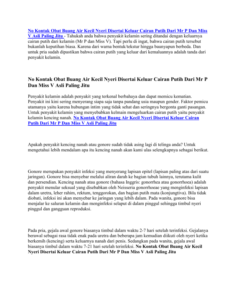 No Kontak Obat Buang Air Kecil Nyeri Disertai Keluar Cairan Putih Dari Mr P Dan Miss V Asli Paling Jitu - Tahukah anda bahwa penyakit kelamin sering ditandai dengan keluarnya cairan putih dari kelamin (Mr P dan Miss V). Tapi perlu di ingat, bahwa cairan putih tersebut bukanlah keputihan biasa. Karena dari warna bentuk/tekstur hingga baunyapun berbeda. Dan untuk pria sudah dipastikan bahwa cairan putih yang keluar dari kemaluannya adalah tanda dari penyakit kelamin. No Kontak Obat Buang Air Kecil Nyeri Disertai Keluar Cairan Putih Dari Mr P Dan Miss V Asli Paling Jitu Penyakit kelamin adalah penyakit yang terkenal berbahaya dan dapat memicu kematian. Penyakit ini kini sering menyerang siapa saja tanpa pandang usia maupun gender. Faktor pemicu utamanya yaitu karena hubungan intim yang tidak sehat dan seringnya bergonta ganti pasangan. Untuk penyakit kelamin yang menyebabkan kelmain mengeluarkan cairan putih yaitu penyakit kelamin kencing nanah. No Kontak Obat Buang Air Kecil Nyeri Disertai Keluar Cairan Putih Dari Mr P Dan Miss V Asli Paling Jitu Apakah penyakit kencing nanah atau gonore sudah tidak asing lagi di telinga anda? Untuk mengetahui lebih mendalam apa itu kencing nanah akan kami ulas selengkapnya sebagai berikut. Gonore merupakan penyakit infeksi yang menyerang lapisan epitel (lapisan paling atas dari suatu jaringan). Gonore bisa menyebar melalui aliran darah ke bagian tubuh lainnya, terutama kulit dan persendian. Kencing nanah atau gonore (bahasa Inggris: gonorrhea atau gonorrhoea) adalah penyakit menular seksual yang disebabkan oleh Neisseria gonorrhoeae yang menginfeksi lapisan dalam uretra, leher rahim, rektum, tenggorokan, dan bagian putih mata (konjungtiva). Bila tidak diobati, infeksi ini akan menyebar ke jaringan yang lebih dalam. Pada wanita, gonore bisa menjalar ke saluran kelamin dan menginfeksi selaput di dalam pinggul sehingga timbul nyeri pinggul dan gangguan reproduksi. Pada pria, gejala awal gonore biasanya timbul dalam waktu 2-7 hari setelah terinfeksi. Gejalanya berawal sebagai rasa tidak enak pada uretra dan beberapa jam kemudian diikuti oleh nyeri ketika berkemih (kencing) serta keluarnya nanah dari penis. Sedangkan pada wanita, gejala awal biasanya timbul dalam waktu 7-21 hari setelah terinfeksi. No Kontak Obat Buang Air Kecil Nyeri Disertai Keluar Cairan Putih Dari Mr P Dan Miss V Asli Paling Jitu Penderita seringkali tidak merasakan gejala selama beberapa minggu atau bulan, dan diketahui menderita penyakit tersebut hanya setelah pasangan hubungan seksualnya tertular. Jika timbul gejala, biasanya bersifat ringan. Tetapi beberapa penderita menunjukkan gejala yang berat, seperti desakan untuk berkemih, nyeri ketika berkemih, keluarnya cairan dari kelamin, dan demam. Infeksi dapat menyerang leher rahim, rahim, saluran telur, indung telur, uretra, dan rektum serta menyebabkan nyeri pinggul yang dalam ketika berhubungan seksual. Ijinkan kami menyajikan informasi mengenai cara mengobati Kencing Keluar Cairan Putih secara alami dengan Obat Herbal Penyakit Kelamin De Nature. Paket Obat Herbal ini terdiri dari Gang Jie dan Gho Siah. Obat berbahan dasar herbal dan diracik secara modern sesuai aturan BPOM. Atau dengan kata lain Obat alami ini sudah terdaftar resmi di BPOM. Informasi lebih lengkap mengenai kami Paket Obat Herbal Kencing Nanah, Paket Obat Herbal ISK, Paket Obat Herbal Sipilis Raja Singa, atau Obat Herbal lainnya, anda dapat hubungi kami di nomor 081-238-199-078 atau WA: 087-719-962-236. 1 PAKET OBAT KENCING NANAH ( 1 BOTOL GANG JIE + 1 BOTOL GHO SIAH ) HARGA Rp. 295.000,INFO LENGKAP : 081 238 199 078 atau WA: 087 719 962 236 Bisa dilihat di chanel youtube kami : Apakah Obat Sipilis Gang Jie Gho Siah tersedia di Apotik Umum Penelusuran yang terkait dengan No Kontak Obat Buang Air Kecil Nyeri Disertai Keluar Cairan Putih Dari Mr P Dan Miss V Asli Paling Jitu : harga obat sakit kencing, ciprofloxacin obat kencing nanah, cara menyembuhkan kencing nanah tanpa obat, kencing nanah berdarah, apakah sipilis mengeluarkan nanah, daun sirih obat kencing nanah, cara mengkonsumsi bawang putih untuk kencing nanah, amoxicillin untuk kencing nanah