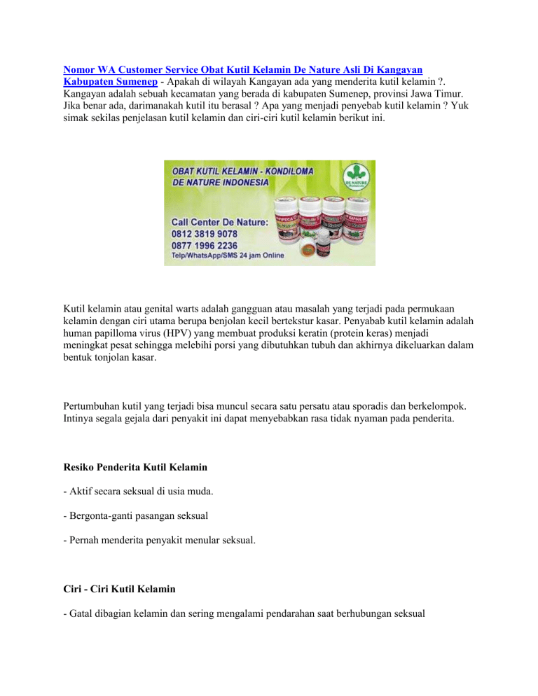 Nomor WA Customer Service Obat Kutil Kelamin De Nature Asli Di Kangayan Kabupaten Sumenep - Apakah di wilayah Kangayan ada yang menderita kutil kelamin ?. Kangayan adalah sebuah kecamatan yang berada di kabupaten Sumenep, provinsi Jawa Timur. Jika benar ada, darimanakah kutil itu berasal ? Apa yang menjadi penyebab kutil kelamin ? Yuk simak sekilas penjelasan kutil kelamin dan ciri-ciri kutil kelamin berikut ini. Kutil kelamin atau genital warts adalah gangguan atau masalah yang terjadi pada permukaan kelamin dengan ciri utama berupa benjolan kecil bertekstur kasar. Penyabab kutil kelamin adalah human papilloma virus (HPV) yang membuat produksi keratin (protein keras) menjadi meningkat pesat sehingga melebihi porsi yang dibutuhkan tubuh dan akhirnya dikeluarkan dalam bentuk tonjolan kasar. Pertumbuhan kutil yang terjadi bisa muncul secara satu persatu atau sporadis dan berkelompok. Intinya segala gejala dari penyakit ini dapat menyebabkan rasa tidak nyaman pada penderita. Resiko Penderita Kutil Kelamin - Aktif secara seksual di usia muda. - Bergonta-ganti pasangan seksual - Pernah menderita penyakit menular seksual. Ciri - Ciri Kutil Kelamin - Gatal dibagian kelamin dan sering mengalami pendarahan saat berhubungan seksual - Adanya bintik-bintik kutil dibagian kelamin - Kelamin yang membengkak dan berwarna keabu-abuan Gejala Penyakit Kutil Kelamin - Timbul ketidaknyamanan dalam melakukan hubungan seksual, serta mengurangi gairah seksual. - Merasa sakit pada saat melakukan hubungan seksual. - Merasakan gatal pada daerah alat kelamin yang terkena infeksi. - Untuk mengenali kutil dapat terlihat tampak merah, abu-abu atau merah muda. - Jika seorang wanita terserang penyakit ini, maka biasanya dapat dicirikan dengan peningkatan cairan vagina. Kutil kelamin mungkin sangat kecil dan datar sehingga tidak bisa dilihat dengan mata telanjang. Kadang-kadang, bagaimanapun, genital warts dapat berkembang biak menjadi kelompok besar. Nomor WA Customer Service Obat Kutil Kelamin De Nature Asli Di Kangayan Kabupaten Sumenep Komplikasi Kutil kelamin - Kanker - Masalah selama kehamilan Bisa dilihat di chanel youtube kami : Review Lengkap Aturan Pemakaian Obat Kutil Kelamin De Nature Yang Benar Pengiriman Herbal De Nature hanya 1 pintu yaitu dari Kantor Pusat De Nature (Majenang Cilacap Jawa Tengah). Kebijakan ini diambil untuk menjaga keaslian produk. - Obat Kutil Kelamin De Nature - Konsultasi dan Pemesanan silahkan hubungi kami di nomor kontak De Nature: 0812-38199078 atau 0877-1996-2236. Penelusuran yang terkait: de nature indonesia, testimoni de nature, cv de nature indonesia kabupaten cilacap jawa tengah