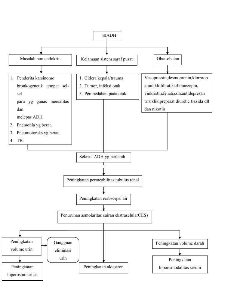 SIADH Masalah non endokrin Obat-obatan Kelamaan sistem saraf pusat 1. Cidera kepala/trauma Vasopressin,desmoprenin,klorprop bronkogenetik tempat sel- 2. Tumor, infeksi otak amid,klofibrat,karbomezepin, sel 3. Pembedahan pada otak vinkristin,fenatiazin,antidepresan 1. Penderita karsinomo paru yg ganas mensititas trisiklik,preparat diuretic tiazida dll dan dan nikotin melepas ADH. 2. Pnemonia yg berat. 3. Pneumotoraks yg berat. 4. TB TB Sekresi ADH yg berlebih Peningkatan permeabilitas tubulus renal Peningkatan reabsorpsi air Penurunan asmolaritas cairan ekstraselularCES) Peningkatan Gangguan volume urin eliminasi Peningkatan volume darah urin Peningkatan hiperosmolaritas urin Peningkatan Peningkatan aldestron hipoosmodalitas serum Peningkatan urin Reabsorpsi Na Hiponatremi delusinonal sodium Intoksisitas air Peningkatan osmolalitas serum Inhibisi ADH tidak terkontrol Iritabilitas Confusion Mual, muntah, anorexia Gangguan ketidakseimbangan Gangguan kelebihan volume cairan Disorientasi nutrisi kurang dari kebutuhan tubuh Gangguan pola pikir