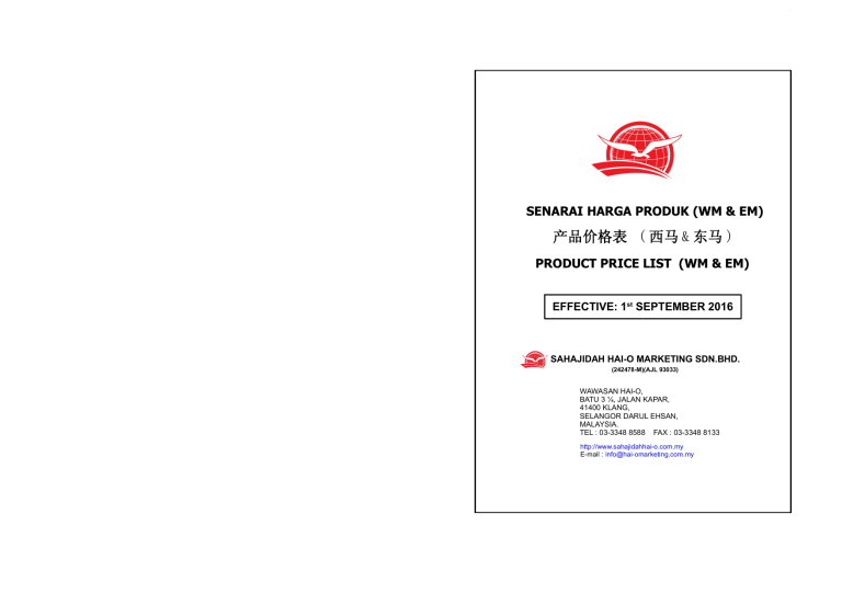 . SENARAI HARGA PRODUK (WM & EM) 产品价格表 ( 西马 & 东马 ) PRODUCT PRICE LIST (WM & EM) EFFECTIVE: 1st SEPTEMBER 2016 SAHAJIDAH HAI-O MARKETING SDN.BHD. (242478-M)(AJL 93033) WAWASAN HAI-O, BATU 3 ¼, JALAN KAPAR, 41400 KLANG, SELANGOR DARUL EHSAN, MALAYSIA. TEL : 03-3348 8588 FAX : 03-3348 8133 http://www.sahajidahhai-o.com.my E-mail : [email protected] 保健品 WM NUTRITION PRODUCTS EM 产品编号 产品 容量 分数 Code Product Content PV BV DP( RM ) CP( RM ) DP( RM ) CP( RM ) 80 tablets x 0.50g 37 24 37.00 44.00 39.00 46.00 60 capsules x 0.38g 198 149 198.00 238.00 200.00 240.00 60 capsules x 0.43g 110 82 110.00 132.00 112.00 134.00 400 tablets x 0.20g 110 57 110.00 132.00 112.00 134.00 500ml 74 35 74.00 89.00 79.00 94.00 120 softgels x 0.23g 128 79 128.00 153.00 130.00 155.00 6 pills x 5g 98 44 98.00 98.00 100.00 100.00 03008 海鸥蒜片 奖值 传销商价格 消费人价格 传销商价格 消费人价格 Hai-O Garlic 03018 妙丹活力钙 Miautan Enerplus 03052 有力杰 Eury Jack 03056 海鸥有机蓝藻 Hai-O Organic Spirulina 03073 宇宙原能浓缩紫花苜蓿 Bio Velocity Alfalfa Concentrated 03074 灌生金丹 NEW Celgynic Gold PM 360010 北京特制白凤丸 Beijing Te Zhi Bai Feng Wan 营养食品与饮料 FOOD & BEVERAGE 产品编号 产品 容量 分数 Code Product Content PV BV DP( RM ) CP( RM ) DP( RM ) CP( RM ) 200g 56 25 56.00 65.00 58.00 67.00 133 79 133.00 158.00 135.00 160.00 20 sachets x 25g 98 50 98.00 118.00 102.00 122.00 20 sticks x 12g 29 14 29.00 33.00 31.00 35.00 20 sachets x 15g 180 106 180.00 216.00 182.00 218.00 08038 海鸥生命竹盐烹调用盐 奖值 传销商价格 消费人价格 传销商价格 消费人价格 Hai-O Garam Buluh (Bamboo Salt) Premier Cooking Salt Powder 08039 海鸥生命竹盐饮品 40 sachets x 5g Hai-O Garam Buluh (Bamboo Salt) Premier Drink 08049 08050 ShakeMe Mixed Soybean with Bamboo Salt Drink 海鸥生命竹盐咖啡 NEW Min Kaffe 08046 BB Plus BB Plus Prices are subject to change without prior notice. 价格可在无须预告下调整. Price inclusive of 6% GST. 所有价格包含6%消费税. SEPT 2016/1 彩妆系列 WM 个人护理系列 EM COSMETIC SERIES WM EM PERSONAL CARE SERIES 产品编号 产品 容量 分数 产品编号 产品 容量 分数 奖值 Code Product Content PV BV DP( RM ) CP( RM ) DP( RM ) CP( RM ) Code Product Content PV BV DP( RM ) CP( RM ) DP( RM ) CP( RM ) 50ml 110 64 110.00 127.00 112.00 129.00 43002 Premium Beautiful 沐浴素 350ml 16 9 16.00 20.00 19.00 23.00 350ml 19 11 19.00 23.50 22.00 26.50 180ml 19 12 19.00 22.00 20.00 23.00 142 75 142.00 164.00 145.00 167.00 138 74 138.00 160.00 141.00 163.00 150 80 150.00 174.00 153.00 177.00 138 74 138.00 160.00 141.00 163.00 99 57 99.00 120.00 101.00 122.00 31 18 31.00 38.00 34.00 41.00 31 18 31.00 38.00 34.00 41.00 100g 18 11 18.00 22.00 21.00 25.00 50g 228 136 228.00 268.00 231.00 271.00 5 items / package 435 274 435.00 522.00 437.00 524.00 80ml 82 48 82.00 99.00 85.00 102.00 30ml 136 81 136.00 160.00 139.00 163.00 30ml 136 81 136.00 160.00 139.00 163.00 15ml 66 39 66.00 80.00 69.00 83.00 02703 Cozuma CC霜 奖值 传销商价格 消费人价格 传销商价格 消费人价格 Cozuma CC Cream 02740 Cozuma 雾面唇膏- Pandora Red Premium Beautiful Body Shampoo 1 unit 36 21 36.00 44.00 38.00 46.00 43003 Cozuma Mattifying Lipstick – Pandora Red 02741 Cozuma 雾面唇膏- Lolly Pink Cozuma 雾面唇膏- Rose I Love You 1 unit 36 21 36.00 44.00 38.00 46.00 43004 Cozuma 雾面唇膏- Berry-Me Femi 9 女性清洁剂 Femi 9 Intimate Wash 1 unit 36 21 36.00 44.00 38.00 46.00 43006 Cozuma Mattifying Lipstick – Rose I Love You 02743 Premium Beautiful 润肤素 Premium Beautiful Hand & Body Lotion Cozuma Mattifying Lipstick – Lolly Pink 02742 1 unit 36 21 36.00 44.00 38.00 Bio Seleza 卫生巾 ( 套装 ) Bio Seleza Feminine Pad – Premium Gift Set (Mixed) 46.00 Cozuma 雾面唇膏- Sensual Touch 1 unit 36 21 36.00 44.00 38.00 46.00 43011 Cozuma Mattifying Lipstick – Sensual Touch 02746 Cozuma 雾面唇膏- Cherry Bloom Cozuma 雾面唇膏- Fantasy Kiss 1 unit 36 21 36.00 44.00 38.00 46.00 43012 Cozuma 雾面唇膏- Romance Pink Bio Seleza 卫生巾 ( 日用 ) 6 packs / 60 pads Bio Seleza 卫生护垫 6 packs / 180 pads Bio Seleza Feminine Pad – Premium Gift Set ( Panty Liner) 1 unit 36 21 36.00 44.00 38.00 46.00 43013 Cozuma Mattifying Lipstick – Fantasy Kiss 02749 Night Safe 1 pack / 8pads Night Safe ( Extra Long) 1 pack / 8 pads Bio Seleza Feminine Pad – Premium Gift Set (Day Safe) Cozuma Mattifying Lipstick – Cherry Bloom 02748 Day Safe 2 packs / 20 pads Panty Liner 2 packs / 60 pads Cozuma Mattifying Lipstick – Berry Me 02745 传销商价格 消费人价格 传销商价格 消费人价格 Bio Seleza 卫生巾 ( 夜用 ) 6 packs / 48 pads Bio Seleza Feminine Pad – Premium Gift Set (Night Safe) 1 unit 36 21 36.00 44.00 38.00 46.00 47001 Marine Essence 美肤香皂 100g x 3 bars Cozuma Mattifying Lipstick – Romance Pink 02750 Cozuma 雾面唇膏- Glamour Cherry Marine Essence Beauty Bar 1 unit 36 21 36.00 44.00 38.00 46.00 47002 Cozuma Mattifying Lipstick – Glamour Cherry 02780 Cozuma 晶亮唇蜜- Tempting Rose 1 unit 36 21 36.00 44.00 38.00 46.00 47003 Cozuma Glitzy Shine Lip Gloss – Tempting Rose 02781 Cozuma 晶亮唇蜜- Pure Nude Cozuma 晶亮唇蜜- Fuchsia Blossom 1 unit 36 21 36.00 44.00 38.00 46.00 47004 Cozuma 晶亮唇蜜- Admirer Pink 1 unit 36 21 36.00 44.00 38.00 46.00 02802 Cozuma 晶亮唇蜜- Sugar Peach 250ml Marine Essence 竹盐牙膏 Bio - Ever Plus Bio - Ever Plus 1 unit 36 21 36.00 44.00 38.00 46.00 02810 Cozuma Glitzy Shine Lip Gloss – Admirer Pink 02784 Marine Essence 竹盐沐浴露 Marine Essence Bamboo Salt Toothpaste Cozuma Glitzy Shine Lip Gloss – Fuchsia Blossom 02783 250ml Marine Essence Bamboo Salt Nourishing Body Wash Cozuma Glitzy Shine Lip Gloss – Pure Nude 02782 Marine Essence 竹盐洗发素 Marine Essence Bamboo Salt Nourishing Shampoo LUMINEZ Brightening Skincare Set 
