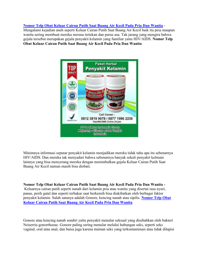 Nomor Telp Obat Keluar Cairan Putih Saat Buang Air Kecil Pada Pria Dan Wanita Mengalami kejadian aneh seperti Keluar Cairan Putih Saat Buang Air Kecil baik itu peia maupun wanita sering membuat mereka merasa tertekan dan purus asa. Tak jarang yang mengira bahwa gejala tersebut merupakan gejala penyakit kelamin yang familiar yaitu HIV/AIDS. Nomor Telp Obat Keluar Cairan Putih Saat Buang Air Kecil Pada Pria Dan Wanita Minimnya informasi seputar penyakit kelamin menjadikan mereka tidak tahu apa itu sebenarnya HIV/AIDS. Dan mereka tak menyadari bahwa sebenarnya banyak sekali penyakit kelmain lainnya yang bisa menyerang mereka dengan menimbulkan gejala Keluar Cairan Putih Saat Buang Air Kecil namun masih bisa diobati. Nomor Telp Obat Keluar Cairan Putih Saat Buang Air Kecil Pada Pria Dan Wanita Keluarnya cairan putih seperti nanah dari kelamin pria atau wanita yang disertai rasa nyeri, panas, perih gatal dan seperti terbakar saat berkemih bisa diakibatkan oleh berbagai faktor penyakit kelamin. Salah satunya adalah Gonore, kencing nanah atau sipilis. Nomor Telp Obat Keluar Cairan Putih Saat Buang Air Kecil Pada Pria Dan Wanita Gonore atau kencing nanah sendiri yaitu penyakit menular seksual yang disebabkan oleh bakteri Neiserria gonorrhoeae. Gonore paling sering menular melalui hubungan seks, seperti seks vaginal, oral atau anal, dan baisa juga karena mainan seks yang terkontaminasi atau tidak dilapisi dengan kondom baru tiap digunakan. Naasnya, bayi juga bisa terinfeksi saat proses kelahiran jika ibunya mengidap penyakit gonore dan umumnya menjangkiti mata bayi, hingga berpotensi mengakibatkan kebutaan permanen. Nomor Telp Obat Keluar Cairan Putih Saat Buang Air Kecil Pada Pria Dan Wanita Pengobatan Gonore meliputi pemberian antibiotik yang sesuai, baik dalam bentuk injeksi/suntikan maupun obat oral/tablet. Namun demikian, pengeluaran cairan putih dari kelamin yang disertai dengan nyeri saat berkemih dapat pula diakibatkan oleh penyebab yang lain, di antaranya adalah: - Infeksi saluran kemih/ISK - Klamidia - Trikomoniasis - Sipilis, dll Bisa dilihat di chanel youtube kami : Apakah Obat Sipilis Gang Jie Gho Siah tersedia di Apotik Umum Cara mengobati Gonore/Kencing Nanah - Infeksi Saluran Kemih (ISK) - Sipilis Klamidia - Trikomoniasis 1 PAKET OBAT KENCING NANAH ( 1 BOTOL GANG JIE + 1 BOTOL GHO SIAH ) HARGA Rp. 295.000,INFO LENGKAP : 081 238 199 078 atau WA: 087 719 962 236 Ijinkan kami memberikan informasi mengenai cara mengobati Kencing Keluar Cairan Putih secara alami dengan Obat Herbal Penyakit Kelamin De Nature. Paket Obat Herbal ini terdiri dari Gang Jie dan Gho Siah. Obat berbahan dasar herbal dan diracik secara modern sesuai aturan BPOM. Atau dengan kata lain Obat alami ini sudah terdaftar resmi di BPOM. Informasi lebih lengkap mengenai kami Paket Obat Herbal Kencing Nanah, Paket Obat Herbal ISK, Paket Obat Herbal Sipilis Raja Singa, atau Obat Herbal lainnya, anda dapat hubungi kami di nomor 081-238-199-078 atau WA: 087-719-962-236. Penelusuran yang terkait dengan Nomor Telp Obat Keluar Cairan Putih Saat Buang Air Kecil Pada Pria Dan Wanita : cairan putih yang keluar setelah buang air kecil disebut, penyebab kencing sakit dan keluar cairan putih, keluar darah campur lendir saat buang air kecil, cara mengobati kencing sakit dan keluar cairan putih secara alami, obat kencing sakit dan keluar cairan putih, kencing keluar sperma tapi tidak sakit, kencing keluar seperti pasir, endapan putih pada urine
