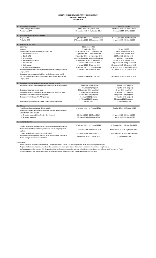 SEKOLAH TINGGI ILMU KESEHATAN INDONESIA MAJU KALENDER AKADEMIK TA 2018/2019 A. Registrasi Administrasi 1 Daftar ulang mahasiswa baru 2 Pembayaran SPP B. Registrasi Akademik (Pengisian KRS)* 1 Pengisian KRS 2 Perbaikan KRS C. 1 2 3 Perkuliahan dan Ujian Open House Inagurasi Kegiatan perkuliahan dan ujian (UTS dan UAS) a. Perkuliahan sesi 1 - 7 b. Sesi 8 (UTS) c. UTS susulan d. Perkuliahan sesi 9 - 15 e. Sesi 16 (UAS) f. UAS susulan g. Praktek Belajar Lapangan 4 Batas akhir penyerahan nilai ujian semester oleh dosen (kecuali PBL, Skripsi, Tesis) 5 Batas akhir pengunggahan (publish ) nilai ujian semester ganjil 2017/2018 kedalam ruang mahasiswa di web STIKIM (kecuali PBL, Skripsi, Tesis) D. Batas akhir penetapan kelulusan dan pendaftaran wisuda 1 Batas akhir pendaftaran ujian/penyerahan tugas akhir/skripsi/tesis 2 Batas akhir sidang proposal tesis 3 Batas akhir sidang tugas akhir/skripsi/tesis untuk diikutkan pada penetapan kelulusan semester berjalan 4 Batas akhir revisi tugas akhir/skripsi/tesis 5 Rapat penetapan kelulusan tingkat Departemen (yudisium) E. Wisuda 1 Pendaftaran dan pembayaran biaya wisuda 2 Pemberian selamat wisudawan/wati oleh Ketua STIKIM dan Kepala Departemen, serta Wisuda: a. Program Sarjana (Kelas Reguler dan Ekstensi) b. Program Magister F. Semester pendek 1 Periode pengusulan mata kuliah SP dari mahasiswa ke Departemen 4 Pelaksanaan pembayaran biaya pendidikan sesuai dengan jumlah tagihan 5 Periode perkuliahan (termasuk periode ujian) 6 Batas akhir pengunggahan (publish ) nilai ujian semester pendek ke dalam ruang mahasiswa di web STIKIM Semester Ganjil 8 Mei 2018 - 31 Agustus 2018 18 Agustus 2018 - 9 September 2018 Semester Genap 8 Oktober 2018 - 10 Januari 2019 28 Januari 2019 - 3 Maret 2019 1 September 2018 - 16 September 2018 17 September 2018 - 23 September 2018 25 Februari 2019 - 10 Maret 2019 11 Maret 2019 - 17 Maret 2019 1 September 2018 15 September 2018 17 September 2018 - 3 Februari 2019 17 September 2018 - 4 November 2018 5 November 2018 - 18 November 2018 19 November 2018 - 25 November 2018 19 November 2018 - 13 Januari 2019 14 Januari 2019 - 27 Januari 2019 28 Januari 2019 - 3 Februari 2019 4 Februari 2019 - 17 Februari 2019 28 Januari 2019 - 3 Februari 2019 10 Maret 2019 11 Maret 2019 - 12 Mei 2019 11 Maret 2019 - 12 Mei 2019 13 Mei 2019 - 26 Mei 2019 27 Mei 2019 - 2 Juni 2019 17 Juni 2019 - 4 Agustus 2019 5 Agustus 2019 - 18 Agustus 2019 19 Agustus 2019 - 25 Agustus 2019 26 Agustus 2019 - 8 September 2019 19 Agustus 2019 - 25 Agustus 2019 4 Februari 2019 - 8 Februari 2019 26 Agustus 2019 - 30 Agustus 2019 22 Desember 2018 (sarjana) 16 Februari 2019 (magister) 29 Desember 2018 (magister) 29 Desember 2018 (sarjana) 10 Februari 2019 (magister) 26 Januari 2019 (sarjana) 20 Februari 2019 (magister) 6 Maret 2019 17 Agustus 2019 (sarjana) 17 Agustus 2019 (sarjana) 15 Juni 2019 (magister) 24 Agustus 2019 (sarjana) 24 Agustus 2019 (magister) 30 Agustus 2019 (sarjana) 30 Agustus 2019 (magister) 12 September 2020 1 Oktober 2018 - 28 Februari 2019 1 Oktober 2019 - 29 Februari 2020 20 Maret 2019 - 21 Maret 2019 20 Maret 2019 - 21 Maret 2019 25 Maret 2020 - 26 Maret 2020 25 Maret 2020 - 26 Maret 2020 9 Februari 2019 - 13 Februari 2019 31 Agustus 2020 - 3 September 2020 14 Februari 2019 - 18 Februari 2019 4 September 2020 - 6 September 2020 19 Februari 2019 - 27 Februari 2019 7 September 2020 - 11 September 2020 28 Februari 2019 - 2 Maret 2019 11 September 2020 Keterangan : * Proses registrasi akademik on line melalui portal mahasiswa di web STIKIM (hanya dapat dilakukan setelah pembayaran) Registrasi administrasi dan akademik setelah batas akhir masa registrasi akan dikenakan denda sesuai ketentuan yang berlaku Mahasiswa yang tidak mengisi KRS dinyatakan tidak aktif pada semester berjalan dan diwajibkan mengajukan permohonan aktif kembali ke Prodi Mahasiswa yang tidak melakukan registrasi selama 3 semester berturut-turut dinyatakan mengundurkan diri