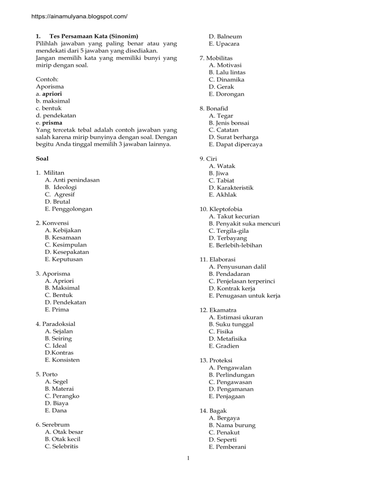 https://ainamulyana.blogspot.com/ 1. Tes Persamaan Kata (Sinonim) Pilihlah jawaban yang paling benar atau yang mendekati dari 5 jawaban yang disediakan. Jangan memilih kata yang memiliki bunyi yang mirip dengan soal. D. Balneum E. Upacara 7. Mobilitas A. Motivasi B. Lalu lintas C. Dinamika D. Gerak E. Dorongan Contoh: Aporisma a. apriori b. maksimal c. bentuk d. pendekatan e. prisma Yang tercetak tebal adalah contoh jawaban yang salah karena mirip bunyinya dengan soal. Dengan begitu Anda tinggal memilih 3 jawaban lainnya. 8. Bonafid A. Tegar B. Jenis bonsai C. Catatan D. Surat berharga E. Dapat dipercaya Soal 9. Ciri A. Watak B. Jiwa C. Tabiat D. Karakteristik E. Akhlak 1. Militan A. Anti penindasan B. Ideologi C. Agresif D. Brutal E. Penggolongan 10. Kleptofobia A. Takut kecurian B. Penyakit suka mencuri C. Tergila-gila D. Terbayang E. Berlebih-lebihan 2. Konvensi A. Kebijakan B. Kesamaan C. Kesimpulan D. Kesepakatan E. Keputusan 11. Elaborasi A. Penyusunan dalil B. Pendadaran C. Penjelasan terperinci D. Kontrak kerja E. Penugasan untuk kerja 3. Aporisma A. Apriori B. Maksimal C. Bentuk D. Pendekatan E. Prima 12. Ekamatra A. Estimasi ukuran B. Suku tunggal C. Fisika D. Metafisika E. Gradien 4. Paradoksial A. Sejalan B. Seiring C. Ideal D.Kontras E. Konsisten 13. Proteksi A. Pengawalan B. Perlindungan C. Pengawasan D. Pengamanan E. Penjagaan 5. Porto A. Segel B. Materai C. Perangko D. Biaya E. Dana 14. Bagak A. Bergaya B. Nama burung C. Penakut D. Seperti E. Pemberani 6. Serebrum A. Otak besar B. Otak kecil C. Selebritis 1 https://ainamulyana.blogspot.com/ 15. Tangkal A. Cegah B. Tak mempan C. Lelang D. Rangkul E. Mempan B. Sulit C. Mutakhir D. Kompleks E. Sukar 24: Otodidak A. Rehabilitasi kerusakan tulang B. Cara belajar mandiri C. Pendidikan luar biasa D. Cara mengajar tuna grahita E. Maju dengan belajar sendiri 16. Virtual A. Hiponema B. Maya C. Nyata D. Virgin E. Impian 25. Latif A. Atraktif B. Bersahaja C. Aktif D. Natural E. Indah 17. Friski A. Kasar B. Licin C. Desakan D. Sedih E. Tidak berdaya 26. Gaji A. Honor B. Bonus C. Tunjangan D. Pekerjaan E. Pencaharian 18. Hukuman A. Aturan B. Penjara C. Denda D. Delik aduan E. Larangan 27. Registrasi A. Jadwal ulang B. Pengaturan C. Registered D. Pendaftaran kembali E. Pendaftaran 19. Hibrida A. Cepat berbuah B. Tanaman rendah C. Cangkokan D. Antar tanaman E. Bibit unggul 28. Boga A. Makanan nikmat B. Resep C. Menu D. Pakaian pengantin E. Pakaian kebesaran 20. Residu A. Reduksi B. Remisi C. Sisa D. Ampas E. Hasil 29. Eklips A. Gerhana B. Penjepit buku C. Garis kathulistiwa D. Gaya gravitasi E. Lonjong 21. Akurat A. Ralat B. Saksama C. Selidik D. Limit E. Aproksimasi 30. Mukjizat A. Takjub B. Barakah C. Karamah D. Safaat E. Ashifa 22. Class A. State B. Kamar C. Tingkatan D. Ruangan E. Group 31. Dedikasi A. Track record B. Pengabdian C. Pengampunan 23. Canggih A. Asophisticated 2 https://ainamulyana.blogspot.com/ D. Karier E. Pekerjaan 40. Kontras A. Perpecahan B. Tidak suram C. Jelas D. Cerah E. Perbedaan nyata 32. Provokasi A. Menakut-nakuti B. Adu domba C. Pancingan D. Mengundang musuh E. Promoter 41. Eksodus A. Penampungan B. Pengusiran C. Penguatan D. Perampingan E. Sisi miring 33. Delusi A. Kekecewaan B. Khawatir C. Ilusi D. Friksi E. Nyata 42. Iterasi A. Interaksi B. Identifkasi C. Hubungan D. Perulangan E. Sublimasi 34. Bulat A. Bola B. Lingkaran C. Bundar D. Lonjong E. Oval 43. Ambiguitas A. Makna lugas B. Denotasi C. Gamblang D. Harfiah E. Makna ganda 35. Alternatif A. Cara lain B. Prosedur pemecahan C. Prinsip dasar D. Alur utama E. Pedoman 44. Bibliografi A. Daftar pusaka B. Biografi C. Otobiografi D. Taman pustaka E. Daftar grafik 36. Bonanza A. Peternakan B. Perayaan C. Judul sinetron D. Daerah subur E. Sumber kesenangan 45. Insinuasi A. Memaki B. Sinis C. Intuisi D. Halusinasi E. Sindiran 37. Zenit A. Bintang B. Langit C. Puncak D. Batu E. Jenis batu 46. Tuna grahita A. Cacat mental B. Tidak mengetahui C. Cacat tubuh D. Tak bergairah E. Tuli 38. Koordinator A. Bos B. Ayah C. Ketua D. Kepala E. Manajer 47. Negosiasi A. Musyawarah B. Perundingan C. Kongres D. Konferensi E. Damai 39. Ekskavasi A. Tangga elevator B. Penggalian C. Pertolongan D. Kemauan E. Pengangkutan 48. Evokasi A. Penyelamatan 3 https://ainamulyana.blogspot.com/ B. Evakuasi C. Penggugah rasa D. Provokasi E. Perasaan D. Hak bertanya E. Hak anggaran 57. Galat A. Batas hitungan B. Keliru C. Cacat D. Pendekatan E. Hitungan 49. Bubut A. Urut B. Potong C. Cabut D. Asah E. Poles 58. Genjah A. Panen massal B. Keserasian habitat C. Kesamaan gen D. Cepat ditanam E. Cepat berbuah 50. Algoritma A. Alternatif B. Prosedur pemecahan C. Aritmatika D. Irama nada E. Software 59. Hayati A. Menjiwai B. Meresapi C. Biologi D. Botani E. Hidup 51. Insomnia A. Istirahat B. Tak bisa duduk C. Tak bisa tidur D. Tak bisa istirah E. Tidur 60. Donasi A. Peranan B. Distribusi C. Bantuan D. Kontribusi E. Dana 52. Promovendus A. Pengajuan proposal B. Calon magister C. Calon doktor D. Promotor E. Teknologi tepat guna 61. Kampiun A. Ahli B. Juara C. Bintang D. Terbaik E. Lampion 53. Delik A. Sembunyi B. Duplik C. Pelanggaran hukum D. Kasus kriminal E. Tindakan susila 62. Bonus A. Tunjangan B. Diskon C. Bantuan D. Premi E. Hadiah 54. Distorsi A. Non deskriptis B. Penyalahgunaan C. Kesalahpahaman D. Pengurangan E. Penyimpangan 63. Izin A. Niscaya B. Mesti C. Hak D. Biar E. Wenang 55. Promosi A. Perkenalan B. Pemasaran C. Kenaikan pangkat D. Iklan E. Propaganda 64. Identitas A. Jasmani B. Ciri-ciri C. Tauladan D. Sidik jari E. Gambar 56. Interpelasi A. Penyisipan kata B. Antarsistem C. Interpretasi 4 https://ainamulyana.blogspot.com/ 65.DESKRIPSI A. Pembatalan skripsi B. Pemahaman naskah C. Pelukisan D. Penanaman modal E. Pemangkasan 73. AGUNAN A. Target B. Menggunakan C. Jaminan D. Pagu E. Andalan 66. EKUILIBRIUM A. Ekuivalensi B. Keseragaman C. Mata rantai D. Kesamaan kebebasan E. Keseimbangan 74. BIOGRAFI A. Ilmu perpustakaan B. Sumber bacaan C. Daftar pustaka D. Riwayat hidup E. Acuan laporan