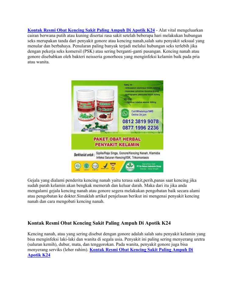 Kontak Resmi Obat Kencing Sakit Paling Ampuh Di Apotik K24 - Alat vital mengeluarkan cairan berwana putih atau kuning disertai rasa sakit setelah beberapa hari melakukan hubungan seks merupakan tanda dari penyakit gonore atau kencing nanah,salah satu penyakit seksual yang menular dan berbahaya. Penularan paling banyak terjadi melalui hubungan seks terlebih jika dengan pekerja seks komersil (PSK) atau sering berganti-ganti pasangan. Kencing nanah atau gonore disebabkan oleh bakteri neisseria gonorhoea yang menginfeksi kelamin baik pada pria atau wanita. Gejala yang dialami penderita kencing nanah yaitu terasa sakit,perih,panas saat kencing jika sudah parah kelamin akan bengkak memerah dan keluar darah. Maka dari itu jika anda mengalami gejala kencing nanah atau gonore segera melakukan pengobatan baik secara alami atau pengobatan ke dokter.Simaklah artikel penjelasan berikut ini mengenai penyakit kencing nanah dan cara mengobati kencing nanah. Kontak Resmi Obat Kencing Sakit Paling Ampuh Di Apotik K24 Kencing nanah, atau yang sering disebut dengan gonore adalah salah satu penyakit kelamin yang bisa menginfeksi laki-laki dan wanita di segala usia. Penyakit ini paling sering menyerang uretra (saluran kemih), dubur, mata, dan tenggorokan. Pada wanita, penyakit gonore juga bisa menyerang serviks (leher rahim). Kontak Resmi Obat Kencing Sakit Paling Ampuh Di Apotik K24 Penyebab Gonore Penyebab penyakit gonore adalah bakteri Neisseria Gonorrhoeae yang biasanya ditemukan di cairan penis dan alat vital wanita dari orang yang terkena infeksi tersebut. Itulah mengapa bakteri tersebut bisa menyebar dari satu orang ke orang lain melalui hubungan seksual. Inilah Tanda Dan Gejala Penyakit Kencing Nanah Atau Gonore Yang Umum Terjadi Gejala Yang Umum Dirasakan Pria ⇒ Buang Air Kecil Jadi Lebih Sering ⇒ Keluarnya nanah dari Mr P, biasanya berupa tetesan cairan yang berwarna putih, kuning, krem ataupun sedikit berwarna hijau. ⇒ Mengalami pembengkakan dan juga kemerahan pada bukaan ataupun kulup Mr P ⇒Terasa nyeri dan juga menyalami bengkak pada testis. ⇒ Merasakan radang tenggorokan secara terus menurus dan dalam waktu yang cukup lama. Gejala Yang Umum Dirasakan Wanita ⇒ Saat buang air kecil akan terasa sedikit nyeri dan juga panas. ⇒ Frekuensi untuk buang air kecil pun dapat meningkat ⇒ Keluarnya carian dari vagina, cairan yang dimaksud bisa menyerupai krim namun berair dan sedikit kehijauan ⇒ Bukan pada periode menstruasi, akan tetapi kamu bisa mengalami perdarahan ataupun adanya bercak darah ⇒ Rasa nyeri pada perut bagian bawah dan juga panggul seperti saat mengalami dismenore saat menstruasi ⇒ Merasa nyeri saat berhubungan dengan pasangan ⇒ Mengalami pembengkakkan pada vulva ⇒ Demam tinggi secara terur menerus Bisa dilihat di chanel youtube kami : Apakah Obat Sipilis Gang Jie Gho Siah tersedia di Apotik Umum Beberapa gejala diatas biasanya sering dirasakan oleh penderita penyakit Kencing Nanah , Perlu anda ketahui bahwa penyakit kencing nanah yang terus dibiarkan akan membahayakan kondisi kesehatan anda. Oleh sebab itu, Penyakit kencing nanah harus segera cepat ditangani agar tidak bertambah parah. Ijinkan kami memberikan informasi mengenai cara mengobati Kelamin Keluar Cairan Putih secara alami dengan Obat Herbal Penyakit Kelamin De Nature. Paket Obat Herbal ini terdiri dari Gang Jie dan Gho Siah. Obat berbahan dasar herbal dan diracik secara modern sesuai aturan BPOM. Atau dengan kata lain Obat alami ini sudah terdaftar resmi di BPOM. Informasi lebih lengkap mengenai kami Paket Obat Herbal Kencing Nanah, Paket Obat Herbal ISK, Paket Obat Herbal Sipilis Raja Singa, atau Obat Herbal lainnya, anda dapat hubungi kami di nomor 081-238-199-078 atau WA: 087-719-962-236. Penelusuran yang terkait dengan Kontak Resmi Obat Kencing Sakit Paling Ampuh Di Apotik K24 : obat sipilis di apotik k24, obat nanah di apotik, jual obat kencing nanah, biaya obat kencing nanah, efek samping obat kencing nanah, obat sipilis di apotik untuk wanita, obat klamidia di apotik, harga obat penicilin di apotik