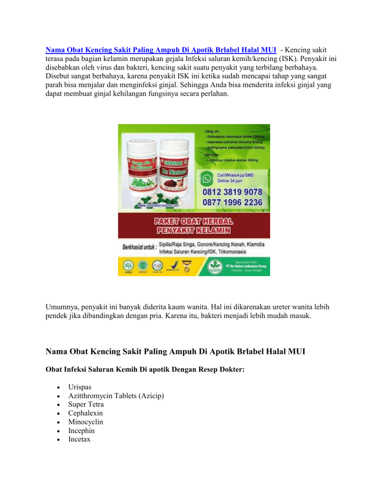 Nama Obat Kencing Sakit Paling Ampuh Di Apotik Brlabel Halal MUI - Kencing sakit terasa pada bagian kelamin merupakan gejala Infeksi saluran kemih/kencing (ISK). Penyakit ini disebabkan oleh virus dan bakteri, kencing sakit suatu penyakit yang terbilang berbahaya. Disebut sangat berbahaya, karena penyakit ISK ini ketika sudah mencapai tahap yang sangat parah bisa menjalar dan menginfeksi ginjal. Sehingga Anda bisa menderita infeksi ginjal yang dapat membuat ginjal kehilangan fungsinya secara perlahan. Umumnya, penyakit ini banyak diderita kaum wanita. Hal ini dikarenakan ureter wanita lebih pendek jika dibandingkan dengan pria. Karena itu, bakteri menjadi lebih mudah masuk. Nama Obat Kencing Sakit Paling Ampuh Di Apotik Brlabel Halal MUI Obat Infeksi Saluran Kemih Di apotik Dengan Resep Dokter: Urispas Azitthromycin Tablets (Azicip) Super Tetra Cephalexin Minocyclin Incephin Incetax Itulah obat yang bisa Anda gunakan untuk mengatasi permasalahan saluran kemih. Akan tetapi apabila Anda ingin memakai obat yang telah dijelaskan diatas maka harus berkonsultasi terlebih dahulu ke dokter, dikarenakan bisa menyebabkan efek samping yang berbahaya. Yang bilamana dikonsumsi dalam jangka waktu panjang maka akan merusak kesehatan organ tubuh bagian dalam. Nama Obat Kencing Sakit Paling Ampuh Di Apotik Brlabel Halal MUI Penyebab Infeksi Saluran Kemih Sebagian besar kasus ISK disebabkan oleh bakteri Escherichia coli atau E, coli yang umumnya hidup di dalam saluran cerna, Bakteri ini masuk ke dalam saluran uretra seseorang ketika kurang baik dalam melakukan pembersihan setelah buang air besar maupun kecil, Misalnya pada saat kertas toilet yang dia gunakan untuk membersihkan anus turut menyentuh organ kelaminnya, Maka bakteri dapat masuk ke saluran kemih. Dalam kasus seperti ini wanita lebih rentan terkena ISK, Karena jarak uretra dengan anus pada tubuh mereka lebih dekat dan pintu uretra yang dekat dengan kandung kemih. Penjelasan beberapa penyebab kencing sakit atau Infeksi Saluran Kemih: Keberadaan bakteri Escherichia coli ini ada pada usus dan juga ada pada saluran pencernaan. Nyatanya pada saat buang air besar (BAB) yang dinamakan bakteri Escherichia Coli ini akan terbuang, apabila setelah buang air besar kurang efektip dalam membersihkannya maka yang terjadi bakteri tersebut akan masuk dan menginfeksi pada saluran kemih.Kondisi inilah yang membuat wanita lebih dominan terserang infeksi saluran kencing dan memang pada dasarnya jarak uretra pada wanita berdekatan dengan anus. Kebiasaan cebok yang salah, yaitu membasuh vagina dari belakang ke depan. Ini perlu dihindari karena dapat membuat bakteri masuk dan menyebabkan infeksi pada saluran kencing. Untuk cara cebok yang benar, lakukan dari depan ke belakang, atau dari vagina ke arah dubur Sering telat mengganti panty liner. Nama Obat Kencing Sakit Paling Ampuh Di Apotik Brlabel Halal MUI Bergantian menggunakan celana dalam dengan orang yang menderita penyakit ISK Menggunakan celana dalam saat kondisi vagina masih basah yang menyebabkan jamur mudah berkembang biak Sering bergonta ganti pasangan sex (free sex) Penggunaan kondom saat berhubungan badan. Tapi penggunaan kondom juga dianjurkan untuk mengurangi dampak penularan penyakit seksual Sering melakukan seks oral atau melakukan sex lewat mulut Memiliki daya tahan tubuh yang lemah, misalnya karena terlalu cape bekerja atau kurang mendapatkan nutrisi yang cukup dari makanan Gejala Infeksi Saluran Kemih Bagian atas: Demam dengan suhu tinggi lebih dari 38º C, Menggigil tak terkendali, Rasa mual ingin muntah, Bahkan sampai muntah, Buang air besar encer (diare), Nyeri pada perut bagian bawah, Gejala Infeksi Saluran Kemih Bagian Bawah: Sindrom uretra: Sering buang air kecil atau dorongan ingin selalu buang air kecil, Rasa nyeri tumpul yang konstan pada daerah kemaluan, Nyeri saat buang air kecil (disuria), Air seni berawan atau bahkan ada darah dalam urin (hematuria), Air seni berbau tak sedap, Sakit punggung, Secara umum merasa tidak sehat,Nama Obat Kencing Sakit Paling Ampuh Di Apotik Brlabel Halal MUI Cara Mencegah Infeksi Saluran Kemih Anda dapat mengambil langkah-langkah untuk mengurangi risiko infeksi saluran kemih dengan cara: Banyak minum cairan, terutama air putih, Minum air membantu mengencerkan urin, Dan memastikan bahwa Anda akan buang air kecil lebih sering sehingga bakteri akan diusir dari saluran kemih, Saat cebok, usap dari depan ke belakang, Melakukannya setelah buang air kecil dan setelah buang air besar membantu mencegah bakteri dari anus menyebar ke vagina dan uretra, Buang air kecil segera setelah ‘berhubungan’, Hindari produk feminin seperti douche dan bubuk, di daerah genital yang dapat mengiritasi uretra, Jangan suka menahan kencing Bahaya Terjadi Akibat Infeksi Saluran Kencing / Kemih Antara lain : Menyebabkan ketidak suburannya organ reproduksi Timbul rasa nyeri pada bagian kemaluan Sulitnya berhubungan intim Apabila infeksi saluran kemih terjadi pada pria maka akan menyebabkan sperma encer Dapat menginfeksi pula ke ginjal dan ginjal akan mengalami kerusakan Bila infeksi saluran kemih terjadi pada ibu hamil maka akan melahirkan bayi prematur Terjadinya penyempitan uretra pada pria, Nama Obat Kencing Sakit Paling Ampuh Di Apotik Brlabel Halal MUI Obat Infeksi Saluran Kemih / kencing sakit Resep antibiotik akan bervariasi pada pria dan wanita, Pria dianjurkan untuk minum antibiotik selama tujuh sampai empat belas hari, Sementara wanita dianjurkan minum obat antibiotik cukup selama 3 sampai 5 hari, Habiskanlah setiap obat antibiotik yang diberikan dokter, Atau sesuai petunjuk dokter agar bakteri benar-benar musnah dan Anda bisa sembuh total tanpa kekambuhan, jika pengobatan yang di lakukan belum ada hasil kesembuhan, Mungkin anda bisa lakukan alternatif berikut ini SOLUSI PENGOBATAN HERBAL KENCING SAKIT/INFEKSI SALURAN KEMIH DENGAN OBAT ASLI DE NATURE De Nature Indonesia adalah sebuah perusahaan yang bergerak di bidang Obat Tradisional (OT) dari dalam Negeri, yang mencoba mengan