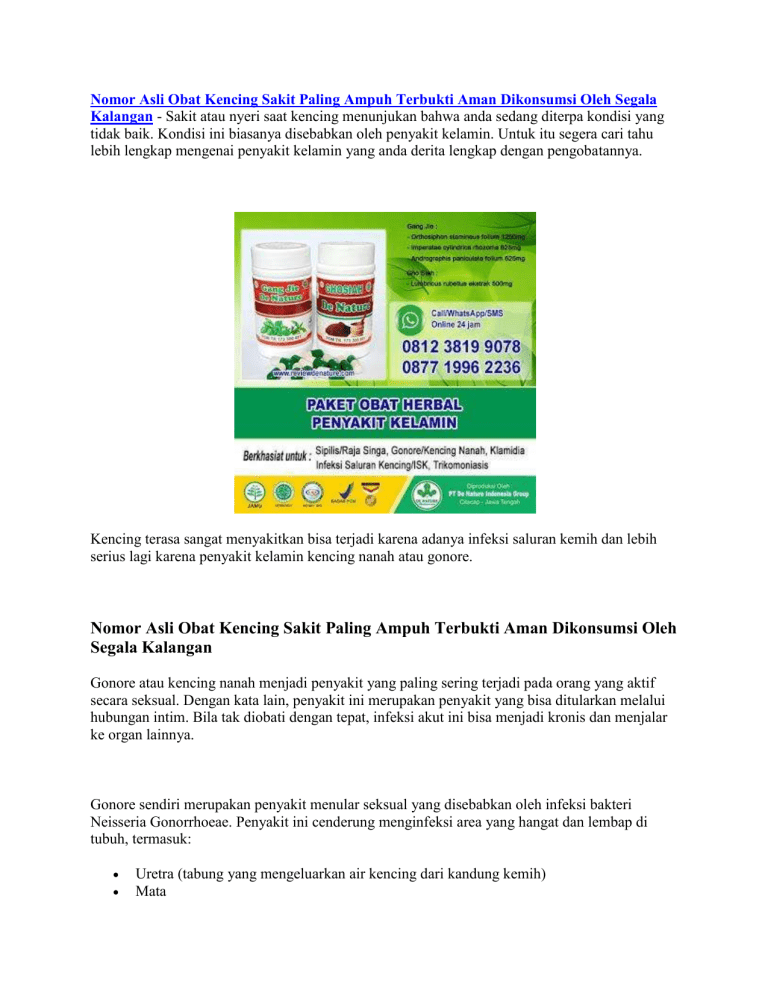 Nomor Asli Obat Kencing Sakit Paling Ampuh Terbukti Aman Dikonsumsi Oleh Segala Kalangan - Sakit atau nyeri saat kencing menunjukan bahwa anda sedang diterpa kondisi yang tidak baik. Kondisi ini biasanya disebabkan oleh penyakit kelamin. Untuk itu segera cari tahu lebih lengkap mengenai penyakit kelamin yang anda derita lengkap dengan pengobatannya. Kencing terasa sangat menyakitkan bisa terjadi karena adanya infeksi saluran kemih dan lebih serius lagi karena penyakit kelamin kencing nanah atau gonore. Nomor Asli Obat Kencing Sakit Paling Ampuh Terbukti Aman Dikonsumsi Oleh Segala Kalangan Gonore atau kencing nanah menjadi penyakit yang paling sering terjadi pada orang yang aktif secara seksual. Dengan kata lain, penyakit ini merupakan penyakit yang bisa ditularkan melalui hubungan intim. Bila tak diobati dengan tepat, infeksi akut ini bisa menjadi kronis dan menjalar ke organ lainnya. Gonore sendiri merupakan penyakit menular seksual yang disebabkan oleh infeksi bakteri Neisseria Gonorrhoeae. Penyakit ini cenderung menginfeksi area yang hangat dan lembap di tubuh, termasuk: Uretra (tabung yang mengeluarkan air kencing dari kandung kemih) Mata Tenggorokan Miss V Dubur Saluran reproduksi wanita (saluran tuba, leher rahim, dan rahim) Gonore berpindah dari orang ke orang melalui seks oral, anal, ataupun vaginal tanpa kondom. Orang-orang dengan banyak pasangan seksual atau mereka yang tidak menggunakan kondom memiliki risiko infeksi terbesar. Nomor Asli Obat Kencing Sakit Paling Ampuh Terbukti Aman Dikonsumsi Oleh Segala Kalangan Perlindungan terbaik terhadap infeksi adalah hubungan intim dengan hanya satu orang dan penggunaan kondom yang tepat. Perilaku yang membuat seseorang lebih cenderung melakukan hubungan intim tanpa kondom juga meningkatkan kemungkinan infeksi. Perilaku ini termasuk penyalahgunaan alkohol dan obat-obatan terlarang. Gejala gonore biasanya terjadi dalam 2 hingga 14 hari setelah terpapar. Namun, beberapa orang yang terinfeksi gonore tidak pernah mengalami gejala yang nyata. Penting untuk diingat bahwa seseorang dengan kencing nanah yang tidak memiliki gejala juga berisiko. Seseorang lebih mungkin menyebarkan infeksi ke pasangan lain ketika mereka tidak memiliki gejala yang nyata. Gejala Penyakit Kencing Nanah Pada pria, gejala awal penyakit kencing nanah biasanya timbul dalam waktu 2-7 hari setelah terinfeksi. Gejalanya berawal dengan rasa tidak nyaman pada uretra dan beberapa jam kemudian diikuti oleh nyeri ketika buang air kecil serta keluarnya nanah dari penis. Sedangkan pada wanita, gejala awal biasanya timbul waktu 7-21 hari setelah terinfeksi. Penderita seringkali tidak merasakan gejala selama beberapa minggu atau bulan, dan diketahui menderita penyakit tersebut hanya setelah pasangan hubungan seksualnya tertular. Jika penyakit kencing nanah menimbulkan gejala, biasanya bersifat ringan dan mendadak hilang dengan sendirinya. Tetapi beberapa penderita menunjukkan gejala yang berat, seperti desakan untuk berkemih, nyeri ketika berkemih, keluarnya cairan dari vagina, dan demam. Infeksi dapat menyerang leher rahim, rahim, saluran telur, indung telur, uretra, dan rektum serta menyebabkan nyeri pinggul yang dalam ketika berhubungan seksual. Wanita dan pria homoseksual yang melakukan hubungan seks melalui anus (anal sex) dapat menderita gonore pada rektumnya, biasanya penderita kencing nanah akan merasakan tidak nyaman di sekitar anusnya dan dari rektumnya keluar cairan. Daerah di sekitar anus tampak merah dan kasar, serta tinjanya terbungkus oleh lendir dan nanah. Hubungan seksual melalui mulut (oral sex) dengan seseorang penderita gonore biasanya akan menyebabkan gonore pada tenggorokan (faringitis gonokokal), umumnya infeksi tersebut tidak menimbulkan gejala namun kadang-kadang menyebabkan nyeri tenggorokan dan gangguan untuk menelan. Jika cairan yang terinfeksi mengenai mata, maka bisa menyebabkan terjadinya infeksi mata luar (konjungtivitis gonore). Bayi yang baru lahir juga bisa terinfeksi gonore dari ibunya selama proses persalinan sehingga terjadi pembengkakan pada kedua kelopak matanya dan dari matanya keluar nanah. Jika infeksi itu tidak diobati, maka akan menimbulkan kebutaan. Bisa dilihat di chanel youtube kami : Apakah Obat Sipilis Gang Jie Gho Siah tersedia di Apotik Umum Pengobatan gonore Pengobatan gonore umumnya menggunakan antibiotik. Nmaun hati hati karena bakteri neisseria mulai resisten dan mungkin akan kebal pada berbagai antibiotik saat ini. Misalnya, sudah terdapat tanda-tanda kalau bakteri ini mulai kebal pada cefixime (antibiotik untuk mengobati kencing nanah). 1 PAKET OBAT KENCING NANAH ( 1 BOTOL GANG JIE + 1 BOTOL GHO SIAH ) HARGA Rp. 295.000,INFO LENGKAP : 081 238 199 078 atau WA: 087 719 962 236 Ijinkan kami memberikan informasi mengenai cara mengobati Kelamin Keluar Cairan Putih secara alami dengan Obat Herbal Penyakit Kelamin De Nature. Paket Obat Herbal ini terdiri dari Gang Jie dan Gho Siah. Obat berbahan dasar herbal dan diracik secara modern sesuai aturan BPOM. Atau dengan kata lain Obat alami ini sudah terdaftar resmi di BPOM. Produk Herbal Gang Jie dan Gho Siah merupakan produk eksklusif dari De Nature. - Gang Jie POM.TR 173 300 491 - Gho Siah POM.TR 173 305 881 KOMPOSISI: Gang Jie : - Orthosiphon stamineus folium 1250mg - Imperatae cylindrica rhozoma 625mg - Andrographis paniculata folium 625mg Gho Siah : - Lumbricus rubellus ekstrak 500mg BERKHASIAT UNTUK : - Mengobati Sipilis/Rajasinga/Gonore/Kencing Nanah/Infeksi Saluran Kemih - Sebagai Antivirus - Memperbaiki jaringan sel pada bagian uretric - Memulihkan stamina - Menjaga kesehatan - Mengobati Saluran Kencing Informasi lebih lengkap mengenai kami Paket Obat Herbal Kencing Nanah, Paket Obat Herbal ISK, Paket Obat Herbal Sipilis Raja Singa, atau Obat Herbal lainnya, anda dapat hubungi kami di nomor 081-238-199-078 atau WA: 087-719-962-236. Penelusuran yang terkait dengan Alamat Kantor Obat Kencing Sakit Paling Ampuh Tanpa Anjuran Dokter Tersedia Di Apotik : obat sakit kencing tradis