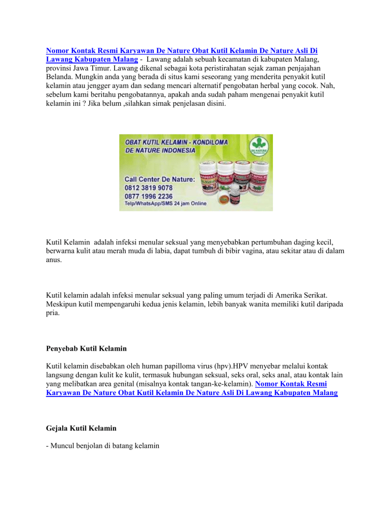 Nomor Kontak Resmi Karyawan De Nature Obat Kutil Kelamin De Nature Asli Di Lawang Kabupaten Malang - Lawang adalah sebuah kecamatan di kabupaten Malang, provinsi Jawa Timur. Lawang dikenal sebagai kota peristirahatan sejak zaman penjajahan Belanda. Mungkin anda yang berada di situs kami seseorang yang menderita penyakit kutil kelamin atau jengger ayam dan sedang mencari alternatif pengobatan herbal yang cocok. Nah, sebelum kami beritahu pengobatannya, apakah anda sudah paham mengenai penyakit kutil kelamin ini ? Jika belum ,silahkan simak penjelasan disini. Kutil Kelamin adalah infeksi menular seksual yang menyebabkan pertumbuhan daging kecil, berwarna kulit atau merah muda di labia, dapat tumbuh di bibir vagina, atau sekitar atau di dalam anus. Kutil kelamin adalah infeksi menular seksual yang paling umum terjadi di Amerika Serikat. Meskipun kutil mempengaruhi kedua jenis kelamin, lebih banyak wanita memiliki kutil daripada pria. Penyebab Kutil Kelamin Kutil kelamin disebabkan oleh human papilloma virus (hpv).HPV menyebar melalui kontak langsung dengan kulit ke kulit, termasuk hubungan seksual, seks oral, seks anal, atau kontak lain yang melibatkan area genital (misalnya kontak tangan-ke-kelamin). Nomor Kontak Resmi Karyawan De Nature Obat Kutil Kelamin De Nature Asli Di Lawang Kabupaten Malang Gejala Kutil Kelamin - Muncul benjolan di batang kelamin - Keluar benjolan di anus - Bintik bintik di sekitar kelamin (tidak berisi cairan) - Mungkin halus dan rata sedikit kasar bila di raba pada daerah penis,vagina maupun anus - Berwarna kulit atau merah muda (cenderung gelap) - Kebanyakan wanita tidak memiliki gejala mungkin ada gatal, terbakar, atau nyeri tekan di daerah genital Pengobatan Kutil Kelamin Beberapa sel di kulit kelamin dan vagina genital yang normal mungkin tetap terinfeksi. Saat ini tidak ada pengobatan yang secara permanen menyingkirkan hpv di semua sel yang terinfeksi,namun kebanyakan orang akan membersihkan virus dan kutil dengan sistem kekebalan tubuh mereka sendiri dalam waktu dua tahun. Bisa dilihat di chanel youtube kami : Review Lengkap Aturan Pemakaian Obat Kutil Kelamin De Nature Yang Benar Informasi untuk kenyamanan anda, bahwa Produk dari perusahaan kami ini sudah memiliki: - Bersertifikat ISO 9001:2015 - Ijin Resmi Perusahaan dari Kementerian Kesehatan - Ijin BPOM, yang artinya sudah lulus Uji Stabilitas Produk - Sertifikat Halal MUI, sehingga kehalalannya bisa dipertanggung jawabkan - Apoteker Yang berpengalaman - Sudah melewati Proses Sortir Bahan Baku, Guna Menjaga Mutu Produk - Proses Produksi Sesuai Alur CPOTB (Cara Pembuatan Obat Tradisional Yang Baik Dan Benar) Nomor Kontak Resmi Karyawan De Nature Obat Kutil Kelamin De Nature Asli Di Lawang Kabupaten Malang - Obat Kutil Kelamin Denature - Konsultasi dan Pemesanan silahkan hubungi kami di nomor kontak De Nature: 0812-38199078 atau 0877-1996-2236. Penelusuran yang terkait: testimoni de nature, rekening resmi de nature, de nature penipu.