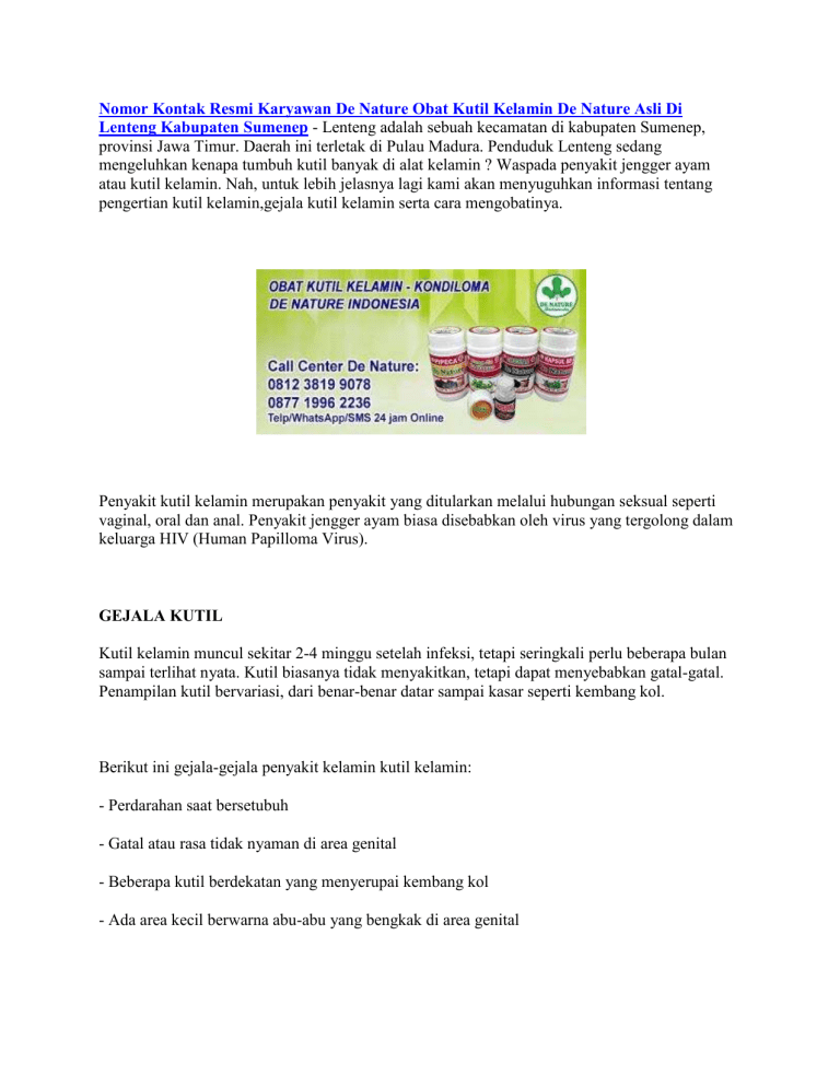 Nomor Kontak Resmi Karyawan De Nature Obat Kutil Kelamin De Nature Asli Di Lenteng Kabupaten Sumenep - Lenteng adalah sebuah kecamatan di kabupaten Sumenep, provinsi Jawa Timur. Daerah ini terletak di Pulau Madura. Penduduk Lenteng sedang mengeluhkan kenapa tumbuh kutil banyak di alat kelamin ? Waspada penyakit jengger ayam atau kutil kelamin. Nah, untuk lebih jelasnya lagi kami akan menyuguhkan informasi tentang pengertian kutil kelamin,gejala kutil kelamin serta cara mengobatinya. Penyakit kutil kelamin merupakan penyakit yang ditularkan melalui hubungan seksual seperti vaginal, oral dan anal. Penyakit jengger ayam biasa disebabkan oleh virus yang tergolong dalam keluarga HIV (Human Papilloma Virus). GEJALA KUTIL Kutil kelamin muncul sekitar 2-4 minggu setelah infeksi, tetapi seringkali perlu beberapa bulan sampai terlihat nyata. Kutil biasanya tidak menyakitkan, tetapi dapat menyebabkan gatal-gatal. Penampilan kutil bervariasi, dari benar-benar datar sampai kasar seperti kembang kol. Berikut ini gejala-gejala penyakit kelamin kutil kelamin: - Perdarahan saat bersetubuh - Gatal atau rasa tidak nyaman di area genital - Beberapa kutil berdekatan yang menyerupai kembang kol - Ada area kecil berwarna abu-abu yang bengkak di area genital CARA PENULARAN KUTIL Kutil kelamin ditularkan terutama melalui hubungan seksual. Dalam kasus yang jarang, penularan dapat terjadi secara tidak langsung setelah menggunakan handuk yang terkontaminasi. Bayi juga dapat terinfeksi selama proses kelahiran. Nomor Kontak Resmi Karyawan De Nature Obat Kutil Kelamin De Nature Asli Di Lenteng Kabupaten Sumenep CARA MENCEGAH KUTIL Usahakan selalu untuk menjaga kebersihan daerah kelamin dan jangan terlalu lembab. Seringseringlah berganti celana dalam untuk menjaga kelembapan daerah yang tertutupi. Karena penyakit ini biasanya akan berkembang jika kita tidak menjaga kesehatan di daerah organ vital. Adapun cara lain untuk mencegah penyakit tersebut, yaitu dengan menggunakan kondom saat berhubungan seksual. Lalu bagaimana cara mengobatinya? Pengobatan berbagai jenis penyakit kutil kelamin bisa dilakukan dengan berbagai macam cara. Salah satunya dengan pengobatan tradisional. Saat ini ada pengobatan tradisional yang dapat menyembuhkan penyakit kelamin pria tersebut. Bisa dilihat di chanel youtube kami : Review Lengkap Aturan Pemakaian Obat Kutil Kelamin De Nature Yang Benar PENGOBATAN HERBAL KUTIL KELAMIN Informasi untuk kenyamanan anda, bahwa Produk dari perusahaan kami ini sudah memiliki: - Bersertifikat ISO 9001:2015 - Ijin Resmi Perusahaan dari Kementerian Kesehatan - Ijin BPOM, yang artinya sudah lulus Uji Stabilitas Produk - Sertifikat Halal MUI, sehingga kehalalannya bisa dipertanggung jawabkan - Apoteker Yang berpengalaman - Sudah melewati Proses Sortir Bahan Baku, Guna Menjaga Mutu Produk - Proses Produksi Sesuai Alur CPOTB (Cara Pembuatan Obat Tradisional Yang Baik Dan Benar) Informasi selengkapnya Obat Kutil Kelamin De Nature ,silahkan hubungi kami di nomor kontak De Nature: 0812-3819-9078 atau 0877-1996-2236. Penelusuran yang terkait: testimoni de nature, rekening resmi de nature, de nature penipu.