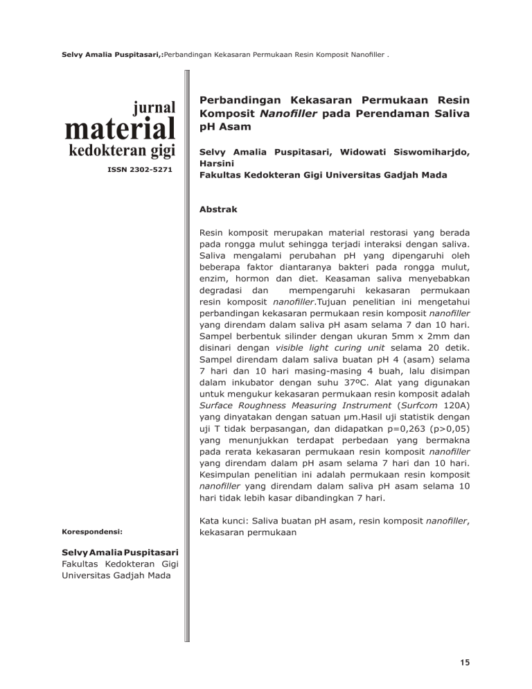 Selvy Amalia Puspitasari,:Perbandingan Kekasaran Permukaan Resin Komposit Nanofiller . Perbandingan Kekasaran Permukaan Resin Komposit Nanofiller pada Perendaman Saliva pH Asam ISSN 2302-5271 Selvy Amalia Puspitasari, Widowati Siswomiharjdo, Harsini Fakultas Kedokteran Gigi Universitas Gadjah Mada Abstrak Resin komposit merupakan material restorasi yang berada pada rongga mulut sehingga terjadi interaksi dengan saliva. Saliva mengalami perubahan pH yang dipengaruhi oleh beberapa faktor diantaranya bakteri pada rongga mulut, enzim, hormon dan diet. Keasaman saliva menyebabkan degradasi dan mempengaruhi kekasaran permukaan resin komposit nanofiller.Tujuan penelitian ini mengetahui perbandingan kekasaran permukaan resin komposit nanofiller yang direndam dalam saliva pH asam selama 7 dan 10 hari. Sampel berbentuk silinder dengan ukuran 5mm x 2mm dan disinari dengan visible light curing unit selama 20 detik. Sampel direndam dalam saliva buatan pH 4 (asam) selama 7 hari dan 10 hari masing-masing 4 buah, lalu disimpan dalam inkubator dengan suhu 37ºC. Alat yang digunakan untuk mengukur kekasaran permukaan resin komposit adalah Surface Roughness Measuring Instrument (Surfcom 120A) yang dinyatakan dengan satuan μm.Hasil uji statistik dengan uji T tidak berpasangan, dan didapatkan p=0,263 (p>0,05) yang menunjukkan terdapat perbedaan yang bermakna pada rerata kekasaran permukaan resin komposit nanofiller yang direndam dalam pH asam selama 7 hari dan 10 hari. Kesimpulan penelitian ini adalah permukaan resin komposit nanofiller yang direndam dalam saliva pH asam selama 10 hari tidak lebih kasar dibandingkan 7 hari. Korespondensi: Kata kunci: Saliva buatan pH asam, resin komposit nanofiller, kekasaran permukaan Selvy Amalia Puspitasari Fakultas Kedokteran Gigi Universitas Gadjah Mada 15 Abstract Nanofiller resin composite is a material used for dental restoration which will be in oral cavity so that interacted with the saliva. Saliva pH changes influenced by several factors, including bacteria in the oral cavity, enzymes, hormones and diet. Acid saliva can cause degradation in the composite, this degradation affects the surface roughness of resin composite. The purpose of this study is to compare surface roughness of nanofiller resins composite for 7 and 10 days of immersion in acid saliva.The samples used in this study were cylindrical mould dimension of diameter 5mm x 2mm, then polymerized with a visible light curing unit for 20s. Specimens immersed in acid artificial saliva (pH ± 4) for 7 and 10 days(4 specimens each group)and then stored in incubator at the temperature of 37ºC. The instrument used to measure surface roughness of resin composite was Surface Roughness Measuring Instrument (Surfcom 120A) that expressed in units of μm.Data were analyzedand the result obtainedwas p = 0.263 (p> 0.05), which mean there were no significant differences in the mean roughness of nanofillerresins compositesurface that were immersed in acidic pH for 7 and 10 days. The conclusion of this study was thatthe surface roughness of nanofiller resins composite immersed in acid saliva for 10 days is not rougher than which immersed for 7days. Keywords: acid artificial saliva, nanofiller composite resins, surface roughness Pendahuluan Resin komposit merupakan salah satu pilihan bahan yang sering digunakan sebagai material restorasi. Resin Komposit berkembang sebagai bahan restorasi yang banyak dipilih karena memiliki sifat tidak mudah larut, estetis baik, tidak peka terhadap dehidrasi dan relatif mudah untuk dimanipulasi 2. Resin komposit telah dikembangkan menjadi bahan restorasi yang memiliki sifat fisik yang baik terutama pada hasil pemolesan yaitu resin komposit nanofiller. Resin komposit nanofiller dikembangkan dengan teknologi nano yang biasanya digunakan untuk membentuk produk dengan dimensi komponennya sekitar 0,1 hingga 100 nm. Komponen filler pada resin komposit nanofiller berisi nanopartikel individual dan 16 nanocluster. Kombinasi nanopartikel dengan nanocluster akan mengurangi jumlah ruang interstitial antar partikel sehingga dapat meningkatkan sifat fisik dan hasil poles yang lebih baik dibanding resin komposit lainnya 8. Bahan resin komposit akan berada di rongga mulut dalam waktu yang lama sehingga terjadi interaksi dengan cairan saliva dalam rongga mulut. Saliva merupakan cairan rongga mulut yang terdiri dari 99,5 % air, 0.5 % protein dan elektrolit. Saliva memiliki pH normal berkisar antara 6,77,3 4. Saliva dapat mengalami perubahan pH yang dipengaruhi oleh beberapa faktor diantaranya pengaruh bakteri pada rongga mulut, enzim, hormon dan diet 10. Penggunaan resin komposit juga memiliki beberapa kekurangan, salah satunya adalah terjadinya degradasi jaringan polimer matriks JMKG 2016;2(5):15-19. Selvy Amalia Puspitasari,:Perbandingan Kekasaran Permukaan Resin Komposit Nanofiller . resin komposit11. Hal ini dapat terjadi akibat paparan resin komposit dengan pH asam saliva rongga mulut secara terus menerus. Degradasi terjadi akibat perubahan struktur mikro komposit dengan pembentukan pori pada resin komposit, sehingga sejumlah monomer residual keluar dari pori. Mekanisme degradasi resin komposit akibat paparan asam disebabkan hidrolisis ester yang terkandung dalam gugus dimetakrilat pada bis-GMA, bis-EMA, TEGDMA, UDMA 13 . Gugus metakrilat yang berikatan dengan ion akan terputus dari polimer kemudian struktur mikro komposit mengalami perubahan dengan pembentukan pori pada resin komposit, sehingga 6 sejumlah monomer residual keluar . Adanya pelepasan bahan pengisi komposit akan menyebabkan ruang-ruang kosong diantara matriks polimer bertambah banyak sehingga memudahkan terjadinya proses difusi cairan dari luar menuju ke dalam resin komposit1. Mekanisme lain yang dapat menyebabkan degradasi matrik resin komposit adalah adanya difusi air 11. Air yang terkandung pada saliva akan berdifusi ke dalam resin komposit dan kemudian berakumulasi di pertemuan antara resin dengan material filler, lalu bereaksi denga