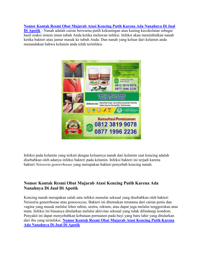 Nomor Kontak Resmi Obat Mujarab Atasi Kencing Putih Karena Ada Nanahnya Di Jual Di Apotik - Nanah adalah cairan berwarna putih kekuningan atau kuning kecokelatan sebagai hasil reaksi sistem imun tubuh Anda ketika melawan infeksi. Infeksi akan menimbulkan nanah ketika bakteri atau jamur masuk ke tubuh Anda. Dan nanah yang keluar dari kelamin anda menandakan bahwa kelamin anda telah terinfeksi. Infeksi pada kelamin yang terkait dengan keluarnya nanah dari kelamin saat kencing adalah disebabkan oleh adanya infeksi bakteri pada kelamin. Infeksi bakteri ini terjadi karena bakteri Neisseria gonorrhoeae yang merupakan bakteri penyebab kencing nanah. Nomor Kontak Resmi Obat Mujarab Atasi Kencing Putih Karena Ada Nanahnya Di Jual Di Apotik Kencing nanah merupakan salah satu infeksi menular seksual yang disebabkan oleh bakteri Neisseria gonorrhoeae atau gonococcus. Bakteri ini ditemukan terutama dari cairan penis dan vagina yang masuk melalui leher rahim, uretra, rektum, atau dapat juga melalui tenggorokan atau mata. Infeksi ini biasanya ditularkan melalui aktivitas seksual yang tidak dilindungi kondom. Penyakit ini dapat menyebabkan kebutaan permanen pada bayi yang baru lahir yang ditularkan dari ibu yang terinfeksi. Nomor Kontak Resmi Obat Mujarab Atasi Kencing Putih Karena Ada Nanahnya Di Jual Di Apotik Umumnya, gonore tidak menimbulkan gejala. Namun apabila penyakit ini menyerang saluran kemih, beberapa gejala dapat timbul pada 1 hingga 14 hari setelah infeksi terjadi. Adapun gejala gonore yang bisa muncul meliputi: Nyeri saat buang air kecil. Keluar nanah berwarna kuning, putih atau keabuan dari saluran kemih. Nyeri pada testis. Gatal dan perih di anus. Nyeri saat buang air besar. Perdarahan pada anus. Kencing nanah dapat dicegah dengan beberapa cara, seperti: Tidak berbagi mainan seks dengan orang lain Gunakan kondom pria dan kondom wanita setiap berhubungan seks vaginal atau kondom pria untuk seks anal Gunakan kondom untuk melakukan oral seks Namun jika anda sudah teinfeksi oleh penyakit ini maka yang harus anda lakukan saat ini yaitu melakukan pengobatan. Ambillah pengobatan yang aman, cepat dan tepat untuk mengatasi penaykit kencing nanah ini. Bisa dilihat di chanel youtube kami : Apakah Obat Sipilis Gang Jie Gho Siah tersedia di Apotik Umum Penelusuran yang terkait dengan Nomor Kontak Resmi Obat Mujarab Atasi Kencing Putih Karena Ada Nanahnya Di Jual Di Apotik : jual obat kencing nanah, obat nanah di apotik, biaya obat kencing nanah, efek samping obat kencing nanah, harga obat sipilis di apotik, harga obat penicilin di apotik, cara mengobati penyakit kencing nanah dengan daun sirih, berapa harga obat ceftriaxone Cara Mengobati Kelamin Keluar Cairan Putih Secara Alami