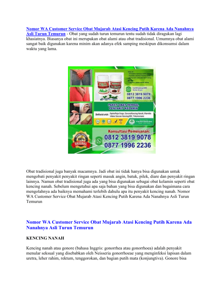 Nomor WA Customer Service Obat Mujarab Atasi Kencing Putih Karena Ada Nanahnya Asli Turun Temurun - Obat yang sudah turun temurun tentu sudah tidak diragukan lagi khasiatnya. Biasanya obat ini merupakan obat alami atau obat tradisional. Umumnya obat alami sangat baik digunakan karena minim akan adanya efek samping meskipun dikonsumsi dalam waktu yang lama. Obat tradisional juga banyak macamnya. Jadi obat ini tidak hanya bisa digunakan untuk mengobati penyakit penyakit ringan seperti masuk angin, batuk, pilek, diare dan penyakit ringan lainnya. Namun obat tradisional juga ada yang bisa digunakan sebagai obat kelamin seperti obat kencing nanah. Sebelum mengetahui apa saja bahan yang bisa digunakan dan bagaimana cara mengolahnya ada baiknya memahami terlebih dahulu apa itu penyakit kencing nanah. Nomor WA Customer Service Obat Mujarab Atasi Kencing Putih Karena Ada Nanahnya Asli Turun Temurun Nomor WA Customer Service Obat Mujarab Atasi Kencing Putih Karena Ada Nanahnya Asli Turun Temurun KENCING NANAH Kencing nanah atau gonore (bahasa Inggris: gonorrhea atau gonorrhoea) adalah penyakit menular seksual yang disebabkan oleh Neisseria gonorrhoeae yang menginfeksi lapisan dalam uretra, leher rahim, rektum, tenggorokan, dan bagian putih mata (konjungtiva). Gonore bisa menyebar melalui aliran darah ke bagian tubuh lainnya, terutama kulit dan persendian. Pada wanita, gonore bisa menjalar ke saluran kelamin dan menginfeksi selaput di dalam pinggul sehingga timbul nyeri pinggul dan gangguan reproduksi. Gonore merupakan penyakit infeksi yang menyerang lapisan epitel (lapisan paling atas dari suatu jaringan). Bila tidak diobati, infeksi ini akan menyebar ke jaringan yang lebih dalam. Biasanya membentuk koloni di daerah mukosa, orofaring, dan anogenital. Nomor WA Customer Service Obat Mujarab Atasi Kencing Putih Karena Ada Nanahnya Asli Turun Temurun GEJALA KENCING NANAH Pada pria, gejala awal gonore biasanya timbul dalam waktu 2-7 hari setelah terinfeksi. Gejalanya berawal sebagai rasa tidak enak pada uretra dan beberapa jam kemudian diikuti oleh nyeri ketika berkemih (kencing) serta keluarnya nanah dari penis. Sedangkan pada wanita, gejala awal biasanya timbul dalam waktu 7-21 hari setelah terinfeksi. Penderita seringkali tidak merasakan gejala selama beberapa minggu atau bulan, dan diketahui menderita penyakit tersebut hanya setelah pasangan hubungan seksualnya tertular. Jika timbul gejala, biasanya bersifat ringan. Tetapi beberapa penderita menunjukkan gejala yang berat, seperti desakan untuk berkemih, nyeri ketika berkemih, keluarnya cairan dari vagina, dan demam. Infeksi dapat menyerang leher rahim, rahim, saluran telur, indung telur, uretra, dan rektum serta menyebabkan nyeri pinggul yang dalam ketika berhubungan seksual. Wanita dan pria homoseksual yang melakukan hubungan seks melalui anus (seks anal) dapat menderita gonore pada rektumnya. Penderita akan merasakan tidak nyaman di sekitar anusnya dan dari rektumnya keluar cairan. Daerah di sekitar anus tampak merah dan kasar, serta tinjanya terbungkus oleh lendir dan nanah. Nomor WA Customer Service Obat Mujarab Atasi Kencing Putih Karena Ada Nanahnya Asli Turun Temurun Hubungan seksual melalui mulut seks oral dengan seorang penderita gonore biasanya akan menyebabkan gonore pada tenggorokan (faringitis gonokokal). Umumnya, infeksi tersebut tidak menimbulkan gejala, namun kadang-kadang menyebabkan nyeri tenggorokan dan gangguan untuk menelan. Jika cairan yang terinfeksi mengenai mata, maka bisa menyebabkan terjadinya infeksi mata luar (konjungtivitis gonore). Bayi yang baru lahir juga bisa terinfeksi gonore dari ibunya selama proses persalinan sehingga terjadi pembengkakan pada kedua kelopak matanya dan dari matanya keluar nanah. Jika infeksi itu tidak diobati, maka akan menimbulkan kebutaan. Bisa dilihat di chanel youtube kami : Apakah Obat Sipilis Gang Jie Gho Siah tersedia di Apotik Umum RAMUAN HERBAL UNTUK MENGATASI KENCING NANAH ALAMI YANG BISA DITEMUKAN DISEKITAR RUMAH Daun Sirih Daun sirih ini adalah daun kaya manfaat yang bisa digunakan untuk menyembuhkan berbagai macam penyakit. Salah satu manfaatnya yaitu sebagai obat kencing nanah alami yang tidak menimbulkan efek samping. Membuat ramuan dari daun sirih untuk mengobati kencing nanah adalah dengan cara direbus sampai matang, yang sebelumnya sudah dibersihkan. Kemudian saring dan minum air ramuannya secara rutin dan teratur, agar penyakit ini dapat segera sembuh dengan cepat. Bawang putih Cara membuat ramuan dengan menggunakan bawang putih ini untuk mengobati penyakit kencing nanah adalah dengan cara dimakan langsung atau juga bisa dengan cara dimakan langsung. Cara ini sangat mudah untuk siapa saja. Kumis kucing Cara membuat ramuan dengan menggunakan kumis kucing untuk pengobatan kencing nanah yaitu dengan cara direbus sampai matang, yang sebelumnya sudah dibersihkan. Kemudian saring dan minum ramuan kumis kucing ini secara rutin dan teratur, agar penyakit ini cepat sembuh dengan segera. Nomor WA Customer Service Obat Mujarab Atasi Kencing Putih Karena Ada Nanahnya Asli Turun Temurun Kulit manggis Kulit manggis ini salah satu obat kencing nanah alami tanpa memikirkan efek samping. Cara membuat ramuan dari bahan kulit manggis untuk menyembuhkan kencing nanah adalah dengan cara direbus sampai matang, yang sudah dibersihkan. Setelah itu saring dan minum ramuan kulit manggis ini secara rutin dan teratur, sampai penyakit ini bener bener sembuh total. Penelusuran yang terkait dengan Nomor WA Customer Service Obat Mujarab Atasi Kencing Putih Karena Ada Nanahnya Asli Turun Temurun : kencing nanah sembuh sendiri, obat kencing nanah di apotik, penyebab kencing nanah, obat alami kencing nanah, cara mengobati kencing nanah dengan daun sirih, cara mengobati penyakit kencing nanah dengan daun sirih, rasa sakit ketika kencing dan keluarnya nanah pada waktu kencing keputihan berwarna, penyebab kencing sakit dan keluar nanah pada pria Cara Mengobati Kelamin Keluar Cairan Putih Secara Alami