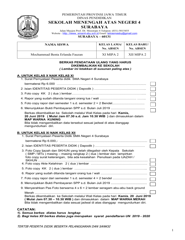 PEMERINTAH PROVINSI JAWA TIMUR DINAS PENDIDIKAN SEKOLAH MENENGAH ATAS NEGERI 4 SURABAYA Jalan Mayjen Prof. Dr. Moestopo 4 Telepon: (031) 5015455 Website : http: //www. sman4-sby.sch.id Email: [email protected] SURABAYA – 60131 NAMA SISWA KELAS LAMA/ No. ABSEN KELAS BARU/ No. ABSEN Mochammad Benta Erlanda Fauzan XI MIPA 2 XII MIPA 2 BERKAS PENDATAAN ULANG YANG HARUS DIKEMBALIKAN KE SEKOLAH ( Lembar ini letakkan di susunan paling atas ) A. UNTUK KELAS X NAIK KELAS XI 1. Surat Pernyataan Peserta didik SMA Negeri 4 Surabaya bermaterai Rp 6.000 …………………….................................................................... 2 .Isian IDENTITAS PESERTA DIDIK ( Dapodik ) ……………………………………….. 3. Foto copy KK 2 ( dua ) lembar………………………………………………………..... 4. Rapor yang sudah ditanda tangani orang tua / wali …………………………… …….. 5. Foto copy rapor dari semester 1 s.d. semester 2 = 2 Bendel................................... 6. Menunjukkan Bukti Pembayaran SPP s.d. Bulan Juli 2019 ..................................... Berkas dikembalikan ke Sekolah melalui Wali Kelas pada hari Kamis, 20 Juni 2019 ( Mulai Jam 07.30 s.d. Jam 10.30 WIB ) dan dimasukkan dalam MAP WARNA KUNING Bila tidak mengembalikan data tersebut sesuai jadwal di atas dianggap mengundurkan diri. B. UNTUK KELAS XI NAIK KELAS XII 1. Surat Pernyataan Peserta Didik SMA Negeri 4 Surabaya bermaterai Rp 6.000,- …………………….................................................................. 2. Isian IDENTITAS PESERTA DIDIK ( Dapodik ) ……………………………………… 3. Foto Copy Ijazah dan SKHUN yang telah dilegalisir oleh Kepala Sekolah ( SMP / MTs ) masing – masing rangkap 2 ( dua ) lembar dan lampirkan foto copy surat keterangan, bila ada kesalahan Penulisan pada IJAZAH / SKHUN ……………………………………………………………………………………… 4. Foto copy Akte Kelahiran 2 ( dua ) lembar …………………………………………… 5. Foto copy KK 2 ( dua ) lembar ………………………………………………………... 6. Rapor yang sudah ditanda tangani orang tua / wali …………………………………… 7. Foto copy rapor dari semester 1 s.d. semester 4 = 2 bendel ..................................... 8. Menunjukkan Bukti Pembayaran SPP s.d. Bulan Juli 2019 ....................................... 9. Menyerahkan Pas Foto berwarna 4 x 6 = 2 lembar seragam abu-abu back ground Merah ......................................................................................................................... Berkas dikembalikan ke Sekolah melalui Wali Kelas pada hari Kamis, 20 Juni 2019 ( Mulai Jam 07.30 – 10.30 WIB ) dan dimasukkan dalam MAP WARNA MERAH Bila tidak mengembalikan data sesuai jadwal di atas dianggap mengundurkan diri. CATATAN: 1). Semua berkas diatas harus lengkap 2). Bagi kelas XII berkas diatas juga merupakan syarat pendaftaran UN 2019 - 2020 TERTIB PESERTA DIDIK BESERTA PELANGGARAN DAN SANKSI 1 KELAS XI SURAT PERNYATAAN PESERTA DIDIK SMA NEGERI 4 SURABAYA TAHUN PELAJARAN 2019 / 2020 Saya yang bertanda tangan dibawah ini: 1. Nama lengkap : Mochammad Benta Erlanda Fauzan 2. Tempat / tanggal lahir : Surabaya / 02 Juli 2002 3. Jenis kelamin : Laki-laki 4. Agama : Islam 5. Nomor Induk Siswa / NISN : 301056006004 / 0028234928 6. Kelas / program : XI MIPA 2 / Belajar 7. Alamat siswa : Jl. Wonokusumo Wetan 5 / 9 8. Nama orang tua a. Nama Ayah : Ir. Mohammad Soim Pekerjaan : Ojek Online Nomor Hp. : 081231917418 b. Nama Ibu Pekerjaan Nomor Hp. 9. Alamat orang tua 10. Nama wali 11. Pekerjaan wali 12. Hubungan dengan wali 13. Alamat wali : Siswatiningsih S.O.S : Pedagang : 085235260703 : Jl. Wonokusumo Wetan 5 / 9 ::::- Dengan sungguh-sungguh dan penuh kesadaraan: Bahwa saya telah membaca / memahami dan akan mematuhi isi surat keputusan Kepala SMA Negeri 4 Surabaya tentang:TATA TERTIB PESERTA DIDIK BESERTA KRITERIA PELANGGARAN DAN SANKSI, serta saya akan mengikuti pelajaran Agama: ISLAM di SMA Negeri 4 Surabaya tahun pelajaran 2019 / 2020. Saya akan menerima semua akibat yang menyangkut atas diri saya, apabila tidak mematuhi isi keputusan tersebut di atas. Pernyataan ini saya buat sebenar-benarnya dengan penuh tanggung jawab, diketahui dan disetujui serta ditanda tangani oleh orang tua/ Wali. Surabaya, 10 - 6 - 2019 Mengetahui dan menyetujui: Orang Tua / Wali Peseta Didik Peserta Didik Yang membuat pernyataan, Materai Rp.6.000 ……………………………….. …………………………….. Catatan : Untuk surat-surat yang berhubungan dengan diri saya adalah sah, bila ditanda tangani sesuai dengan contoh tanda tangan dibawah ini. Tanda tangan Ayah ( .………………………. ) Tanda tangan Ibu ( …………………………. ) Tanda tangan Wali ( ………………………… ) 2 PEMERINTAH PROVINSI JAWA TIMUR DINAS PENDIDIKAN SEKOLAH MENENGAH ATAS NEGERI 4 Jalan Mayjend. Prof. Dr. Moestopo No. 4 Telepon 031 – 5015455 Website : http//www.sman4-sby.sch.id Email : [email protected] SURABAYA – 60131 Lembar Isian Buku Induk Kelas 301056006004 No. Absen No. Induk Siswa Di SMA Negeri 4 Surabaya No. N I S N XI MIPA 2 27 0028234928 Lembar ke: 1 A. KETERANGAN TENTANG DIRI SISWA: 1. Nama Peserta Didik a. Nama Lengkap : Mochammad Benta Erlanda Fauzan b. Nama Panggilan : Benta 2. Jenis Kelamin : Laki – Laki / Perempuan 3. Tempat dan Tanggal Lahir : Surabaya, 2 Juli 2002 4. Agama : Islam 5. Kewarganegaraan : Indonesia 6. Anak Keberapa : Pertama 7. Jumlah Saudara Kandung :1 8. Jumlah Saudara Tiri :0 9. Jumlah Saudara Angkat :0 10. Anak Yatim / Piatu / Yatim Piatu : 11. Bahasa sehari-hari Di Rumah : Bahasa Jawa dan Indonesia B. KETERANGAN: 12. Alamat 13. Nomor Telepon 14. Tinggal dengan 15. Jarak tempat tinggal ke Sekolah : Jl. Wonokusumo Wetan 5 / 9 : 087804073190 : Orang Tua : 6,9 Km. C. KETERANGAN TENTANG KESEHATAN: 16. Golongan Darah :O 17. Peny