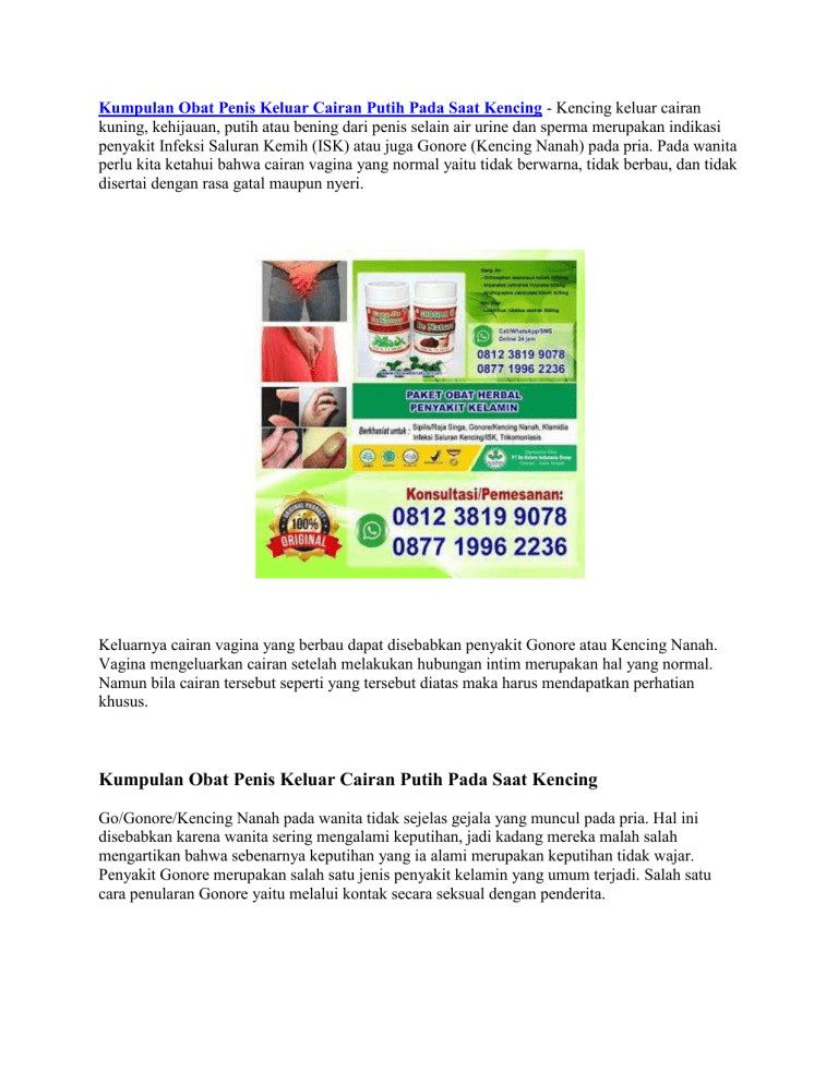 Kumpulan Obat Penis Keluar Cairan Putih Pada Saat Kencing - Kencing keluar cairan kuning, kehijauan, putih atau bening dari penis selain air urine dan sperma merupakan indikasi penyakit Infeksi Saluran Kemih (ISK) atau juga Gonore (Kencing Nanah) pada pria. Pada wanita perlu kita ketahui bahwa cairan vagina yang normal yaitu tidak berwarna, tidak berbau, dan tidak disertai dengan rasa gatal maupun nyeri. Keluarnya cairan vagina yang berbau dapat disebabkan penyakit Gonore atau Kencing Nanah. Vagina mengeluarkan cairan setelah melakukan hubungan intim merupakan hal yang normal. Namun bila cairan tersebut seperti yang tersebut diatas maka harus mendapatkan perhatian khusus. Kumpulan Obat Penis Keluar Cairan Putih Pada Saat Kencing Go/Gonore/Kencing Nanah pada wanita tidak sejelas gejala yang muncul pada pria. Hal ini disebabkan karena wanita sering mengalami keputihan, jadi kadang mereka malah salah mengartikan bahwa sebenarnya keputihan yang ia alami merupakan keputihan tidak wajar. Penyakit Gonore merupakan salah satu jenis penyakit kelamin yang umum terjadi. Salah satu cara penularan Gonore yaitu melalui kontak secara seksual dengan penderita. Bagi orang yang melakukan hubungan seks dengan penderita melalui anus atau anal dapat menderita penyakit kencing nanah juga. Penderita akan merasa tidak nyaman dan dari rektumnya akan mengeluarkan cairan. Jika buang air besar akan terasa sakit dan tinjanya akan terbungkus lendir dan nanah. Selain mengakibatkan timbulnya rasa nyeri dan ngilu pada saat buang air kecil seseorang yang terserang penyakit ISK ini juga akan mengalami beberapa gejala lainnya seperti timbulnya rasa perih dan sensasi terbakar pada saat buang air kecil,anyang-anyangan,buang air kecil terjadi lebih sering,warna urine berubah menjadi keruh,serta bau urine yang menyengat. Kumpulan Obat Penis Keluar Cairan Putih Pada Saat Kencing Kenali Penyakit Kelamin Infeksi Saluran Kemih (ISK), Gonore/Kencing Nanah ataupun Sipilis sedini mungkin. GONORE/KENCING NANAH Gonore atau kencing nanah merupakan salah satu penyakit menular seksual yang umum dan disebabkan oleh bakteri bernama Neisseria gonorrhoeae atau gonococcus. Gejala Kencing Nanah, antara lain: - Gejala awal biasanya timbul dalam waktu 2-7 hari setelah terinfeksi. - Nyeri dan perasaan tidak nyaman pada saluran kencing. - Kemaluan keluar cairan nanah atau terkadang putih dan sebagian juga keluar darah. - Jika keluar nanahnya banyak maka akan bisa keluar secara langsung. Tetapi ada juga yang keluar bersamaan dengan masturbasi. Atau bahkan hanya berupa bercak bercak putih/kuning di celana dalam biasanya terlihat saat bangun tidur di pagi hari. - Sering BAK dan terasa terbakar/sakit dan perih, walau sebagian orang tidak merasakan gejala ini. - Ada juga yang merasakan anusnya gatal, pedih dan juga berdarah. - Cairan putih bercampur nanah keluar dari penis. - Terdapat bengkak dan merah pada penis - Penis Sakit Panas Nyeri Dan Keluar Cairan Putih. - Bisa juga sakit di tenggorokan dan mata merah atau sakit mata. Bisa dilihat di chanel youtube kami : Apakah Obat Sipilis Gang Jie Gho Siah tersedia di Apotik Umum INFEKSI SALURAN KEMIH Infeksi saluran kemih ialah suatu infeksi di bagian manapun dari sistem kemih Anda seperti ginjal, saluran kemih, kandung kemih, dan uretra. Gejala ISK antara lain: - Rasa ingin berkemih yang lebih sering dari biasanya dan tidak bisa ditahan. - Urine yang dikeluarkan hanya sedikit atau bahkan tidak ada. - Nyeri atau rasa perih saat buang air kecil. - Rasa tidak nyaman dan nyeri pada perut bagian bawah. - Seperti ada tekanan pada panggul. - Bau urine yang sangat menyengat, bahkan berbau busuk. - Warna urine yang keruh, bahkan kadang-kadang bercampur darah. - Badan terasa lelah, tidak enak, dan nyeri. - Perasaan bahwa urine tidak sepenuhnya keluar setelah selesai kencing. - Cairan yang merembes dari penis (discharge), ini merupakan gejala khas yang dialami oleh pria dan perlu diwaspadai sebagai tanda awal ISK. PENGOBATAN ISK, GONORE/KENCING NANAH Wanita berisiko lebih besar terkena komplikasi jangka panjang dari infeksi yang tidak diobati. Infeksi yang tidak diobati dengan gonore pada wanita dapat menaiki saluran reproduksi wanita dan melibatkan rahim, saluran tuba, dan ovarium. Kondisi ini dikenal sebagai penyakit radang panggul (PID) dan dapat menyebabkan sakit parah dan kronis serta merusak organ reproduksi wanita. PID bisa juga disebabkan oleh penyakit menular seksual lainnya. Wanita juga dapat mengembangkan pemblokiran atau bekas luka tuba falopi, yang dapat mencegah kehamilan di masa depan atau menyebabkan kehamilan ektopik. Kehamilan ektopik terjadi saat sel telur membuahi di luar rahim. Infeksi Gonore bisa terjadi pada bayi yang baru lahir saat melahirkan. Pria mungkin mengalami jaringan parut pada uretra. Pria juga bisa mengalami abses yang menyakitkan di bagian dalam penis. Infeksi dapat menyebabkan berkurangnya kesuburan atau kemandulan. Ketika infeksi gonore menyebar ke aliran darah, pria dan wanita dapat mengalami artritis, kerusakan katup jantung, atau pembengkakan lapisan otak atau sumsum tulang belakang. Kondisi ini jarang tapi serius. Pengobatan yang dilakukan bisa menggunakan antibiotik herbal maupun kimia. Dan pastikan obat yang anda gunakan memang obat yang tepat dan tidak menimbulkan efek samping apapun. Cara Mengobati Kelamin Keluar Cairan Putih Secara Alami Penelusuran yang terkait dengan Kumpulan Obat Penis Keluar Cairan Putih Pada Saat Kencing : obat alami keluar nanah dari kemaluan pria, cara mengobati kencing sakit dan keluar cairan putih secara alami, penyebab kencing sakit dan keluar nanah pada pria, obat kencing nanah di apotik, penyebab keluar nanah dari kemaluan wanita, obat alami kencing nanah, obat sakit saat kencing dan keluar nanah, nama obat kencing nanah di apotik umum