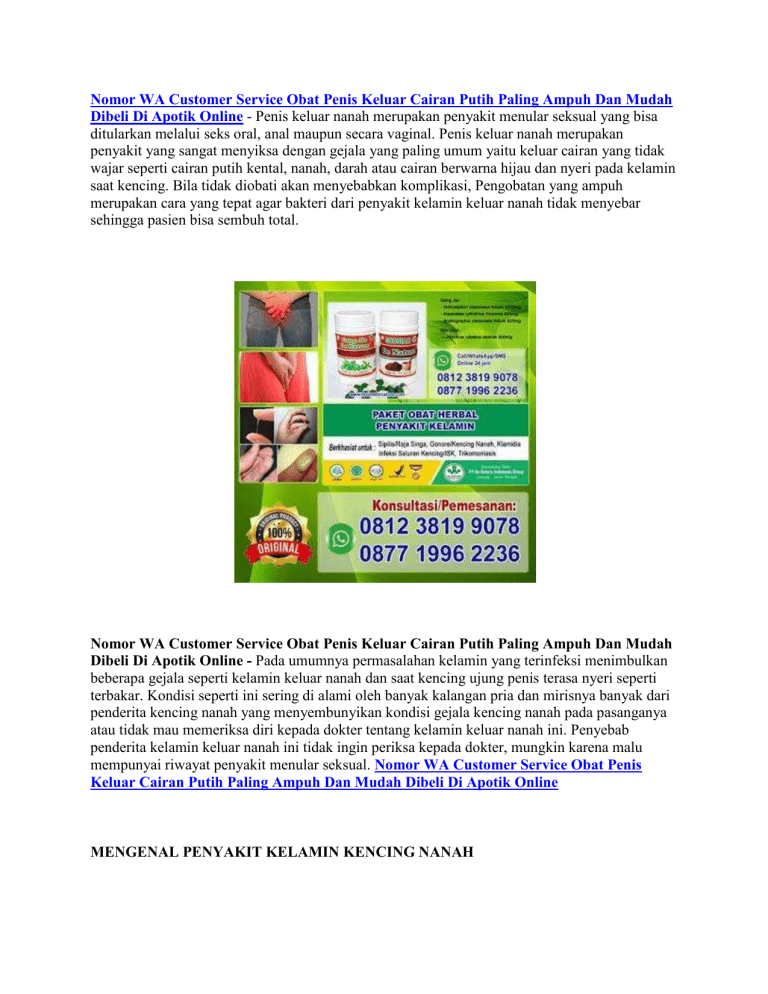 Nomor WA Customer Service Obat Penis Keluar Cairan Putih Paling Ampuh Dan Mudah Dibeli Di Apotik Online - Penis keluar nanah merupakan penyakit menular seksual yang bisa ditularkan melalui seks oral, anal maupun secara vaginal. Penis keluar nanah merupakan penyakit yang sangat menyiksa dengan gejala yang paling umum yaitu keluar cairan yang tidak wajar seperti cairan putih kental, nanah, darah atau cairan berwarna hijau dan nyeri pada kelamin saat kencing. Bila tidak diobati akan menyebabkan komplikasi, Pengobatan yang ampuh merupakan cara yang tepat agar bakteri dari penyakit kelamin keluar nanah tidak menyebar sehingga pasien bisa sembuh total. Nomor WA Customer Service Obat Penis Keluar Cairan Putih Paling Ampuh Dan Mudah Dibeli Di Apotik Online - Pada umumnya permasalahan kelamin yang terinfeksi menimbulkan beberapa gejala seperti kelamin keluar nanah dan saat kencing ujung penis terasa nyeri seperti terbakar. Kondisi seperti ini sering di alami oleh banyak kalangan pria dan mirisnya banyak dari penderita kencing nanah yang menyembunyikan kondisi gejala kencing nanah pada pasanganya atau tidak mau memeriksa diri kepada dokter tentang kelamin keluar nanah ini. Penyebab penderita kelamin keluar nanah ini tidak ingin periksa kepada dokter, mungkin karena malu mempunyai riwayat penyakit menular seksual. Nomor WA Customer Service Obat Penis Keluar Cairan Putih Paling Ampuh Dan Mudah Dibeli Di Apotik Online MENGENAL PENYAKIT KELAMIN KENCING NANAH Penis keluar nanah merupakan gejala dari penyakit kencing nanah yang disebabkan karena infeksi bakteri yang di tularkan dari orang lain dan umumnya penularan penyakit kelamin keluar nanah lewat hubungan intim atau kontak seksual yang tidak sehat. Pada wanita penyakit kencing nanah bisa menular dari ibu ke anak, bakteri kencing nanah pada umumnya menyerang uretra, rektum, atau tenggorokan. sedangkan pada pria kencing nanah dapat mempengaruhi sistem reproduksi dan dapat menyebabkan kemandulan. Gejala kelamin keluar nanah pada wanita tidak sejelas gejala yang muncul pada penderita pria. Secara umum, Wanita yang terjangkit penyakit kelamin keluar nanah akan menimbulkan gejala seperti keputihan yang tidak wajar. Tak hanya melalui organ intim saja bakteri Neisseria gonorhoeae ini bisa masuk, tapi juga bisa mengenai mulut dan mata. Bila gejala penyakit kencing nanah sudah terasa dan terlihat dalam tubuh, sebaiknya segera lakukan perawatan dan perobatan yang tepat untuk mengatasi masalah ini. Nomor WA Customer Service Obat Penis Keluar Cairan Putih Paling Ampuh Dan Mudah Dibeli Di Apotik Online PENYEBAB PENYAKIT KELAMIN KENCING NANAH Penyebab penyakit kelamin kencing nanah adalah bakteri Neisseria gonorrhea dan bakteri ini menyerang selaput lendir dari tubuh dan area hangat dan lembab di saluran reproduksi anda. Seperti pada leher rahim, saluran rahim, dan saluran tuba pada wanita, dan di uretra pada wanita dan laki-laki. Pada lingkungan ini bakteri dapat tumbuh dan berkembang biak. Bakteri Neisseria gonorrhea penyebab utama penyakit kencing nanah atau penyebab kelamin keluar nanah yang sering tertular dari satu orang dan ke orang lain selama kontak seksual, termasuk pada hubungan oral, anal, atau vagina. GEJALA PENYAKIT KELAMIN KENCING NANAH Seseorang yang mengalami penyakit kelamin keluar nanah atau kencing nanah biasanya tidak akan langsung menujukan gejala, Gejala orang terkena penyakit kelamin keluar nanah biasanya sekitar 5-10 hari setelah terinfeksi dan ketika gejala itu muncul anda sebaiknya mendapatkan pengobatan secepat mungkin, karena jika tidak di obati penyakit ini dapat menyebabkan ruam, demam dan nyeri sendi. Namun sayangnya, tidak semua orang menyadari gejala yang muncul dari penyakit menular seksual ini, banyak juga kasus banyak orang yang mengidap penyakit ini tanpa menimbulkan gejala apa-apa. Nomor WA Customer Service Obat Penis Keluar Cairan Putih Paling Ampuh Dan Mudah Dibeli Di Apotik Online Gejala Penyakit Kelamin Kencing Nanah Pada Laki-Laki Pada pria gejala kelamin keluar nanah umumnya di awali seperti rasa sakit ketika buang air kecil dan panas, nyeri dan kencing terasa terbakar. Setelah itu dikuti dengan gejala seperti: Sering merasakan ingin kencing terus menerus Keluar cairan nanah dari kelamin tetesesan cairan berwarna putih, kuning, cream atau kehijauan. Bengkak dan merah pada kulup kelamin Bengkak atau nyeri pada kelamin Sakit tenggorokan secara terus-menerus nyeri pada kelamin saat kencing Dalam banyak kasus bakteri penyakit kelamin keluar nanah dapat menyebabkan kerusakan pada jaringan tubuh khusunya uretra dan testis dan rasa nyeri juga di rasakan sampai rektum. DAMPAK BURUK JIKA PENYAKIT KELAMIN KENCING NANAH TIDAK DIOBATI Pada Wanita, penyakit kencing nanah atau kelamin keluar nanah tidak diobati dapat mengakibatkan penyakit radang panggul dan dapat merusak tuba fallopi, efek buruk gonore dapat menyebabkan kurang subur bagi wanita dan meningkatkan resiko sulit mendapatkan keturunan. Sedangkan pada pria, kelamin keluar nanah yang dibiarkan bisa menyebabkan rasa sakit pada daerah testis yang beresiko terhadap infertilitas. Apabila tidak diobati dengan capat, penyakit kencing nanah kelamaan akan menyebabkan masalah peda prostat dan menimbulkan luka pada uretra sehingga menyebabkan susah untuk buang air kecil, dampak buruknya lagi dapat menyebab kemandulan pada pria. bakteri kencing nanah dapat menyebar ke darah dan persendian. kondisi ini dapat mengancam nyawa, tidak hanya itu penyakit bisa membuat penderita terserang penyakit HIV. Nomor WA Customer Service Obat Penis Keluar Cairan Putih Paling Ampuh Dan Mudah Dibeli Di Apotik Online PENGOBATAN KENCING NANAH DENGAN ANTIBIOTIK DONTER Ada beberapa obat kencing keluar nanah di apotik yang direkomendasikan oleh dokter penyakit kelamin, diantaranya yang paling sering digunakan yaitu : Ceftriaxone (rocephin), adalah obat antibiotik kencing nanah digunakan secara bersamaan dengan azithromycin untuk menghambat pertumbuhan dinding sel bakteri yang sudah mencapai darah. Azithromyci