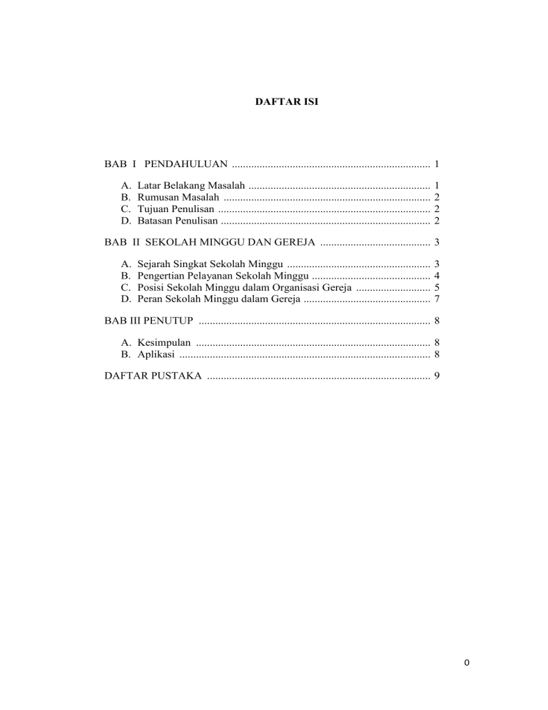 DAFTAR ISI BAB I PENDAHULUAN ........................................................................ 1 A. B. C. D. Latar Belakang Masalah .................................................................. Rumusan Masalah ........................................................................... Tujuan Penulisan ............................................................................. Batasan Penulisan ............................................................................ 1 2 2 2 BAB II SEKOLAH MINGGU DAN GEREJA ........................................ 3 A. B. C. D. Sejarah Singkat Sekolah Minggu .................................................... Pengertian Pelayanan Sekolah Minggu ........................................... Posisi Sekolah Minggu dalam Organisasi Gereja ........................... Peran Sekolah Minggu dalam Gereja .............................................. 3 4 5 7 BAB III PENUTUP .................................................................................... 8 A. Kesimpulan ..................................................................................... 8 B. Aplikasi ........................................................................................... 8 DAFTAR PUSTAKA ................................................................................. 9 0 BAB I PENDAHULUAN A. Latar Belakang Masalah Dunia anak merupakan dunia yang cukup rumit dipahami oleh orang dewasa, sekalipun semua orang dewasa pernah tinggal di dalamnya. Salah satu penyebab kerumitan tersebut adalah perubahan total antara anak-anak dan orang dewasa. Perkembangan dunia dalam segala bidang semakin meningkat dari waktu ke waktu. Perkembangan tersebut menuntut perubahan di segala bidang, untuk menyesuaikan dengan ritme perkembangan itu sendiri. Adi W. Gunawan mengutip pernyataan Darwin bahwa setiap individu yang tidak bisa menyesuaikan diri akan musnah atau tidak bisa bertahan hidup. Sekalipun banyak yang beranggapan bahwa Darwin adalah tokoh, kontroversial, namun berdasarkan riset, teorinya bisa dibenarkan. Perubahan tidak dapat dihindari. Kalau sekitar dua puluh tahun yang lalu, masih mudah dijumpai anak-anak usia sekolah yang bermain outdor dengan permainan yang berdasarkan ketangkasan fisik (lompat tali, bentengan, kasti dll.), tapi saat ini lebih muda menjuampai anak yang menyendiri ataupun berkelompok sambil main gadget. Pemandangan ini bukan hanya terjadi di dunia anak secara umum tapi juga sampai di dunia anak dalam gereja atau di kenal dengan Anak Sekolah Minggu. Gereja sebagai tubuh Kristus yang mrupakan kumpulan orang-orang percaya yang dipanggil keluar dari gelap kedalam terang, bukan hanya terdiri dari jemaat yang berusia dewasa tetapi termasuk di dalamnya anak-anak. Itulah sebabnya gereja merasa perlu untuk memberikan perhatian khusus dalam dunia anak yang cukup rumit seperti yang telah disampaikan sebelumnya. 1 B. Rumusan Masalah Berdasarkan latar belakang masalah diatas, maka penulis mengajukan rumusan masalah sebagai berikut: 1. Apa tanggung jawab gereja terhadap pelayanan Anak? 2. Dimana posisi pelayan Anak dalam organisasi gereja? Dan 3. Apa peran pelayanan Anak dalam Gereja? C. Tujuan Penulisan Adapun tujuan penulisan dari makalah ini adalah sebagai berikut: 1. Mengidentifikasi posisi pelayanan anak dalam organisasi gereja. 2. Memahami peran Pelayanan Sekolah Minggu dalam struktur organisasi gereja. 3. Sebagai salah satu bahan acuan dalam memaksimalkan peran gereja terhadap pelayanan anak. D. Batasan Penulisan Penulis menyadari bahwa pembahasan tentang Sekolah Minggu dan organisasi gereja cukup luas, maka makalah ini dibatasi pada sejarah singkat berdirinya Sekolah Minggu, persinggungan dengan gereja dan posisinya dalam gereja modern secara umum. 2 BAB II SEKOLAH MINGGU DAN GEREJA A. Sejarah Singkat Sekolah Minggu Sekolah Minggu merupakan kegiatan pendidikan bagi anak-anak yang lazim diadakan oleh gereja-gereja masa kini. Namun demikian tidak semua orang tahu bagaimana asal mula adanya Sekolah Minggu. Pendidikan iman untuk anak memang dapat ditelusuri dari tradisi Yahudi dan awal kekristenan, namun istilah “Sekolah Minggu” sebagai wadahnya baru terjadi pada abad 18-19. Sekolah Minggu tidak dapat dipisahkan dari tokoh pemrakarsanya, yaitu Robert Raikes (1736-1811). Robert Raikes bukanlah seorang teolog atau pendeta, melainkan seorang wartawan, pemilik sebuah percetakan/penerbit harian di Gloucester, Inggris. Latar belakang situasi zamannya adalah revolusi industri yang menyebabkan banyak orang melakukan urbanisasi ke kota-kota untuk mencari pekerjaan di pabrikpabrik. Di antara kaum pekerja itu terdapat juga anak-anak, yang karena pekerjaan tidak dapat bersekolah. Hari Minggu, sebagai satu-satunya hari libur, mereka pergunakan untuk melakukan berbagai aktivitas yang menyenangkan bagi anakanak itu, namun merupakan perbuatan onar bagi masyarakat sekitarnya. Karena di antara anak-anak itu ada yang melakukan kejahatan, maka mereka dipenjara. Robert Raikes, yang banyak menulis di surat kabar miliknya, Gloucester Journal, tergerak untuk menuliskan pemikiran-pemikirannya yang tidak menyetujui penjara bagi anak-anak. Raikes menganjurkan agar anak-anak itu diberi pendidikan. Gagasannya ia wujudkan pada tahun 1780, ketika ia memulai suatu sekolah pada hari Minggu di rumahnya sendiri. Ia menggaji seorang guru untuk mengajar anak-anak itu membaca, menulis, hidup sopan, dan mengenal cerita-cerita Alkitab. Acara Sekolah Minggu perdana adalah pukul 10.00-12.00 belajar membaca; kemudian murid pulang ke rumah untuk makan siang; pukul 13.00 kembali berkumpul untuk bersama-sama ke gereja, dilanjutkan menghafal 3 katekismus sampai pukul 17.00. Sekalipun sering ditentang oleh majikan yang tidak suka buruh-buruhnya mampu membaca (siapa tahu ada yang membaca revolusi Perancis, kemudian memperjuangkan hal yang sama di Inggris), Sekolah Minggu yang dipelopori Raikes berkembang dengan pesat di seluruh Inggris. Ketika Raikes meninggal dunia, murid Sekolah Minggu di Inggris telah 