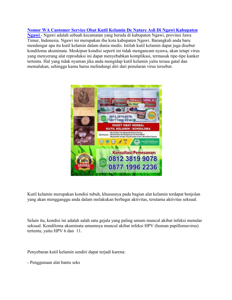 Nomor WA Customer Service Obat Kutil Kelamin De Nature Asli Di Ngawi Kabupaten Ngawi - Ngawi adalah sebuah kecamatan yang berada di kabupaten Ngawi, provinsi Jawa Timur, Indonesia. Ngawi ini merupakan ibu kota kabupaten Ngawi. Barangkali anda baru mendengar apa itu kutil kelamin dalam dunia medis. Istilah kutil kelamin dapat juga disebut kondiloma akuminata. Meskipun kondisi seperti ini tidak mengancam nyawa, akan tetapi virus yang menyerang alat reproduksi ini dapat menyebabkan komplikasi, termasuk tipe-tipe kanker tertentu. Hal yang tidak nyaman jika anda mengidap kutil kelamin yaitu terasa gatal dan memalukan, sehingga kamu harus melindungi diri dari penularan virus tersebut. Kutil kelamin merupakan kondisi tubuh, khususnya pada bagian alat kelamin terdapat benjolan yang akan mengganggu anda dalam melakukan berbagai aktivitas, terutama aktivitas seksual. Selain itu, kondisi ini adalah salah satu gejala yang paling umum muncul akibat infeksi menular seksual. Kondiloma akuminata umumnya muncul akibat infeksi HPV (human papillomavirus) tertentu, yaitu HPV 6 dan 11. Penyebaran kutil kelamin sendiri dapat terjadi karena: - Penggunaan alat bantu seks - Vaginal seks - Oral seks - Anal seks Selain itu pada kasus yang jarang terjadi, kutil kelamin dapat menular ke bayi, dari ibu yang terinfeksi virus. Perlu diketahui, kutil kelamin tidak menular melalui ciuman, atau media tertentu seperti alat makan, handuk, dan toilet duduk.Nomor WA Customer Service Obat Kutil Kelamin De Nature Asli Di Ngawi Kabupaten Ngawi GEJALA KUTIL KELAMIN Khusus bagi wanita, penyakit kutil kelamin dapat muncul di bagian paha bagian atas vulva, dinding vagina, daerah antara alat kelamin eksternal dan anus, saluran anus, dan leher rahim. Berikut ini adalah tanda-tanda yang dapat menunjukan keberadaan penyakit tersebut, di antaranya: - Terjadi pembengkakan di daerah kemaluan. - Beberapa kutil berdekatan dan bentuknya menyerupai bentuk kembang kol. - Terasa gatal atau rasa tidak nyaman di daerah kemaluan. - Perdarahan saat hubungan seksual. PENYEBAB KUTIL KELAMIN Seperti yang telah disinggung sebelumnya, penyebab kutil kelamin adalah virus HPV. Dilaporkan bahwa ada lebih dari 40 jenis HPV yang dapat memengaruhi area kelamin. Sebagian besar kasus penyakit kutil kelamin disebabkan oleh virus HPV tipe 6 dan 11. Kutil menyebar melalui kontak fisik pada hubungan seksual. Dalam kebanyakan kasus, sistem kekebalan tubuh yang baik akan mampu membunuh virus HPV genital dan anda mungkin tidak menyadari bahwa anda hampir terkena penyakit kondiloma akuminata. PENGOBATAN MEDIS KUTIL KELAMIN Namun, apabila telah telanjur terinfeksi penyakit tersebut, ada beberapa metode pengobatan yang dapat dilakukan seperti: - Eksisi - Electrocautery - Krioterapi - Bedah Laser Bisa dilihat di chanel youtube kami : Review Lengkap Aturan Pemakaian Obat Kutil Kelamin De Nature Yang Benar Nomor WA Customer Service Obat Kutil Kelamin De Nature Asli Di Ngawi Kabupaten Ngawi Informasi untuk kenyamanan anda, bahwa Produk dari perusahaan kami ini sudah memiliki: - Bersertifikat ISO 9001:2015 - Ijin Resmi Perusahaan dari Kementerian Kesehatan - Ijin BPOM, yang artinya sudah lulus Uji Stabilitas Produk - Sertifikat Halal MUI, sehingga kehalalannya bisa dipertanggung jawabkan - Apoteker Yang berpengalaman - Sudah melewati Proses Sortir Bahan Baku, Guna Menjaga Mutu Produk - Proses Produksi Sesuai Alur CPOTB (Cara Pembuatan Obat Tradisional Yang Baik Dan Benar) Penelusuran yang terkait: testimoni de nature de nature penipu testimoni de nature kutil kelamin harga obat kutil kelamin de nature obat kutil kelamin di apotik Baca Juga : Obat Kutil Kelamin