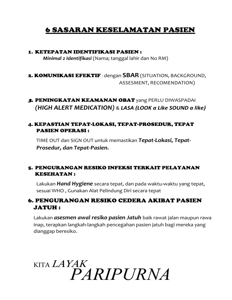 6 SASARAN KESELAMATAN PASIEN 1. KETEPATAN IDENTIFIKASI PASIEN : Minimal 2 Identifikasi (Nama; tanggal lahir dan No RM) 2. KOMUNIKASI EFEKTIF : dengan SBAR (SITUATION, BACKGROUND, ASSESMENT, RECOMENDATION) 3. PENINGKATAN KEAMANAN OBAT yang PERLU DIWASPADAI (HIGH ALERT MEDICATION) & LASA (LOOK a Like SOUND a like) 4. KEPASTIAN TEPAT-LOKASI, TEPAT-PROSEDUR, TEPAT PASIEN OPERASI : TIME OUT dan SIGN OUT untuk memastikan Tepat-Lokasi, Tepat- Prosedur, dan Tepat-Pasien. 5. PENGURANGAN RESIKO INFEKSI TERKAIT PELAYANAN KESEHATAN : Lakukan Hand Hygiene secara tepat, dan pada waktu-waktu yang tepat, sesuai WHO , Gunakan Alat Pelindung Diri secara tepat 6. PENGURANGAN RESIKO CEDERA AKIBAT PASIEN JATUH : Lakukan asesmen awal resiko pasien Jatuh baik rawat jalan maupun rawa inap, terapkan langkah-langkah pencegahan pasien jatuh bagi mereka yang dianggap beresiko. KITA LAYAK PARIPURNA