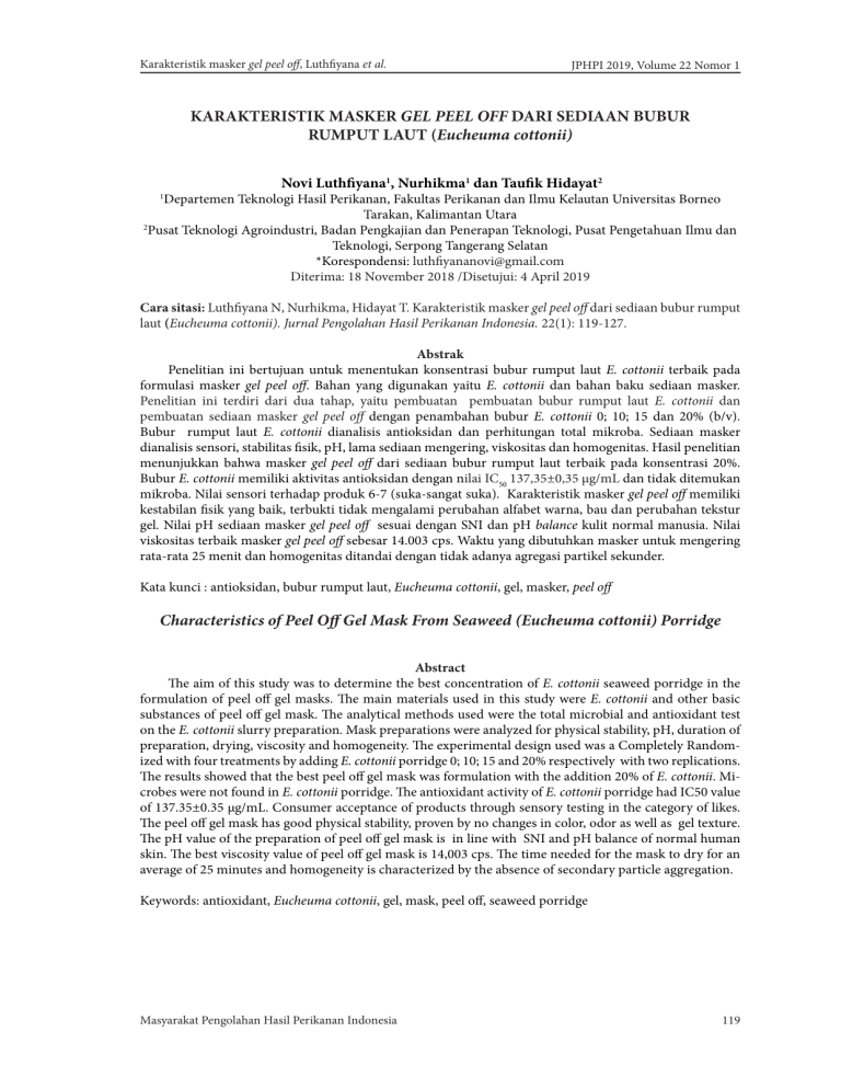 Karakteristik masker gel peel off, Luthfiyana et al. JPHPI 2019, Volume 22 Nomor 1 KARAKTERISTIK MASKER GEL PEEL OFF DARI SEDIAAN BUBUR RUMPUT LAUT (Eucheuma cottonii) Novi Luthfiyana1, Nurhikma1 dan Taufik Hidayat2 Departemen Teknologi Hasil Perikanan, Fakultas Perikanan dan Ilmu Kelautan Universitas Borneo Tarakan, Kalimantan Utara 2 Pusat Teknologi Agroindustri, Badan Pengkajian dan Penerapan Teknologi, Pusat Pengetahuan Ilmu dan Teknologi, Serpong Tangerang Selatan *Korespondensi: [email protected] Diterima: 18 November 2018 /Disetujui: 4 April 2019 1 Cara sitasi: Luthfiyana N, Nurhikma, Hidayat T. Karakteristik masker gel peel off dari sediaan bubur rumput laut (Eucheuma cottonii). Jurnal Pengolahan Hasil Perikanan Indonesia. 22(1): 119-127. Abstrak Penelitian ini bertujuan untuk menentukan konsentrasi bubur rumput laut E. cottonii terbaik pada formulasi masker gel peel off. Bahan yang digunakan yaitu E. cottonii dan bahan baku sediaan masker. Penelitian ini terdiri dari dua tahap, yaitu pembuatan pembuatan bubur rumput laut E. cottonii dan pembuatan sediaan masker gel peel off dengan penambahan bubur E. cottonii 0; 10; 15 dan 20% (b/v). Bubur rumput laut E. cottonii dianalisis antioksidan dan perhitungan total mikroba. Sediaan masker dianalisis sensori, stabilitas fisik, pH, lama sediaan mengering, viskositas dan homogenitas. Hasil penelitian menunjukkan bahwa masker gel peel off dari sediaan bubur rumput laut terbaik pada konsentrasi 20%. Bubur E. cottonii memiliki aktivitas antioksidan dengan nilai IC50 137,35±0,35 μg/mL dan tidak ditemukan mikroba. Nilai sensori terhadap produk 6-7 (suka-sangat suka). Karakteristik masker gel peel off memiliki kestabilan fisik yang baik, terbukti tidak mengalami perubahan alfabet warna, bau dan perubahan tekstur gel. Nilai pH sediaan masker gel peel off sesuai dengan SNI dan pH balance kulit normal manusia. Nilai viskositas terbaik masker gel peel off sebesar 14.003 cps. Waktu yang dibutuhkan masker untuk mengering rata-rata 25 menit dan homogenitas ditandai dengan tidak adanya agregasi partikel sekunder. Kata kunci : antioksidan, bubur rumput laut, Eucheuma cottonii, gel, masker, peel off Characteristics of Peel Off Gel Mask From Seaweed (Eucheuma cottonii) Porridge Abstract The aim of this study was to determine the best concentration of E. cottonii seaweed porridge in the formulation of peel off gel masks. The main materials used in this study were E. cottonii and other basic substances of peel off gel mask. The analytical methods used were the total microbial and antioxidant test on the E. cottonii slurry preparation. Mask preparations were analyzed for physical stability, pH, duration of preparation, drying, viscosity and homogeneity. The experimental design used was a Completely Randomized with four treatments by adding E. cottonii porridge 0; 10; 15 and 20% respectively with two replications. The results showed that the best peel off gel mask was formulation with the addition 20% of E. cottonii. Microbes were not found in E. cottonii porridge. The antioxidant activity of E. cottonii porridge had IC50 value of 137.35±0.35 μg/mL. Consumer acceptance of products through sensory testing in the category of likes. The peel off gel mask has good physical stability, proven by no changes in color, odor as well as gel texture. The pH value of the preparation of peel off gel mask is in line with SNI and pH balance of normal human skin. The best viscosity value of peel off gel mask is 14,003 cps. The time needed for the mask to dry for an average of 25 minutes and homogeneity is characterized by the absence of secondary particle aggregation. Keywords: antioxidant, Eucheuma cottonii, gel, mask, peel off, seaweed porridge Masyarakat Pengolahan Hasil Perikanan Indonesia 119 JPHPI 2019, Volume 22 Nomor 1 PENDAHULUAN Kulit wajah merupakan bagian penting dan mendapat perhatian lebih karena seringnya terpapar sinar ultraviolet, debu, polusi, radikal bebas bahkan sisa sisa make up yang tidak terangkat dengan sempurna, sehingga mengakibatkan pori–pori kulit tersumbat, jerawat serta komedo. Masker wajah peel off merupakan salah satu jenis perawatan kulit wajah yang populer, mudah diaplikasikan dan tidak memberikan efek ketergantungan terhadap produk. Vieira et al. (2009), menyatakan bahwa kosmetik wajah dapat diperoleh dalam berbagai bentuk sediaan, salah satunya dalam bentuk masker wajah gel peel off. Yeom et al. (2011) melaporkan masker wajah peel off merupakan kosmetik perawatan kecantikan yang sangat populer untuk meningkatkan kualitas kulit. Masker wajah peel off merupakan salah satu jenis masker wajah yang mempunyai keunggulan dalam penggunaan yaitu dapat dengan mudah dilepas atau diangkat seperti membran elastis (Rahmawanty et al. 2015). Masker wajah peel off mampu meningkatkan hidrasi pada kulit, memperbaiki serta merawat kulit wajah dari masalah keriput, penuaan, jerawat dan dapat juga digunakan untuk mengecilkan pori, membersihkan serta melembabkan kulit serta bermanfaat dalam merelaksasi otot-otot wajah, sebagai pembersih, penyegar, pelembab dan pelembut bagi kulit wajah (Vieira et al. 2009; Velasco 2014; Grace et al. 2015). Permintaan penggunaan bahan alam sebagai bahan aktif dalam kosmetik saat ini berkembang sangat pesat. Singh et al. (2011) menyatakan bahwa reaksi negatif pada kulit karena campuran senyawa kimia, menyebabkan konsumen beralih ke produk kosmetik dari bahan alam. Grace et al. (2015), melaporkan bahwa pembuatan kosmetik dari bahan alami lebih baik dibandingkan bahan sintetis. Bahan sintetis dapat menimbulkan efek samping bahkan dapat merusak bentuk alami dari kulit. Dotulong et al. (2014), menyatakan perlu dicari sumber-sumber antioksidan alami yang relatif lebih aman. Bahan baku hasil perairan yang melimpah dan berpeluang untuk dikembangkan 120 Karakteristik masker gel peel off, Luthfiyana et al. menjadi produk kosmetika adalah rumput laut. Rumput laut dapat diolah terlebih dahulu menjadi bubur sebelum dipergunakan sebagai ba