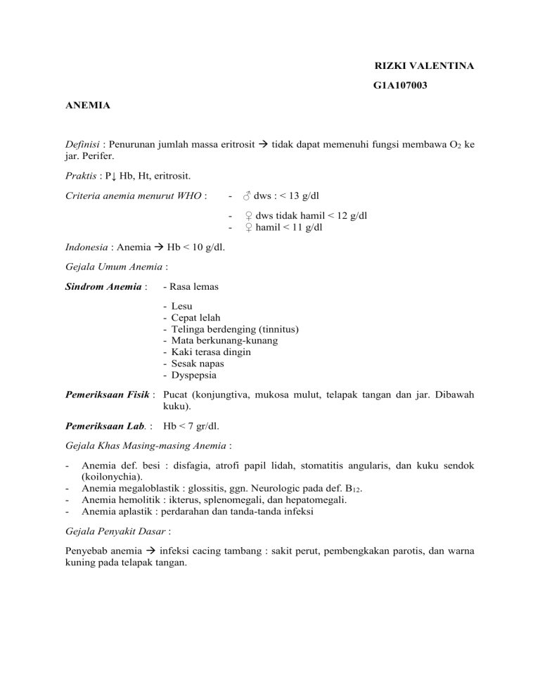 RIZKI VALENTINA G1A107003 ANEMIA Definisi : Penurunan jumlah massa eritrosit tidak dapat memenuhi fungsi membawa O2 ke jar. Perifer. Praktis : P↓ Hb, Ht, eritrosit. Criteria anemia menurut WHO : - ♂ dws : < 13 g/dl - ♀ dws tidak hamil < 12 g/dl ♀ hamil < 11 g/dl Indonesia : Anemia Hb < 10 g/dl. Gejala Umum Anemia : Sindrom Anemia : - Rasa lemas - Lesu Cepat lelah Telinga berdenging (tinnitus) Mata berkunang-kunang Kaki terasa dingin Sesak napas Dyspepsia Pemeriksaan Fisik : Pucat (konjungtiva, mukosa mulut, telapak tangan dan jar. Dibawah kuku). Pemeriksaan Lab. : Hb < 7 gr/dl. Gejala Khas Masing-masing Anemia : - Anemia def. besi : disfagia, atrofi papil lidah, stomatitis angularis, dan kuku sendok (koilonychia). Anemia megaloblastik : glossitis, ggn. Neurologic pada def. B12. Anemia hemolitik : ikterus, splenomegali, dan hepatomegali. Anemia aplastik : perdarahan dan tanda-tanda infeksi Gejala Penyakit Dasar : Penyebab anemia infeksi cacing tambang : sakit perut, pembengkakan parotis, dan warna kuning pada telapak tangan. Pemeriksaan Untuk Diagnosis Anemia : Pem. Lab. : 1. Pem. Penyaring : - Hb - Indeks Eritrosit Hapusan darah tepi 2. Pem. Darah Seri Anemia : - Hitung leukosit, trombosit, retikulosit, dan LED. 3. Pem. Sutul : Kelainan hematologic yang dapat mensupresi system eritroid. 4. Pem. khusus : - Anemia def. besi : Serum Iron, TIBC (Total Iron Binding Capacity), saturasi transferin, protoporfirin eritrosit, feritin serum, reseptor transferin dan pengecatan besi pada sutul. - Anemia megaloblastik : Folat serum, vit. B12 serum, tes supresi doksiuridin dan tes schilling. - Anemia hemolitik bilirubin serum : tes comb, elektroforesis Hb, dll. - Anemia aplastik : biopsy sutul. ANEMIA APLASTIK Definisi : kegagalan hemopoesis yang relative jarang ditemukan namun berpotensi mengancam jiwa. Penyakit ini ditandai dengan pansitopenia dan aplasia sutul. Klasifikasi : Klasifikasi Anemia aplastik berat : Selularitas sutul Sitopenia sedikitnya 2 dari 3 seri sel darah Sangat berat Tidak berat Etiologi : - Toksisitas langsung : - Iatrogenic : radiasi, kemoterapi. - Benzene - Obat-obatan. Kriteria < 25% Hitung neutrofil < 500/ml Trombosit < 20000/ml Retikulosit absolute <60000/ml SDA, kecuali hitung neutrofil < 200/ml Sutul hiperseluler - Perantara imun : - Iatrogenic - Idiopatik - Hepatitis - Kehamilan Keluhan : Perdarahan,badan lemas, pusing, jantung berdebas, demam, nafsu makan m↓, pucat, sesak napas, penglihatan kabur, telinga berdengung. Pem. Fisik : Pucat, perdarahan (kulit : petechie, purpura; gusi : ekimosis; retina; hidung : epistaksis; sal. Cerna; vagina : menorraghia), demam, hepatomegali, splenomegali (jarang). Pem. Lab : - Anemia normokrom normositer, Eritrosit muda dan leukosit muda (-) gejala klinis P↓ granulosit dan trombosit, Limfositosis, Retikulosit N/M↓, LED M, waktu perdarahan memanjang dan retraksi bekuan buruk (faal hemostasis). Sutul : sesuai criteria diagnose, Virus : etiologi, Tes HAM (Hemolisis Sukrosa) PNH (+), Kromosom : kelainan kromosom (-) sitogenetik, Lain-lain : HbF M anak, eritropoetin M. Pem. Radiologis : - Nuclear MRI Radionuclide Bone Marrow Imaging (Bone Marrow Scanning) DD : 1. Myelodisplasia herediter : kromosom aneuploidi atau abn. Structural. 2. Leukimia Limfositik Granular Besar 3. Anemia aplastik dan Hemoglubinuria Nokturnal Paroksismal (PNH). Terapi : - Imunosupresi Transplantasi sutul Terapi konservatif : - - Terapi Imunosupresif : ATG (Antihymocyte Globulin) kuda (ATG dosis 20 mg/Kg/hari 4 hari), ATG kelinci (Thyno globulin dosis 3,5 mg/Kg/hari 5 hari) + CsA (12-15 mg/Kg) 6 bulan. Transplantasi sutul - Terapi suportif : Transfusi sel darah. Prognosis : 1. Remisi sempurna (jarang) 2. Meninggal dalam 1 tahun 3. Bertahan hidup selama 20 tahun/>> ANEMIA DEFISIENSI BESI Etiologi : - - Kehilangan besi perdarahan : - Sal. Cerna : tukak peptic, NSAID, keganasan, infeksi cacing, - Sal. Genitalia ♀ : menorrhagia, - Sal. Kemih : hematuria, - Sal. Napas : hemoptoe. Factor nutrisi Kebutuhan besi m Ggn.absorpsi besi : gastrektomi, colitis kronik. Gejala Umum : sindrom anemia. Gejala Khas : - Koilonychia : kuku sendok, kuku menjadi rapuh, bergaris-garis vertical. Atrofi papil lidah : permukaan lidah menjadi licin dan mengkilap karena papil lidah menghilang. Stomatitis angularis (cheilosis) : peradangan pada sudut mulut bercak pucat keputihan. Disfagia : nyeri menelan kerusakan epitel hipofaring. Atrofi mukosa gaster akloridia. Pica (keinginan untuk makan yang tidak lazim. Gejala Peny. Dasar : infeksi cacing tambang. Pem. penunjang : 1. 2. 3. 4. 5. 6. Hb dan indeks eritrosit Besi serum ↓ < 50 µg/dl TIBC m > 350 µg/dl Saturasi transferin < 15% Protoporfirin m > 100 mg/dl Sutul : hyperplasia normoblastik ringan s/d sedang normoblas kecil-kecil. DD : An. Def. Fe TIBC m N : 250-400 Besi sutul (-) Feritin serum m↓ < 20 µg/l Besi serum m↓ < 30 Saturasi transferin m↓ < 15% Protoporfirin eri m Elektroforesis Hb (N) An. Pd peny. Kronis Thalasemia TIBC m↓ TIBC N/m↓ Besi sutul (+) Besi sutul (+) kuat Feritin serum N (20-200 Feritin serum m > 50 µg/l µg/l) Besi serum N/m Saturasi transferin m > 20% Protoporfirin eri (N) HbA2 m Terapi : 1. Terapi kausal : penyebab perdarahan 2. Pemberian preparat besi : Terapi besi oral : ferrous sulphat (sulfas ferosus) dosis 3x200 mg absorpsi besi 50 mg/hari m eritropoesis 3x N 3-6 bulan. Dosis pemeliharaan : 100-200 mg. Terapi besi parenteral : Iron dextran complex 50 mg/ml. Iron gluconat dan iron sucrose IM/IV : D = (15-Hb sekarang) x BB x 2,4 + 500/1000 mg. 3. Pemberian vit. C 3x100 mg/hari. 4. Diet : mengandung Fe daging, makanan bergizi dengan protein . 5. Transfuse darah jika Hb < 5 mg/dl. ANEMIA MEGALOBLASTIK Klasifikasi : 1. 2. 3. 4. 5. Def. kobalamin Def. as. Folat Keperluan m Malabsorpsi Ggn. Metabolism Terapi : 1. Parenteral : Kobalamin 1000 µg i.m tiap minggu selama 8 minggu. Kemudian suntikan i.m kobalamin 1000 µg/bulan. 2. Peroral : Kristalin B12 2 mg/hari 3. Folat : folat dosis tinggi 1 mg/hari