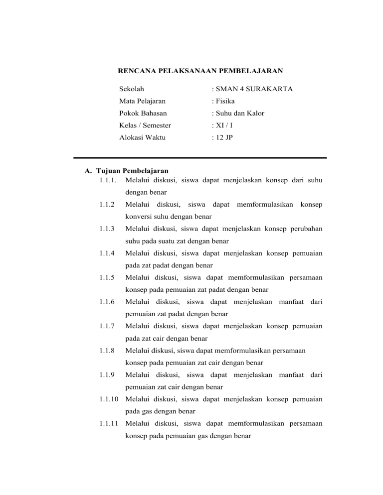 RENCANA PELAKSANAAN PEMBELAJARAN Sekolah : SMAN 4 SURAKARTA Mata Pelajaran : Fisika Pokok Bahasan : Suhu dan Kalor Kelas / Semester : XI / I Alokasi Waktu : 12 JP A. Tujuan Pembelajaran 1.1.1. Melalui diskusi, siswa dapat menjelaskan konsep dari suhu dengan benar 1.1.2 Melalui diskusi, siswa dapat memformulasikan konsep konversi suhu dengan benar 1.1.3 Melalui diskusi, siswa dapat menjelaskan konsep perubahan suhu pada suatu zat dengan benar 1.1.4 Melalui diskusi, siswa dapat menjelaskan konsep pemuaian pada zat padat dengan benar 1.1.5 Melalui diskusi, siswa dapat memformulasikan persamaan konsep pada pemuaian zat padat dengan benar 1.1.6 Melalui diskusi, siswa dapat menjelaskan manfaat dari pemuaian zat padat dengan benar 1.1.7 Melalui diskusi, siswa dapat menjelaskan konsep pemuaian pada zat cair dengan benar 1.1.8 Melalui diskusi, siswa dapat memformulasikan persamaan konsep pada pemuaian zat cair dengan benar 1.1.9 Melalui diskusi, siswa dapat menjelaskan manfaat dari pemuaian zat cair dengan benar 1.1.10 Melalui diskusi, siswa dapat menjelaskan konsep pemuaian pada gas dengan benar 1.1.11 Melalui diskusi, siswa dapat memformulasikan persamaan konsep pada pemuaian gas dengan benar 1.1.12 Melalui diskusi, siswa dapat menjelaskan manfaat dari pemuaian gas dengan benar 1.1.13 Melalui diskusi siswa dapat menjelaskan konsep perubahan wujud zat dengan benar 1.1.14 Melalui diskusi siswa dapat memformulasikan konsep kalor laten dengan benar 1.1.15 Melalui diskusi siswa dapat menjelaskan manfaat perubahan wujud zat dengan benar 1.1.16 Melalui diskusi siswa dapat menjelaskan konsep kalor dengan benar 1.1.17 Melalui diskusi siswa dapat menjelaskan konsep kalor jenis dengan benar 1.1.18 Melalui diskusi siswa dapat memformulasikan persamaan kalor jenis dengan benar 1.1.19 Melalui diskusi siswa dapat menjelaskan konsep kapasitas kalor dengan benar 1.1.20 Melalui diskusi siswa dapat mmformulasikan persamaan kapasitas kalor dengan benar 1.1.21 Melalui eksperimen siswa dapat menjelaskan konsep Azas Black dengan benar 1.1.22 Melalui eksperimen dan diskusi siswa dapat memformulasikan persamaan Azas Black dengan tepat 1.1.23 Melalui eksperimen siswa dapat menjelaskan konsep perpindahan kalor dengan benar 1.1.24 Melalui eksperimen dan diskusi siswa dapat memformulasikan persamaan laju perpindahan kalor dengan benar 1.1.25 Melalui eksperimen dan diskusi siswa dapat menjelaskan manfaat dari perpindahan kalor dalam kehidupan sehari-hari dengan benar B. Kompetensi Dasar 3.5. Menganalisis pengaruh kalor dan perpindahan kalor yang meliputi karakteristik termal suatu bahan, kapasitas, dan konduktivitas kalor pada kehidupan sehari-hari 4.5. Merencanakan dan melakukan percobaan tentang karakteristik termal suatu bahan, terutama terkait dengan kapasitas dan konduktivitas kalor, beserta presentasi hasil dan makna fisisnya C. Indikator Pembelajaran 1. Indikator KD pada KI-1 1.2.1 Menunjukkan rasa syukur terhadap Tuhan Yang Maha Esa atas adanya suhu dan kalor sehingga dapat dimanfaatkan untuk mempermudah kehidupan manusia 2. Indikator KD pada KI-2 2.1.1 Menunjukkan rasa ingin tahu yang tinggi dalam mengamati peristiwa perubahan suhu dalam kehidupan sehari-hari 2.1.2 Menunjukkan sikap teliti dalam melakukan eksperimen 2.1.3 Menunjukkan sikap bertanggungjawab dalam melaksanakan kegiatan percobaan Azas Black 2.1.4 Menunjukkan sikap kerjasama dalam melakukan percobaan, diskusi, membuat kesimpulan untuk percobaan Azas Black 2.1.5 Menunjukkan sikap bertanggungjawab dalam melaksanakan kegiatan percobaan perpindahan kalor 2.1.6 Menunjukkan sikap kerjasama dalam melakukan percobaan, diskusi, membuat kesimpulan untuk percobaan perpindahan kalor 2.1.7 Menunjukkan sikap menghargai kerja individu dan kelompok dalam setiap kegiatan yang dilakukan 3. Indikator KD pada KI-3 3.1.1 Mendefinisikan pengertian suhu 3.1.2 Memahani konsep konversi suhu 3.1.3 Memformulasikan konversi suhu 3.1.4 Memahami konsep perubahan suhu pada suatu zat 3.1.5 Memahami konsep pemuaian pada zat padat 3.1.6 Memahami konsep muai panjang 3.1.7 Memformulasikan persamaan muai panjang 3.1.8 Menjelaskan manfaat dari muai panjang dalam kehidupan sehari-hari 3.1.9 Memahami konsep muai luas 3.1.10 Memformulasikan persamaan muai luas Menjelaskan manfaat dari muai luas dalam kehidupan seharihari 3.1.11 Memahami konsep muai volume 3.1.12 Memformulasikan persamaan muai volume 3.1.13 Menjelaskan manfaat dari muai volume dalam kehidupan sehari-hari 3.1.15 Memahami konsep pemuaian pada zat cair 3.1.16 Menjelaskan manfaat dari pemuaian pada zat cair dalam kehidupan sehari-hari 3.1.17 Memahami konsep pemuaian pada gas 3.1.18 Menjelaskan manfaat dari pemuaian pada gas dalam kehidupan sehari-hari 3.1.19 Memahami konsep perubahan wujud zat 3.1.20 Memformulasikan persamaan kalor laten 3.1.21 Menjelaskan manfaat dari perubahan wujud zat dalam kehidupan sehari-hari 3.1.22 Memahami konsep kalor 3.1.23 Memahami konsep kalor jenis 3.1.24 Memformulasikan persamaan kalor jenis 3.1.25 Memahami konsep kapasitas kalor 3.1.26 Memformulasikan persamaan kapasitas kalor 3.1.27 Menjelaskan konsep Azas Black 3.1.28 Memformulasikan persamaan Azas Black 3.1.29 Memahami konsep perpindahan kalor konduksi 3.1.30 Memformulasikan persamaan laju perpindahan kalor konduksi 3.1.31 Menjelaskan manfaat dari perpindahan kalor secara konduksi dalam kehidupan sehari-hari 3.1.32 Memahami konsep perpindahan kalor konveksi 3.1.33 Memformulasikan persamaan laju perpindahan kalor konveksi 3.1.34 Menjelaskan manfaat dari perpindahan kalor secara konveksi dalam kehidupan sehari-hari 3.1.35 Memahami konsep perpindahan kalor radiasi 3.1.36 Memformulasikan persamaan laju perpindahan radiasi 3.1.37 Menjelaskan manfaat dari perpindahan kalor secara radiasi dalam kehidupan sehari-hari 4. Indikator KD pada KI-4 4.1.1 Melaksanakan percobaan Azas Black 4.1.2 Mempresentasikan hasil percobaan Azas Black 4.1.3 Melaksanakan percobaan perpindahan kalor 4.1.4 Mempresentasikan hasil percobaan perpindahan kalor D. Materi Pembelajar