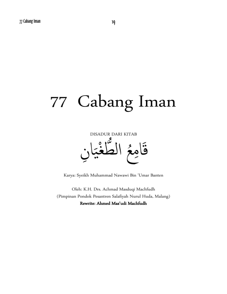 77 Cabang Iman 19 77 Cabang Iman DISADUR DARI KITAB كَا ِم ُؽ ا ُّمع ْل ََ ِان Karya: Syeikh Muhammad Nawawi Bin 'Umar Banten Oleh: K.H. Drs. Achmad Masduqi Machfudh (Pimpinan Pondok Pesantren Salafiyah Nurul Huda, Malang) Rewrite: Ahmed Mas’udi Machfudh 77 Cabang Iman 20 KATA PENGANTAR ميحرلا نمحرلا هللا مسب Segala puji bagi Allah yang telah memberikan petunjuk, bantuan dan pertolongan kepada kita sekalian, sehingga kita dapat menjadi pemeluk agama Islam, yang memiliki tiga macam ajaran. Ketiga ajaran tersebut yaitu (1)ajaran tentang keimanan untuk membimbing manusia selaku makhluk yang dapat berfikir dan memiliki keyakinan, (2)ajaran tentang peribadatan untuk membimbing tingkah laku lahir manusia sebagai penggejalaan dari nafsu manusia, dan (3)ajaran tentang akhlak untuk membimbing manusia selaku makhluk yang memiliki budi pekerti. Salawat dan salam semoga tetap tercurah atas Nabi Besar Muhammad saw yang telah menyelesaikan ketiga macam ajaran tersebut dengan sukses. Karenanya beliau menjadi pemimpin dunia terbesar yang belum dan tidak akan pernah ditandingi oleh siapa pun sepanjang sejarah. Ajaran iman yang kita ketahui memiliki enam sendi. Ternyata ajaran iman tersebut memiliki 77 cabang yang harus kita ketahui dan kita amalkan. Kitab yang menuturkan 77 cabang iman secara ringkas dan mudah difahami adalah "Qami' ath-Thughyan" karangan Syeikh Muhammad Nawawi bin 'Umar dari Banten. Kitab tersebut merupakan ulasan dari kitab "Syu'ab al-Iman" yang berbentuk syair karya Syeikh Zainuddin bin 'Ali. Terjemahan kitab tersebut lengkap dengan syair-syairnya dimaksudkan untuk dapat dijadikan bahan bacaan yang mudah bagi mereka yang ingin menambah pengetahuan agama. Syeikh Muhammad Nawawi bin 'Umar Banten mengawali ulasan syair yang menuturkan cabangcabang iman dengan tiga syair pembuka kitab "Syu'ab al-Iman" sebagai berikut: َامْ َح ْمسُ ِ ّ ِلِل َّ ِاَّلى كَسْ َظ َّ َـَّيا ِاًْ َم َان ََش ٍْط َذا ُص َـ ْة فَ ُذ َخ َّم ُم َُ ِش ْى تُ َْو ٌث ِم ْن ِنخَ ِاة امْ ُك ْو ِص ِن َم ْن كَـا َل ت َ ْـسَ َظـ َال ِثيَا َو ُ َس ِ ّ ُـل ِم ُم َحـ َّم ٍس َو ِل ِمـ َِ َو َظػػ َحـات َ ِخ َْ َماد ََار َ َْش ٌس ِِف ا َّمس َما ِء َو َا ْ ُْن ُم (1) Segala puji bagi Allah yang telah menjadikan iman seseorang mempunyai cabang-cabang, sehingga cabang tersebut harus disempurnakan. (2) Bait-bait syair ini diambil dari kitab Syeikh Zainuddin al-Kusyini, yaitu orang yang berkata setelah kami membaca salawat dan salam, (3) bagi Nabi Muhammad, keluarga dan para sahabat beliau, selama matahari dan bintang-bintang di langit masih beredar. Akhirnya kami memohon kepada Allah swt semoga risalah kecil ini dapat bermanfaat bagi generasi 77 Cabang Iman 21 muda Islam pada khususnya dan umat Islam pada umumnya, sebagaimana Allah telah memberikan manfaat yang besar kepada kitab aslinya. Malang, Rabi'ul Awwal 1417 H/Agustus 1996 Penyadur, Ahmed M. Machfudh 22 77 Cabang Iman 77 CABANG IMAN Dalam ajaran agama Islam disebutkan bahwa rukun atau sendi iman ada enam sebagaimana tersebut dalam hadits riwayat Imam Muslim. Iman tersebut mempunyai cabang sebanyak 77 (tujuh puluh tujuh). Setiap cabang berupa pekerjaan yang harus dikerjakan oleh setiap orang yang mengaku beriman. Apabila 77 pekerjaan tersebut dilakukan seluruhnya, maka sempurnalah iman seseorang. Apabila ada yang ditinggalkan, maka berarti berkurang ketebalan imannya. Cabang iman sebanyak 77 adalah berdasarkan hadits yang diriwayatkan oleh para ahli hadits yang berbunyi: ِ كَا َل َر ُس ْو ُل هللا َو َادَْنَ َُا ُ َّ َافْضَ وَُِا كَ ْو ُل َإل ِا َهل ِاإل، َاإلًْ َم ُان تِضْ ٌؽ َو َس ْح ُـ ْو َن ُص ْـ َح ًة: هللا ؿَو َ َْ َِ َو َس َّ َل ُ هللا َظ ََّّل ّ َّ ِا َم َاظ ُة ْا َل َذى َؾ ِن َوامْ َح ََا ُء ُص ْـ َح ٌة ِم َن ْاإلًْ َم ِان َر َوا ٍُ امْ ُم َح ِّسزُ ْو َن، امع ِصًْ ِق ّ Rasulullah saw bersabda, "Iman itu 77 cabangnya. Yang paling utama dari cabang-cabang tersebut adalah mengucapkan "La ilaha illallah" (tiada Tuhan melainkan Allah) dan cabang yang paling rendah adalah menyingkirkan rintangan dari jalan. Malu (berbuat maksiat) adalah satu cabang dari iman.‛ H.R. Para Ahli Hadits. Ketujuh puluh tujuh cabang iman tersebut dituturkan dalam bait syair: ــْي ُص ْـ َدـ ًة * ٌ َْس خَ ْ ِْكوَْنْ َا َب ُْ ُل فَضْ ٍل ً َ ْـ ُؼ ُم ٌ ْ ِاًْ َماهُيَا تِضْ ٌؽ َو َؾ Iman kita ada 77 cabang, yang para ahli keutamaan benar-benar akan menyempurnakannya, sehingga menjadi orang besar di sisi Allah. Cabang iman 1-5 disebutkan dalam bait syair: ب ٓ ِم ْن ج َِصِت ّ َم َوامْ َملٓئِ ِم َو ْام ُك ُذ ِة * َو ْا َلهْ ِخَِا َو ِت ََ ْو ِم ً َ ْف َن امْ َــامَ ُم Berimanlah engkau kepada Tuhanmu, para malaikat, kitab-kitab, para nabi, dan hari kerusakan alam. 1. Beriman kepada Allah Kita wajib beriman bahwa Allah adalah: a. Maha Esa yang sama sekali tidak ada sekutu bagi-Nya. b. Maha Tunggal yang sama sekali tidak ada yang serupa dengan-Nya, tempat meminta pertolongan yang sama sekali tidak ada yang menandingi-Nya. c. Maha Sedia tanpa permulaan. 77 Cabang Iman 23 d. e. f. g. h. i. j. Maha Berdiri dengan pribadi-Nya sendiri. Maha Kekal. Maha Abadi. Maha Dahulu yang tidak ada permulaan bagi-Nya. Maha Akhir yang sama sekali tidak ada kesudahan bagi-Nya. Maha Tegak yang tidak dilenyapkan oleh masa dan tidak diubah oleh sangkaan. Maha Permulaan, Maha Akhir, Maha Nampak pekerjaannya dan Maha Tersembunyi yang tidak tampak Dzat-Nya. k. Maha Suci dari jasmani, tak sesuatupun yang menyerup