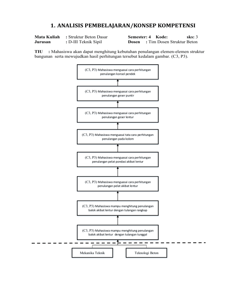 1. ANALISIS PEMBELAJARAN/KONSEP KOMPETENSI Mata Kuliah Jurusan : Struktur Beton Dasar : D-III Teknik Sipil Semester: 4 Kode: sks: 3 Dosen : Tim Dosen Struktur Beton TIU : Mahasiswa akan dapat menghitung kebutuhan penulangan elemen-elemen struktur bangunan serta mewujudkan hasil perhitungan tersebut kedalam gambar. (C3, P3). (C3, P3) Mahasiswa menguasai cara perhitungan penulangan konsol pendek (C3, P3) Mahasiswa menguasai cara perhitungan penulangan geser puntir (C3, P3) Mahasiswa menguasai cara perhitungan penulangan geser lentur (C3, P3) Mahasiswa menguasai tata cara perhitungan penulangan pada kolom (C3, P3) Mahasiswa menguasai cara perhitungan penulangan pelat pondasi akibat lentur (C3, P3) Mahasiswa menguasai cara perhitungan penulangan pelat akibat lentur (C3, P3) Mahasiswa mampu menghitung penulangan balok akibat lentur dengan tulangan rangkap (C3, P3) Mahasiswa mampu menghitung penulangan balok akibat lentur dengan tulangan tunggal Mekanika Teknik Teknologi Beton