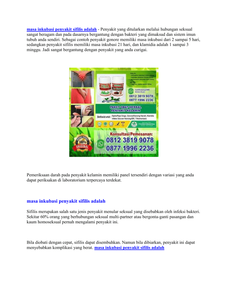 masa inkubasi penyakit sifilis adalah - Penyakit yang ditularkan melalui hubungan seksual sangat beragam dan pada dasarnya bergantung dengan bakteri yang dimaksud dan sistem imun tubuh anda sendiri. Sebagai contoh penyakit gonore memiliki masa inkubasi dari 2 sampai 5 hari, sedangkan penyakit sifilis memiliki masa inkubasi 21 hari, dan klamidia adalah 1 sampai 3 minggu. Jadi sangat bergantung dengan penyakit yang anda curigai. Pemeriksaan darah pada penyakit kelamin memiliki panel tersendiri dengan variasi yang anda dapat periksakan di laboratorium terpercaya terdekat. masa inkubasi penyakit sifilis adalah Sifilis merupakan salah satu jenis penyakit menular seksual yang disebabkan oleh infeksi bakteri. Sekitar 60% orang yang berhubungan seksual multi-partner atau bergonta-ganti pasangan dan kaum homoseksual pernah mengalami penyakit ini. Bila diobati dengan cepat, sifilis dapat disembuhkan. Namun bila dibiarkan, penyakit ini dapat menyebabkan komplikasi yang berat. masa inkubasi penyakit sifilis adalah Penyebab Sifilis Sifilis disebabkan oleh infeksi bakteri Treponema pallidum. Bakteri ini masuk dan menginfeksi manusia melalui luka di vagina, penis, anus, bibir, atau mulut. Penularan sifilis paling sering terjadi saat aktivitas seksual, baik saat penetrasi penis ke dalam vagina, maupun saat dilakukan seks oral atau seks anal. Selain itu, sifilis juga bisa ditularkan dari ibu ke bayi saat proses persalinan. Orang-orang yang rentan mengalami sifilis adalah sebagai berikut: Berhubungan seksual multi-partner, apalagi bila dilakukan tanpa pengaman (misalnya kondom) Kaum homoseksual Penderita HIV Diagnosis Sifilis Untuk dapat memastikan adanya penyakit sifilis, ada beberapa pemeriksaan yang dapat dilakukan, yaitu: Pemeriksaan darah: pemeriksaan darah berupa pemeriksaan VDRL (venereal disease research laboratory) dan TPHA (treponema pallidum haemagluttination) dapat dilakukan untuk mendeteksi adanya antibodi terhadap bakteri penyebab sifilis. Pemeriksaan cairan dari ulkus durum, dilakukan dengan mengambil sampel cairan dari ulkus durum dan melihatnya di bawah mikroskop. Penyakit sifilis dapat dipastikan bila dokter menemukan bakteri Treponema pallidum dari pemeriksaan mikroskop yang dilakukan. Bila dari salah satu pemeriksaan tersebut, seseorang dipastikan menderita sifilis, maka pasangan seksualnya juga harus diperiksa dan diobati bersama-sama sekalipun tidak memiliki gejala apa pun. Jika tidak demikian, maka penularan penyakit sifilis akan terus terjadi. Bisa dilihat di chanel youtube kami : Apakah Obat Sipilis Gang Jie Gho Siah tersedia di Apotik Umum Gejala Sifilis Penyakit sifilis yang menular ke orang lain dibagi menjadi tiga tahap penyakit, yaitu: Gejala pada Sifilis Primer Gejala pada kondisi ini umumnya muncul berupa luka dengan 10 hingga 90 hari setelah bakteri masuk ke dalam tubuh. Pemulihannya memakan waktu sekitar 3 hingga 6 minggu. Gejala pada Sifilis Sekunder Sifilis sekunder terjadi beberapa minggu setelah luka menghilang, dengan ruam yang terdapat di bagian tubuh manapun khususnya di telapak tangan dan kaki. Ditambah dengan penyakit flu, rasa lelah, sakit kepala, nyeri pada persendian dan demam umumnya menjadi contoh gejala lain yang dialami pengidap. Segera tangani sifilis sekunder dengan tepat, agar infeksi tak berlanjut ke tahap berikutnya. Gejala pada Sifilis Laten Sifilis laten terjadi tanpa gejala, tapi dalam 12 bulan pertama, infeksi masih bisa menular. Jika tidak ditangani, sifilis laten akan berubah menjadi sifilis tersier. Gejala pada Sifilis Tersier Sifilis tersier merupakan sifilis yang paling berbahaya. Gejala yang dialami akan sangat dipengaruhi oleh bagian tubuh mana dimasuki bakteri sifilis. Sifilis tersier memiliki dampak terhadap mata, jantung, otak, pembuluh darah, tulang, persendian, dan juga hati. Hal tersebut menyebabkan pengidap akan mengalami kebutaan, penyakit jantung dan juga stroke akibat dari terjadinya infeksi menular seksual tersebut. Gejala pada Sifilis Kongenital Jika sifilis terjadi kepada wanita hamil, maka janin wanita tersebut bisa juga tertular. Infeksi bisa ditularkan kepada janin jika seorang wanita hamil mengidap sifilis. Risiko tersebut bisa dikurangi dengan mengobati infeksi sifilis sebelum masa kehamilan mencapai 4 bulan. Jika penanganan dan pengobatan terlambat, ibu hamil tersebut akan terkena komplikasi. Komplikasi yang dimaksud bisa berupa bayi lahir prematur, keguguran, bayi lahir dengan sifilis, dan hilangnya nyawa bayi setelah dilahirkan. Baca Juga : Antibiotik Gonore Pencegahan Sifilis Sifilis merupakan penyakit infeksi yang dapat dicegah. Caranya adalah: Tidak melakukan hubungan seksual (abstain) Monogami (hanya berhubungan seksual dengan satu orang) Menggunakan kondom saat hubungan seksual Bila menggunakan sex toys, tidak bertukar sex toys dengan orang lain Pengobatan Sipilis Sipilis bisa sembuh dan diobati menggunakan pengobatan yang tepat dan cepat. Carilah pengobatan sipilis yang aman bagi tumbuh anda dan lakukanlah sesegera mungkin sebelum membuat penyakit semakin parah dan akhirnya menimbulkan kpmplikasi penyakit. Penelusuran yang terkait dengan masa inkubasi penyakit sifilis adalah : gejala sifilis, pengobatan sifilis, akibat penyakit sifilis, pencegahan sifilis, penularan sifilis, gejala sipilis ringan, pencegahan dan pengobatan sifilis, gambar penyakit sipilis Cara Alami Mengatasi Penyakit Kencing Nanah/Gonore - ISK - Sipilis/Raja Singa Klamidia - Trikomoniasis Dan Penyakit Lainnya