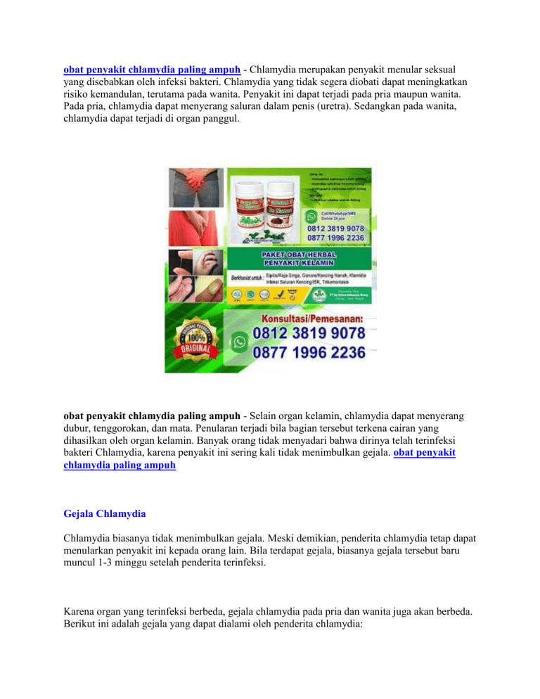 obat penyakit chlamydia paling ampuh - Chlamydia merupakan penyakit menular seksual yang disebabkan oleh infeksi bakteri. Chlamydia yang tidak segera diobati dapat meningkatkan risiko kemandulan, terutama pada wanita. Penyakit ini dapat terjadi pada pria maupun wanita. Pada pria, chlamydia dapat menyerang saluran dalam penis (uretra). Sedangkan pada wanita, chlamydia dapat terjadi di organ panggul. obat penyakit chlamydia paling ampuh - Selain organ kelamin, chlamydia dapat menyerang dubur, tenggorokan, dan mata. Penularan terjadi bila bagian tersebut terkena cairan yang dihasilkan oleh organ kelamin. Banyak orang tidak menyadari bahwa dirinya telah terinfeksi bakteri Chlamydia, karena penyakit ini sering kali tidak menimbulkan gejala. obat penyakit chlamydia paling ampuh Gejala Chlamydia Chlamydia biasanya tidak menimbulkan gejala. Meski demikian, penderita chlamydia tetap dapat menularkan penyakit ini kepada orang lain. Bila terdapat gejala, biasanya gejala tersebut baru muncul 1-3 minggu setelah penderita terinfeksi. Karena organ yang terinfeksi berbeda, gejala chlamydia pada pria dan wanita juga akan berbeda. Berikut ini adalah gejala yang dapat dialami oleh penderita chlamydia: Gejala chlamydia pada wanita Keputihan yang sangat bau. Rasa terbakar ketika buang air kecil. Sakit saat sedang berhubungan seksual, dan dapat mengalami perdarahan di vagina sesudahnya. Bila infeksi sudah menyebar, maka penderita akan merasa mual, demam, atau merasa sakit pada perut bagian bawah. obat penyakit chlamydia paling ampuh Gejala chlamydia pada pria Keluar cairan dari penis. Luka di penis terasa gatal atau terbakar. Rasa terbakar ketika buang air kecil Rasa sakit atau bengkak pada salah satu atau kedua buah zakar. obat penyakit chlamydia paling ampuh Baik pada pria maupun wanita, apabila chlamydia menginfeksi dubur, akan timbul rasa sakit yang dapat disertai keluarnya cairan atau darah dari dubur. Penyebab Chlamydia Chlamydia disebabkan oleh bakteri Chlamydia trachomatis, yang menyebar melalui cairan pada organ kelamin. Seseorang dapat tertular penyakit ini bila berhubungan seksual dengan penderita, terutama bila tidak menggunakan kondom. Selain hubungan seksual melalui vagina, chlamydia juga dapat menular melalui hubungan seksual secara oral atau anal, yang bisa menyebabkan chlamydia pada dubur maupun tenggorokan. Bakteri Chlamydia juga dapat menginfeksi organ mata. Infeksi bakteri Chlamydia pada mata dinamakan penyakit trakhoma, yang bisa menimbulkan kebutaan. Trakhoma dapat terjadi pada bayi baru lahir dari ibu penderita chlamydia yang tidak diobati. Selain pada bayi baru lahir, trakhoma juga sering ditemukan pada orang yang tinggal di lingkungan dengan sanitasi yang buruk. Melihat cara penularannya, chlamydia lebih mudah terjadi pada orang-orang yang memiliki faktor risiko berikut: - Pernah menderita penyakit menular seksual. - Sering bergonta-ganti pasangan seksual. Komplikasi Chlamydia Chlamydia dapat menyebabkan komplikasi yang berbeda pada pria dan wanita. Sedangkan pada ibu hamil, chlamydia dapat menyebabkan komplikasi pada bayi yang akan dilahirkan. Berikut ini adalah komplikasi yang dapat terjadi akibat penyakit chlamydia: Komplikasi pada wanita Pada wanita, infeksi chlamydia yang tidak diobati dapat menyebar ke rahim dan saluran telur (tuba falopi), sehingga menyebabkan radang panggul atau pelvic inflammatory disease (PID). Radang panggul dapat menyebabkan kerusakan sistem reproduksi wanita secara permanen. Kondisi ini bisa membuat penderita mengalami kemandulan, nyeri berkepanjangan di daerah panggul, dan kehamilan di luar rahim (kehamilan ektopik). Wanita yang pernah terkena infeksi chlamydia lebih dari satu kali akan lebih berisiko mengalami komplikasi yang parah pada organ reproduksi. Bisa dilihat di chanel youtube kami : Apakah Obat Sipilis Gang Jie Gho Siah tersedia di Apotik Umum Komplikasi pada pria Pada pria, chlamydia biasanya tidak menyebabkan komplikasi. Meski begitu, chlamydia dapat menginfeksi saluran sperma (epididimis), yang akan menimbulkan nyeri pada testis dan perut bagian bawah, demam, bahkan kemandulan. Pengobatan Chlamydia Chlamydia dapat diobati dengan antibiotik, seperti azithromycin atau doxycycline. Penderita chlamydia perlu minum antibiotik selama 7 hari, atau cukup minum antibiotik dosis tunggal, sesuai anjuran dokter. Penderita chlamydia tidak boleh melakukan hubungan seksual sampai 7 hari setelah pengobatan selesai. Dalam menggunakan antibiotik sebagai chlamydia maka anda harus datang langsung menemui dokter untuk berkonsultasi dan menentukan dosis yang tepat untuk penyakit yang anda alami. Jika anda tidak ingin berkonsultasi langsung kepada dokter karena malu, tidak memiliki waktu luang anda bisa berkonsultasi kepada kami. Kami membuka layanan konsultasi seputar penyakit kelamin baik itu penyakit kelamin kencing nanah atau gonore, sipilis atau raja singa, Infeksi Saluran Kemih (ISK), klamidia, Trikomoniasis, Prostat, Keputihan Abnormal dan berbagai jenis penyakit kelamin lainnya. Selain membuka layanan konsultasi kami juga akan membantu anda untuk keluar dari belenggu masalah seputar kelamin ini. Baca Juga : Antibiotik Gonore Penelusuran yang terkait dengan obat penyakit chlamydia paling ampuh : obat penyakit klamidia di apotik, obat klamidia alami, obat klamidia di apotikvsembuh dari klamidia, chlamydia trachomatis merupakan bakteri penyebab penyakit, bentuk bakteri chlamydia trachomatis, upaya pencegahan penyakit chlamydia, tanaman obat klamidia obat penyakit chlamydia paling ampuh