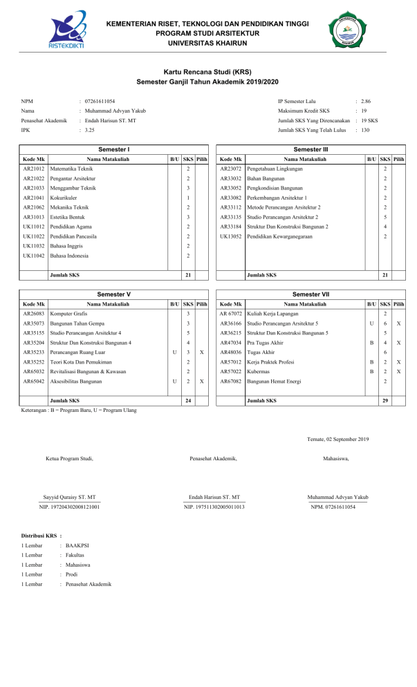 KEMENTERIAN RISET, TEKNOLOGI DAN PENDIDIKAN TINGGI PROGRAM STUDI ARSITEKTUR UNIVERSITAS KHAIRUN Kartu Rencana Studi (KRS) Semester Ganjil Tahun Akademik 2019/2020 NPM : 07261611054 IP Semester Lalu : 2.86 Nama : Muhammad Advyan Yakub Maksimum Kredit SKS : 19 Penasehat Akademik : Endah Harisun ST. MT Jumlah SKS Yang Direncanakan : 19 SKS IPK : 3.25 Jumlah SKS Yang Telah Lulus : 130 Semester I Kode Mk Nama Matakuliah Semester III B/U SKS Pilih Kode Mk AR21012 Matematika Teknik 2 AR23072 Pengetahuan Lingkungan Nama Matakuliah B/U SKS Pilih 2 AR21022 Pengantar Arsitektur 2 AR33032 Bahan Bangunan 2 AR21033 Menggambar Teknik 3 AR33052 Pengkondisian Bangunan 2 AR21041 Kokurikuler 1 AR33082 Perkembangan Arsitektur 1 2 AR21062 Mekanika Teknik 2 AR33112 Metode Perancangan Arsitektur 2 2 AR31013 Estetika Bentuk 3 AR33135 Studio Perancangan Arsitektur 2 5 UK11012 Pendidikan Agama 2 AR33184 Struktur Dan Konstruksi Bangunan 2 4 UK11022 Pendidikan Pancasila 2 UK13052 Pendidikan Kewarganegaraan 2 UK11032 Bahasa Inggris 2 UK11042 Bahasa Indonesia 2 Jumlah SKS 21 Jumlah SKS 21 Semester V Kode Mk Nama Matakuliah Semester VII B/U SKS Pilih Kode Mk Nama Matakuliah B/U SKS Pilih AR26083 Komputer Grafis 3 AR 67072 Kuliah Kerja Lapangan AR35073 Bangunan Tahan Gempa 3 AR36166 Studio Perancangan Arsitektur 5 AR35155 Studio Perancangan Arsitektur 4 5 AR36215 Struktur Dan Konstruksi Bangunan 5 AR35204 Struktur Dan Konstruksi Bangunan 4 AR47034 Pra Tugas Akhir AR35233 Perancangan Ruang Luar AR48036 Tugas Akhir AR35252 Teori Kota Dan Pemukiman AR57012 Kerja Praktek Profesi B 2 X AR65032 Revitalisasi Bangunan & Kawasan AR57022 Kubermas B 2 X AR65042 Aksesibilitas Bangunan AR67082 Bangunan Hemat Energi 2 Jumlah SKS 29 Jumlah SKS 4 U 3 X 2 2 U 2 X 24 2 U Sayyid Quraisy ST. MT Endah Harisun ST. MT NIP. 197204302008121001 NIP. 197511302005011013 Distribusi KRS : 1 Lembar : BAAKPSI 1 Lembar : Fakultas 1 Lembar : Mahasiswa 1 Lembar : Prodi 1 Lembar : Penasehat Akademik 4 X 6 Ternate, 02 September 2019 Penasehat Akademik, X 5 B Keterangan : B = Program Baru, U = Program Ulang Ketua Program Studi, 6 Mahasiswa, Muhammad Advyan Yakub NPM. 07261611054