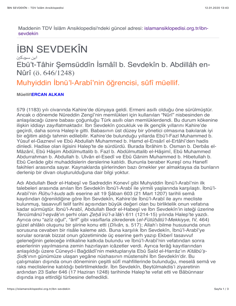 İBN SEVDEKÎN - TDV İslâm Ans#kloped#s# 12.01.2020 13:43 Maddenin TDV İslâm Ansiklopedisi'ndeki güncel adresi: islamansiklopedisi.org.tr/ibnsevdekin İBN SEVDEKÎN !ابن سودك Ebü’t-Tâhir Şemsüddîn İsmâîl b. Sevdekîn b. Abdillâh enNûrî (ö. 646/1248) Muhyiddin İbnü’l-Arabî’nin öğrencisi, sûfî müellif. Müellif:ERCAN ALKAN 579 (1183) yılı civarında Kahire’de dünyaya geldi. Ermeni asıllı olduğu öne sürülmüştür. Ancak o dönemde Nûreddin Zengî’nin memlükleri için kullanılan “Nûrî” nisbesinden de anlaşılacağı üzere babası çoğunluğu Türk asıllı olan memlüklerdendi. Bu durum kökenine ilişkin iddiayı zayıflatmaktadır. İbn Sevdekîn çocukluk ve ilk gençlik yıllarını Kahire’de geçirdi, daha sonra Halep’e gitti. Babasının üst düzey bir yönetici olmasına bakılarak iyi bir eğitim aldığı tahmin edilebilir. Kahire’de bulunduğu yıllarda Ebü’l-Fazl Muhammed b. Yûsuf el-Gaznevî ve Ebû Abdullah Muhammed b. Hamd el-Ensârî el-Ertâhî’den hadis dinledi. Hadise olan ilgisini Halep’te de sürdürdü. Burada İbrâhim b. Osman b. Derbâs elMâzânî, Ebû Hâşim Abdülmuttalib b. Fazl b. Abdülmuttalib el-Hâşimî, Ebû Muhammed Abdurrahman b. Abdullah b. Ulvân el-Esedî ve Ebû Gānim Muhammed b. Hibetullah b. Ebû Cerâde gibi muhaddislerin derslerine katıldı. Bununla beraber Kureşî onu Hanefî fakihleri arasında sayar. Kaynaklarda şiirlerinden bazı örnekler yer almaktaysa da bunların derlenip bir divan oluşturulduğuna dair bilgi yoktur. Adı Abdullah Bedr el-Habeşî ve Sadreddin Konevî gibi Muhyiddin İbnü’l-Arabî’nin ilk talebeleri arasında anılan İbn Sevdekîn İbnü’l-Arabî ile yirmili yaşlarında karşılaştı. İbnü’lArabî’nin Rûḥu’l-ḳuds adlı eserine ait 19 Şâban 603 (21 Mart 1207) tarihli semâ kaydından öğrenildiğine göre İbn Sevdekîn, Kahire’de İbnü’l-Arabî ile aynı mecliste bulunmuş, tasavvufî telif tarihi açısından büyük değeri olan bu birliktelik onun vefatına kadar sürmüştür. İbnü’l-Arabî, Abdullah Bedr el-Habeşî ve İbn Sevdekîn’in isteği üzerine Tercümânü’l-eşvâḳ’ın şerhi olan Ẕeḫâʾirü’l-aʿlâḳ’ı 611 (1214-15) yılında Halep’te yazdı. Ayrıca onu “azîz oğul”, “ârif” gibi vasıflarla zikrederek (el-Fütûḥâtü’l-Mekkiyye, IV, 464) güzel ahlâklı oluşunu bir şiirine konu etti (Dîvân, s. 517); Allah’ı bilme hususunda onun sorusuna cevaben bir risâle kaleme aldı. Buna karşılık İbn Sevdekîn, İbnü’l-Arabî’ye sorular sorarak bizzat onun gözetiminde üç eserine şerh yazıp Ekberî tasavvuf geleneğinin geleceğe intikaline katkıda bulundu ve İbnü’l-Arabî’nin vefatından sonra eserlerinin yayılmasına zemin hazırlayan icâzetler verdi. Ayrıca ferâğ kayıtlarından anlaşıldığı üzere Cüneyd-i Bağdâdî’nin mektuplarıyla Ebû Saîd el-Harrâz’ın Kitâbü’ṣṢıdḳ’ının günümüze ulaşan yegâne nüshasının müstensihi İbn Sevdekîn’dir. Bu çalışmaları dışında onun döneminin çeşitli sûfî mahfillerinde bulunduğu, meselâ semâ ve raks meclislerine katıldığı belirtilmektedir. İbn Sevdekîn, Beytülmakdis’i ziyaretinin ardından 23 Safer 646 (17 Haziran 1248) tarihinde Halep’te vefat etti ve Bâbünnasr dışında inşa ettirdiği türbesine defnedildi. https://#slamans#kloped#s#.org.tr/#bn-sevdek#n Sayfa 1 / 3 İBN SEVDEKÎN - TDV İslâm Ans#kloped#s# 12.01.2020 13:43 İbn Sevdekîn, Sadreddin Konevî ve Afîfüddin et-Tilimsânî hariç İbnü’l-Arabî’nin talebeleri arasında Ekberî tasavvuf geleneğini yazılı olarak nakleden ender kişilerden biridir. Ancak eserleri genellikle müstakil birer telif niteliği taşımamaktadır. Aslında ilgili literatürdeki değerleri de bu özelliklerinden dolayıdır. Çünkü onun eserleri, büyük oranda İbnü’lArabî’nin sohbetlerinde dile getirdiği fikirlerin ya da İbn Sevdekîn tarafından İbnü’l-Arabî’ye sorulan sorulara onun verdiği cevapların derlenmesinden ibarettir. İbnü’l-Arabî’ye ait zor ve muğlak ibarelerin yine kendisi tarafından açıklığa kavuşturulması yönüyle bu eserler önem arzetmekle beraber bazan cümlelerin kime ait olduğunu tesbit etmek güçtür. Nitekim bu yüzden olsa gerek kütüphane kayıtlarında İbn Sevdekîn’e ait gösterilen bazı eserleri Osman Yahyâ, İbnü’l-Arabî’nin olarak zikretmektedir. Eserleri. 1. Vesâʾilü’s-sâʾil. İbn Sevdekîn’in tasavvufun yaratma, tecellî, ilâhî hazret, ilâhî isimler, tevhid gibi teorik veya seyrüsülûk, zikir, ibadet, muhabbet, riyâzet, havâtır ve evrad tertibi gibi pratik konularına dair sorularına İbnü’l-Arabî’nin verdiği cevapları yahut bu meselelerde İbnü’l-Arabî’den duyduğu rivayetleri derlediği bir risâle olup (Süleymaniye Ktp., İzmirli İsmail Hakkı, nr. 3690/6) Manfred Profitlich’in inceleme ve Almanca çevirisiyle birlikte yayımlanmış (Freiburg 1973), ancak Osman Yahyâ tarafından İbnü’l-Arabî’ye ait bir eser olarak kaydedilmiştir. 2. el-Faṣṣü’l-İdrîsî. Eserde İdrîs peygamberin mi‘racının daha çok seyrüsülûkle irtibatlı yönleri üzerinde durulmuş, el-Fütûḥât (78, 79 ve 559. bablardan bir bölüm) ve Netâʾicü’l-eẕkâr’dan bazı bölümlerle (Allah ve lâ ilâhe illallah zikriyle ilgili bölüm) İbnü’l-Arabî’nin Fahreddin er-Râzî’ye yazdığı mektup eserin muhtevası ile uyumundan dolayı iktibas edilmiştir. İktibaslar dışarıda bırakıldığında risâlenin İbn Sevdekîn’e ait kısmı oldukça muhtasar bir hale gelir. Eser Veysel Akkaya tarafından tahkik edilerek (İstanbul 2009) Türkçe’ye çevrilmiştir (İdrîs Fassı, İstanbul 2013). 3. Şerḥu’tTecelliyyât. 610 (1213) yılında Halep’te dost zannettiği bir kişi İbn Sevdekîn’e İbnü’lArabî’nin Tecelliyyât adlı eserine 