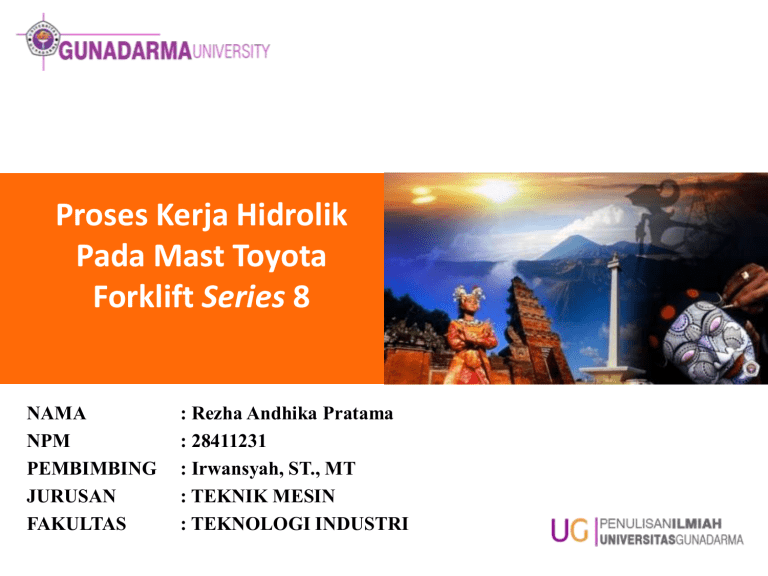 Proses Kerja Hidrolik Pada Mast Toyota Forklift Series 8 NAMA NPM PEMBIMBING JURUSAN FAKULTAS : Rezha Andhika Pratama : 28411231 : Irwansyah, ST., MT : TEKNIK MESIN : TEKNOLOGI INDUSTRI Latar Belakang • Proses sistem hidrolik adalah metode yang digunakan dalam proses mengangkatnya mast cylinder fork pada forklift. Dalam arti mempermudah suatu pekerjaan customer Industri dalam memindahkan suatu barang dengan ukuran dan berat yang cukup besar. • Sebelum berkembangnya teknologi saat ini, pengerjaan pemindahan suatu barang yang berat menggunakan sebuah alat berupa katrol yang masih menggunakan waktu yang belum efisien. • Fungsi dari sistem hidrolik forklift tersebut adalah sebagai pemindah muatan dengan cara mengangkat muatan melalui Lift Cylinder dan mendorongnya melalui Tilt Cylinder. Pergerakan ini diatur secara manual yang dioperasikan oleh Operator PENDAHULUAN Tujuan Penulisan • Memahami proses-proses sistem hidrolik pada mast Forklift toyota. • Menjelaskan proses naik-turunya mast forklift. • Memahami bagian atau komponen yang terdapat pada sistem hidrolik Forklift toyota beserta fungsinya. KOMPONEN UTAMA SISTEM HIDROLIK PADA MAST FORKLIFT Pompa hidrolik adalah sebagai pemindah oli dari tangki ke sistem. Dan bersama komponen lain menimbulkan hydraulic pressure (Tekanan Hidolik). Hydraulic Control Valve Berfungsi sebagai pensuplai dan Pengatur jumlah aliran dan tekanan pada fluida Fork atau Garpu pada forklift ini berfungsi sebagai landasan dimana barang atau beban yang akan diangkat atau dipindahkan diletakan. Garpu ini dapat digeser - geser sepanjang backrest yaitu dengan mengangkat knob yang terdapat pada pengarah atas garpu. Dengan adanya Backrest ini maka barang atau beban dapat ditahan sehingga tidak menyentuh mast Outer mast merupakan tiang penyokong utama dari pesawat angkat ini. Outer Mast juga berfungsi sebagai alur pergerakan naik-turun dari Inner Mast dan sebagai dudukan dari ujung batang torak tilt silinder. • Inner Mast merupakan tiang penyokong pada tinggi angkat tingkat kedua. • Inner Mast juga berfungsi sebagai alur pergerakannaik-turun dari Fork Assembly pada tinggi angkat tingkat pertama dan kedua. Lift silinder berfungsi sebagai pengatur pengangkatan dan penurunan garpu dan beban. Pergerakan dari batang silinder diatur oleh tekanan oli yang masuk dan yang keluar dari Lift silinder. Untuk kecepatan Lifting atau pengangkatan adalah 600 mm/sec untuk mengangkat beban dengan berat maksimal, sedangkan untuk lowering atau proses penurunan adalah 500 mm/sec dengan beban dengan berat maksimal. Tilt silinder berfungsi sebagai pengatur kemiringan tiang mast pada forklift. Tilt cylinder dapat bergerak maju dan mundur dengan gerak yang sudah ditentukan, Untuk Tilt cylinder bergerak kedepan sejauh 6̊ sedangkan untuk bergerak ke belakang dapat bergerak sejauh 12̊. Flowchart Kesimpulan 1. Hidrolik merupakan suatu sistem yang memanfaatkan energi dari fluida (cairan) yang dimampatkan sehingga menghasilkan energi mekanik/gerak mekanik (gerak piston). 2. Pompa oli (oil pump) dan oli dari tangki utama di pompakan, sehingga oli mengalir menuju Control valve. Control valve berfungsi sebagai komponen pengontrol aliran fluida hidrolik (sebagian) atau keseluruhan. Didalam control valve ini terdapat dua katup utama yaitu Lift valve dan Tilt valve. Lift valve berfungsi untuk mengontrol keluar masuknya batang torak pada lift silinder sehingga dapat menaikkan dan menurunkan beban. Tilt valve berfungsi untuk mengontrol keluar masuknya batang torak pada tilt silinder sehingga dapat memiringkan tiang pengangkat. Untuk menggerakkan batang torak pada lift silinder luar, dialirkan oli pada bagian bawah dari lift silinder. Untuk menghentikan gerakan torak ini, dapat dilakukan dengan, mengembalikan pada posisi lift valve ketengah. fork (garpu) adalah sebagai landasan beban yang mana fork ini terpasang pada kerangka (backrest) sebagai pembawa garpu dan tiang penyokong mast. Fork assembly diikatkan ke salah satu ujung rantai dan yang lainnya terikat pada beam tiang penyokong. Rantai ini bergerak sepanjang puli (wheel) yang melekat pada ujung atas dari batang torak pada lift silinder. Berputarnya puli ini akibat dari tekanan fluida di dalam lift silinder yang mengakibatkan tertariknya salah satu ujung yang terikat pada beam tiang penyokong (outer mast). Karena rantai terikat, maka pulilah yang berputar sehingga dapat bergerak naik turun oleh gaya tarik yang timbul pada rantai.