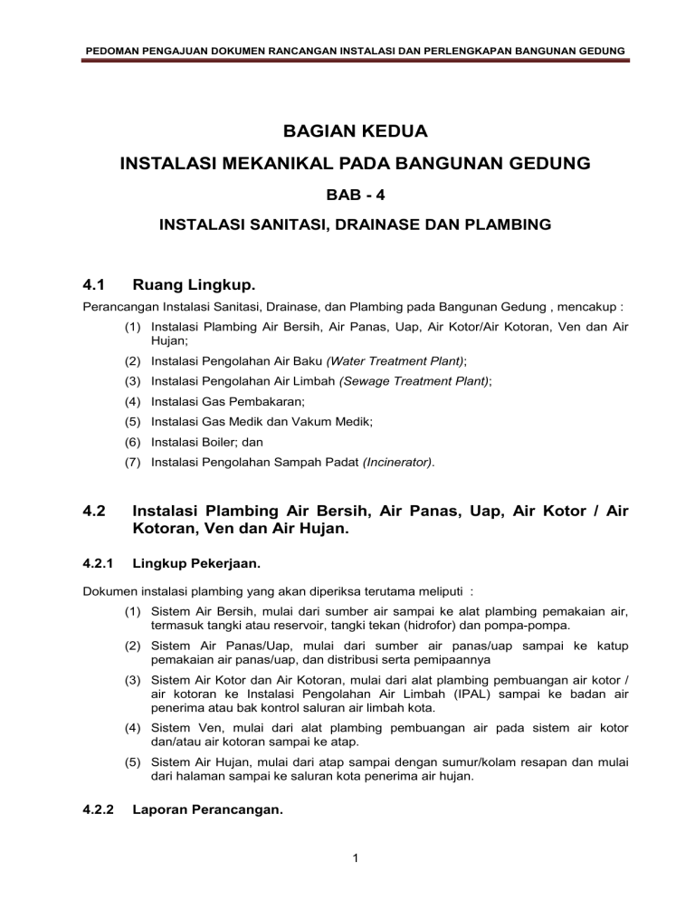 PEDOMAN PENGAJUAN DOKUMEN RANCANGAN INSTALASI DAN PERLENGKAPAN BANGUNAN GEDUNG BAGIAN KEDUA INSTALASI MEKANIKAL PADA BANGUNAN GEDUNG BAB - 4 INSTALASI SANITASI, DRAINASE DAN PLAMBING 4.1 Ruang Lingkup. Perancangan Instalasi Sanitasi, Drainase, dan Plambing pada Bangunan Gedung , mencakup : (1) Instalasi Plambing Air Bersih, Air Panas, Uap, Air Kotor/Air Kotoran, Ven dan Air Hujan; (2) Instalasi Pengolahan Air Baku (Water Treatment Plant); (3) Instalasi Pengolahan Air Limbah (Sewage Treatment Plant); (4) Instalasi Gas Pembakaran; (5) Instalasi Gas Medik dan Vakum Medik; (6) Instalasi Boiler; dan (7) Instalasi Pengolahan Sampah Padat (Incinerator). 4.2 Instalasi Plambing Air Bersih, Air Panas, Uap, Air Kotor / Air Kotoran, Ven dan Air Hujan. 4.2.1 Lingkup Pekerjaan. Dokumen instalasi plambing yang akan diperiksa terutama meliputi : (1) Sistem Air Bersih, mulai dari sumber air sampai ke alat plambing pemakaian air, termasuk tangki atau reservoir, tangki tekan (hidrofor) dan pompa-pompa. (2) Sistem Air Panas/Uap, mulai dari sumber air panas/uap sampai ke katup pemakaian air panas/uap, dan distribusi serta pemipaannya (3) Sistem Air Kotor dan Air Kotoran, mulai dari alat plambing pembuangan air kotor / air kotoran ke Instalasi Pengolahan Air Limbah (IPAL) sampai ke badan air penerima atau bak kontrol saluran air limbah kota. (4) Sistem Ven, mulai dari alat plambing pembuangan air pada sistem air kotor dan/atau air kotoran sampai ke atap. (5) Sistem Air Hujan, mulai dari atap sampai dengan sumur/kolam resapan dan mulai dari halaman sampai ke saluran kota penerima air hujan. 4.2.2 Laporan Perancangan. 1 PEDOMAN PENGAJUAN DOKUMEN RANCANGAN INSTALASI DAN PERLENGKAPAN BANGUNAN GEDUNG Laporan perancangan sekurang-kurangnya memuat bagian-bagian sebagai berikut : (1) Kriteria Perancangan. Bagian ini harus berisi penjelasan secara ringkas dasar perancangan serta besaran parameter utama yang ditetapkan untuk perancangan: (a) (b) (c) (d) (e) Sistem Air Bersih 1) Sumber air dan kapasitas pengambilan 2) Kualitas air untuk peruntukan yang disyaratkan 3) Volume, jenis dan peruntukan reservoir 4) Batas kecepatan dalam pipa, sisa tekanan pada alat plambing 5) Kebutuhan air bersih per orang per hari 6) Jenis bahan yang digunakan 7) Neraca kebutuhan air. Sistem Air Panas/Uap 1) Kebutuhan air panas per orang per hari / kebutuhan uap 2) Kerugian kalor sepanjang pipa 3) Pemakaian energi spesifik pembangkit air panas 4) Jenis bahan yang digunakan 5) Kualitas air 6) Volume dan jenis pemanas 7) Temperatur dan tekanan air panas pada alat plambing. Sistem Air Kotor dan Air Kotoran 1) Karakteristik air kotor / air kotoran 2) Sumber asal air kotor 3) Jumlah air kotor/kotoran perkapita atau equivalennya 4) Kecepatan aliran dalam pipa pengumpul 5) Jenis bahan pipa pengumpul 6) Batas maksimum tekanan yang diperbolehkan/diizinkan 7) Kerugian/kehilangan tekanan yang diizinkan 8) Jenis bahan/material yang digunakan 9) Kemiringan Pipa 10) Jumlah perangkap lemak (grease trap) dan minyak bila ada limbah mengandung lemak dan minyak. Sistem Ven 1) Ukuran pipa tegak air kotoran/buangan 2) Jumlah unit alat plambing yang dihubungkan pada pipa tegak air kotoran/buangan 3) Panjang ukur pipa tegak ven. Sistem Air Hujan 2 PEDOMAN PENGAJUAN DOKUMEN RANCANGAN INSTALASI DAN PERLENGKAPAN BANGUNAN GEDUNG (2) 1) Curah hujan maksimum untuk perancangan, termasuk Periode Ulang Hujan (PUH) 2) Taraf (“peil”) banjir bangunan dan titik sambungan saluran kota penerima. 3) Kecepatan aliran maksimum dan minimum yang diizinkan. 4) Jumlah dan dimensi sumur / kolam resapan. Peraturan, Standar dan Referensi. (a) Peraturan. 1) PERDA (Peraturan Daerah) Daerah Khusus Ibukota Jakarta Nomor 2 tahun 1994 tentang Pemboran dan Pemakaian Air Bawah Tanah di Wilayah Daerah Khusus Ibukota Jakarta. 3 PEDOMAN PENGAJUAN DOKUMEN RANCANGAN INSTALASI DAN PERLENGKAPAN BANGUNAN GEDUNG 2) SK MenKes No.16 Menkes/Per/IX/1990 tentang persyaratan air bersih (b) Standar. 1) (c) (3) SNI 6481 - 2000, tentang “Sistem Plambing – 2000”. Referensi. (1) Noerbambang, S.M. & Morimura,T. “Pedoman Perancangan dan Pemeliharaan Sistem Plambing”. PT Pradnya Paramita, Jakarta. 1984. (2) William K.Y.Tao, Richard R.Janis, “Mechanical and Electrical Systems in Buildings”, Prentice Hall, 1997. (3) Data Book, Volume 2, Plumbing System, American Society of Plumbing Engineers, 2000. Perhitungan-perhitungan. Bagian ini harus memuat contoh perhitungan untuk bagian yang penting atau bagian kritis dari sistem, meliputi : (a). (b). (c). Sistem Air Bersih 1) Perhitungan perkiraan kebutuhan air per orang per hari 2) Laju aliran air bersih berdasarkan unit alat plambing. 3) Perhitungan volume dan ukuran tangki air bawah dan atas. 4) Perhitungan palu air (water hammer). 5) Perhitungan pompa: kapasitas, head, daya dan Net Pressure Suction Head (NPSH) beserta kurva karakteristik sistem. 6) Perhitungan diameter, laju aliran, tekanan, kerugian tekanan (friction loss) dan sisa tekanan pada jalur sistem distribusi yang kritis. 7) Perhitungan dimensi, atau volume tangki tekan (hidrofor) dan penetapan start-stop pompa. Sistem Air Panas dan Uap 1) Kuantitas Air Panas / Uap yang diperlukan 2) Penentuan kapasitas ketel uap (boiler) dan/atau unit pemanas air (water heater). 3) Perhitungan kapasitas dan head pompa sirkulasi (kalau ada). 4) Perhitungan diameter, laju aliran, tekanan, kerugian tekanan (friction loss) dan sisa tekanan pada jalur sistem distribusi yang kritis. 5) Perhitungan tebal isolasi pipa 6) Perhitungan penurunan temperatur dalam pipa. Sistem Air Kotor dan Air Kotoran 1) Perhitungan beban unit plambing untuk air kotor dan air kotoran 2) Perhitungan kapasitas aliran air kotor dan air kotoran. 3) Perhitungan diameter pipa dan kemiringannya (bila menggunakan pompa harus disertakan jenis pompa, perhitungan kapasitas, head, daya serta kurva karakteristiknya). 4 PEDOMAN PENGAJUAN DOKUMEN RANCANGAN INSTALASI DAN PERLENGKAPAN BANGUNAN GEDUNG (d). 4) Perhitungan perangkap lemak (grease trap) dan miny