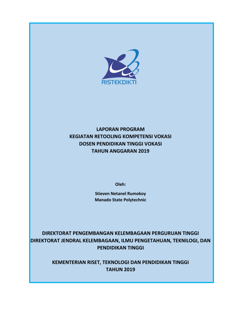 LAPORAN PROGRAM KEGIATAN RETOOLING KOMPETENSI VOKASI DOSEN PENDIDIKAN TINGGI VOKASI TAHUN ANGGARAN 2019 Oleh: Stieven Netanel Rumokoy Manado State Polytechnic DIREKTORAT PENGEMBANGAN KELEMBAGAAN PERGURUAN TINGGI DIREKTORAT JENDRAL KELEMBAGAAN, ILMU PENGETAHUAN, TEKNILOGI, DAN PENDIDIKAN TINGGI KEMENTERIAN RISET, TEKNOLOGI DAN PENDIDIKAN TINGGI TAHUN 2019 1 KATA PENGANTAR Puji dan syukur penulis panjatkan kepada Tuhan Yang Maha Esa, karena hanya berkat dan rahmat-Nya sehingga penulis dapat menyusun LAPORAN PROGRAM KEGIATAN RETOOLING KOMPETENSI VOKASI DOSEN PENDIDIKAN TINGGI VOKASI TAHUN ANGGARAN 2019 yang dilakasanakan di jerman dengan program pelaksanaan dari tanggal 21 juli 2019 sampai 14 September 2019. Sesuai dengan tujuan direktorat jendral kelembagaan, ilmu pengetahuan, teknilogi, dan pendidikan tinggi, Kegiatan Pemberian Beasiswa Retooling Kompetensi Vokasi Dosen Pendidikan Tinggi Vokasi adalah suatu upaya peningkatan kapasitas dan kapabilitas dosen perguruan tinggi vokasi yang merupakan salah satu implementasi dari program revitalisasi pendidikan tinggi vokasi pada Ditjen Kelembagaan, Iptek, dan Pendidikan Tinggi, Kementerian Riset, Teknologi, dan Pendidikan Tinggi. Program ini merupakan kombinasi antara pelatihan kompetensi bersertifikasi dan magang di lembaga pendidikan atau mitra industri yang sesuai dengan kompetensi yang diikuti. Pengalaman yang diperoleh di mitra industri selama pelatihan diharapkan nantinya dapat memacu perguruan tinggi vokasi untuk mendorong pengembangan pendidikan vokasi hingga ke tingkat magister dan doktor terapan. Hal ini juga merupakan salah satu wujud implementasi dari amanat yang tercantum pada Peraturan Presiden Nomor 8 Tahun 2012 tentang Kerangka Kualifikasi Nasional Indonesia, bahwa learning outcomes untuk dosen adalah mampu mengembangkan pengetahuan dan teknologi di dalam bidang terapan. Laporan ini berisi tentang deskripsi kegiatan - kegiatan yang dilakukan oleh penulis selama mengikuti pelatihan retooling ini. Semoga laporan ini dapat dipergunakan sebagaimana mestinya. Manado, September 2019 Stieven Netanel Rumokoy 2 DAFTAR ISI KATA PENGANTAR ...................................................................................................................... DAFAR ISI ..................................................................................................................................... BAB I PENDAHULUAN ................................................................................................................ a. Latar Belakang Kegiatan ............................................................................................... b. Tujuan Kegiatan ............................................................................................................ c. Manfaat Kegiatan ......................................................................................................... BAB II RENCANA KEGIATAN ....................................................................................................... a. Tempat Kegiatan ............................................................................................................ b. Waktu kegiatan .............................................................................................................. c. Lingkup Kegiatan ............................................................................................................ d. Deskripsi Rinci Rencana Kegiatan .................................................................................. e. Deskripsi Luaran (output) Kegiatan ................................................................................ f. Deskripsi Dampak (outcome) Kegiatan ........................................................................... BAB III PELAKSANAAN KEGIATAN ............................................................................................... a. Tahap Persiapan Kegiatan ............................................................................................. b. Tahap Pelaksanaan Kegiatan ..................................................................................... c. Tahap akhir Kegiatan .................................................................................................... BAB IV PENUTUP ......................................................................................................................... a. Kesimpulan .................................................................................................................... b. Saran .............................................................................................................................. DAFTAR PUSTAKA ....................................................................................................................... LAMPIRAN 2 3 4 4 5 5 6 6 7 8 8 17 17 18 18 22 27 29 29 29 30 3 BAB I PENDAHULUAN a. Latar Belakang Kegiatan Sebagaimana diamanatkan pada Undang Undang Nomor 12 Tahun 2012 tentang Pendidikan Tinggi, tujuan pendidikan tinggi diantaranya untuk menghasilkan lulusan yang menguasai cabang Ilmu Pengetahuan dan/atau Teknologi untuk memenuhi kepentingan nasional dan peningkatan daya saing bangsa. Untuk mempersiapkan sumberdaya manusia (SDM) Indonesia yang berkualitas dan memiliki daya saing internasional melalui pendidikan tinggi vokasi, Pemerintah Indonesia secara khusus terus berupaya meningkatkan kualitas dosen perguruan tinggi. Sampai dengan tahun 2015, peningkatan kualitas dosen dilakukan melalui berbagai cara, di antaranya melalui penyediaan beasiswa studi lanjut ke jenjang S2 dan S3, baik di dalam negeri maupun ke luar negeri, dan/atau beasiswa untuk program tanpa-gelar bagi para dosen pendidikan tinggi vokasi di lingkungan Kementerian Riset, Teknologi dan Pendidikan Tinggi (Kemristekdikti). Hal ini sejalan dengan upaya peningkatan mutu kelembagaan institusi perguruan tinggi, dimana dosen merupakan salah satu faktor penting yang ikut menentukan pengembangan lembaga. Untuk memperkuat pendidikan 