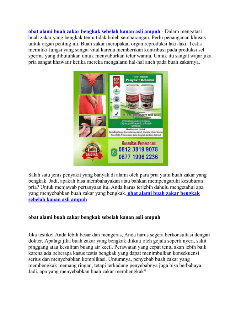 obat alami buah zakar bengkak sebelah kanan asli ampuh - Dalam mengatasi buah zakar yang bengkak tentu tidak boleh sembarangan. Perlu penanganan khusus untuk organ penting ini. Buah zakar merupakan organ reproduksi laki-laki. Testis memiliki fungsi yang sangat vital karena memberikan kontribusi pada produksi sel sperma yang dibutuhkan untuk menyuburkan telur wanita. Untuk itu sangat wajar jika pria sangat khawatir ketika mereka mengalami hal-hal aneh pada buah zakarnya. Salah satu jenis penyakit yang banyak di alami oleh para pria yaitu buah zakar yang bengkak. Jadi, apakah bisa membahayakan atau bahkan mempengaruhi kesuburan pria? Untuk menjawab pertanyaan itu, Anda harus terlebih dahulu mengetahui apa yang menyebabkan buah zakar yang bengkak. obat alami buah zakar bengkak sebelah kanan asli ampuh obat alami buah zakar bengkak sebelah kanan asli ampuh Jika testikel Anda lebih besar dan mengeras, Anda harus segera berkonsultasi dengan dokter. Apalagi jika buah zakar yang bengkak diikuti oleh gejala seperti nyeri, sakit pinggang atau kesulitan buang air kecil. Perawatan yang cepat tentu akan lebih baik karena ada beberapa kasus testis bengkak yang dapat menimbulkan konsekuensi serius dan menyebabkan komplikasi. Umumnya, penyebab buah zakar yang membengkak memang ringan, tetapi terkadang penyebabnya juga bisa berbahaya. Jadi, apa yang menyebabkan buah zakar membengkak? Trauma atau Cedera Testis bengkak dapat terjadi sebagai akibat cedera atau cedera, misalnya akibat kecelakaan, sehingga organ bagian bawah bersentuhan. Karena banyak pria cenderung melakukan lebih banyak kegiatan, seperti latihan fisik, risiko cedera pada pria lebih besar. Selain itu, jika Anda sebelumnya telah melakukan prosedur pembedahan di area genital, seperti vasektomi, testis bengkak dapat menjadi efek samping dan ini akan membaik dengan sendirinya. Radang Testis Orchitis adalah peradangan atau inflamasi akut pada testis yang biasanya sebagai reaksi sekunder infeksi di bagian tubuh yang lain. Inflamasi dapat disebabkan oleh infeksi virus ataupun bakteri. Pada infeksi virus, seperti virus mumps (penyebab gondongan), tidak diperlukan antibiotik dan gejala akan menghilang dalam 4-7 hari. Namun, pada infeksi bakteri akibat penyakit menular seksual, misalnya gonore, klamidia, maka diobati dengan antibiotik, baik suntik ataupun minum. Berikut adalah gejala orchitis : pembengkakan dan nyeri pada salah satu atau kedua testis, kelelahan, nyeri sedang hingga parah pada testis, demam, nyeri kepala, nyeri bagian selangkangan, darah pada cairan sperma, mual dan muntah, nyeri saat buang air kecil, hubungan seks, ataupun ejakulasi, rasa tidak nyaman pada testis. Epididimitis Di belakang kedua buah zakar adalah sejenis jaringan yang disebut epididimis, fungsinya adalah menempatkan sel sperma. Epididimitis berarti peradangan jaringan ini untuk membuat testis terlihat membesar. Ciri utama dari epididimitis adalah jika disentuh, akan ada benjolan kecil nyeri ketika ditekan. Gejala-gejalanya akan sama dengan orkitis, tetapi sebagai tambahan, epididimitis juga dapat menyebabkan darah dalam sperma saat ejakulasi. Varikokel Jika Anda tahu tentang varises, varikokel ini mirip dengan itu. Hanya saja varikokel terjadi di pembuluh darah testis. Varikokel terjadi ketika pembuluh darah (vena) membesar, sehingga darah mengumpul dan tidak mengalir ke jantung. Ini akan terlihat seperti pembuluh darah di sisi atas tas testis dan varises pada kaki. Varikokel sering mengalami pria muda antara 15–25 tahun dan bisa menimbulkan gejala atau tidak. Mereka yang mengalami gejala biasanya merasakan nyeri pada selangkangan dan salah satu buah zakar (biasanya kiri) terlihat membesar. Varises dapat menyebabkan berkurangnya kesuburan dan mengurangi produksi sperma jika tidak segera diobati. Kadang-kadang itu bisa hilang atau juga bisa dioperasi. Uji Torsi Kawanan testis adalah ketika testis berdebat, menyebabkan suplai darah ke testis berhenti dan ini adalah situasi darurat. Gejalanya meliputi rasa sakit yang mendadak, kelemahan, pembengkakan, dan pembesaran testis yang terdistorsi. Perawatan dan perawatan segera diperlukan untuk menyelamatkan testis. Perawatan sering membutuhkan operasi. Jika segera diobati (dalam waktu 6 jam) kemungkinan testis masih dapat disimpan. Tetapi jika sudah terlambat, tidak ada harapan bagi buah zakar Anda Hernia Inguinal Hernia inguinal terjadi ketika dinding perut bagian bawah melemah, sehingga usus turun ke buah zakar atau sisi-sisi penis, membuat testikel tampak lebih besar. Benjolan hernia ini tampaknya duduk atau bergerak. terutama mengangkat benda berat. Tetapi jika posisi Anda di belakang, itu akan kembali normal dan kembali ke perut. Satu-satunya perawatan hernia adalah pembedahan untuk memperbaiki pinggiran dinding perut yang rusak. Kanker Testis Dalam beberapa kasus yang parah, testis bengkak adalah gejala kanker testis, meskipun sangat jarang hanya 1% kasus kanker pada pria dan biasanya tidak menyebar. Kanker testis sangat umum terjadi pada pria berusia 15–44 tahun. Gejala utama kanker testis termasuk pembesaran testis, puting testis, nyeri tumpul dan juga teras testis berat. Kanker testis adalah salah satu jenis kanker yang bisa disembuhkan dengan pengobatan. Perawatan termasuk operasi pengangkatan testis dan kemoterapi. Diagnosis yang lebih cepat berarti bahwa lebih dari 95% dapat sepenuhnya disembuhkan. Beberapa tindakan yang perlu anda lakukan dirumah : Istirahat / bed rest Mengaplikasikan kompres dingin / es ke testis selama 10-15 menit , 4x sehari Mengelevasi testis dengan memberikan ganjalan bantal kecil atau handuk kecil diselangkangan sehngga testis terelevasi untuk mengurangi nyeri. Anda dapat mengkonsumsi antinyeri seperti ibuprofen untuk mengurangi rasa nyeri atau jika ingin lebih aman anda bisa gunakan obat herbal. Pengobatan buah zakar menggunakan obat herbal: Anda bisa menggunakan alternatif pengobatan selain menggunakan obat medis dan operasi yaitu menggunakan obat herbal. Obat herbal kini sudah banyak d