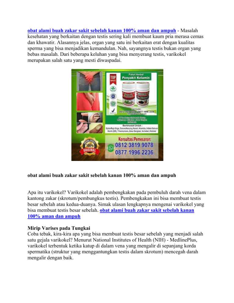 obat alami buah zakar sakit sebelah kanan 100% aman dan ampuh - Masalah kesehatan yang berkaitan dengan testis sering kali membuat kaum pria merasa cemas dan khawatir. Alasannya jelas, organ yang satu ini berkaitan erat dengan kualitas sperma yang bisa menjadikan kemandulan. Nah, sayangnya testis bukan organ yang bebas masalah. Dari beberapa keluhan yang bisa menyerang testis, varikokel merupakan salah satu yang mesti diwaspadai. obat alami buah zakar sakit sebelah kanan 100% aman dan ampuh Apa itu varikokel? Varikokel adalah pembengkakan pada pembuluh darah vena dalam kantong zakar (skrotum/pembungkus testis). Pembengkakan ini bisa membuat testis besar sebelah atau kedua-duanya. Simak ulasan lengkapnya mengenai varikokel yang bisa membuat testis besar sebelah. obat alami buah zakar sakit sebelah kanan 100% aman dan ampuh Mirip Varises pada Tungkai Coba tebak, kira-kira apa yang bisa membuat testis besar sebelah yang menjadi salah satu gejala varikokel? Menurut National Institutes of Health (NIH) - MedlinePlus, varikokel terbentuk ketika katup di dalam vena yang mengalir di sepanjang korda spermatika (struktur yang menggantungkan testis dalam skrotum) mencegah darah mengalir dengan baik. Kondisi ini membuat darah kembali naik, sehingga menyebabkan pembengkakan dan pelebaran pembuluh darah. Pembuluh darah yang membawa darah dari testis ke penis seharusnya enggak teraba atau terasa. Namun, pembuluh darah dan vena tampak seperti banyak cacing dalam skrotum bila varikokel menyerang seseorang. Boleh dibilang, kondisi mirip dengan varises pada tungkai. Masih menurut NIH, dalam kebanyakan kasus varikokel lebih sering terjadi pada pria usia 15 hingga 25. pembengkakannya sering ditemukan pada skrotum sebelah kiri. Sedangkan varikokel pada pria yang lebih tua lain lagi ceritanya. Kondisi ini yang muncul tiba-tiba pada kelompok ini, bisa disebabkan oleh tumor ginjal. Tumor ini yang menghalangi aliran darah vena dan menekan pembuluh vena. Penyebabnya sudah, lalu bagaimana dengan gejalanya? Bukan Hanya Pembengkakan Testis Pada sebagian kasus ada pengidap varikokel yang tidak mengalami gejala. Namun, ada pula pengidapnya yang mengalami keluhan, salah satunya testis yang bengkak sebelah. Selain itu, ada pula gejala-gejala lainnya yang mungkin terjadi, seperti: Skrotum menjadi bengkak; Pembesaran vena terlihat seperti cacing pada skrotum seiring berjalannya waktu; Rasa tidak nyaman pada skrotum; Nyeri makin bertambah saat berdiri atau melakukan aktivitas fisik dalam waktu lama. Nah, andaikan mengalami gejala-gejala di atas, segeralah temui dokter untuk mendapatkan saran dan penanganan yang tepat. Varikokel Bisa Bikin Mandul, Masa Sih? Berbicara varikokel sebenarnya enggak cuma menyoal testis besar sebelah saja. Menurut dalam jurnal NIH - Current Issues in Adolescent Varicocele: Pediatric Urological Perspectives, varikokel merupakan penyebab paling umum dari infertilitas. Kok bisa? Alasannya varikokel bisa membuat suhu di sekitar testis tinggi. Nah, hal ini yang mengganggu pembentukan, fungsi, dan pergerakan sperma. Namun, untungnya kondisi ini mungkin bisa diatasi lewat pembedahan. Selain masalah kemandulan, varikokel juga bisa membuat testis menyusut. Kok bisa? Jadi katup pembuluh vena yang rusak bisa menyebabkan darah terkumpul dan menekan vena. Hal ini dapat meningkatkan paparan toksin dalam darah. Nah, kondisi ini yang mengakibatkan kerusakan pada testis, termasuk penyusutan. Tuh, seram kan? Jadi, jika kamu memiliki keluhan pada testis atau masalah kesehatan, sebaiknya segera periksakan diri dan secepatnya melakukan pengobatan yang tepat. obat alami buah zakar sakit sebelah kanan 100% aman dan ampuh Penelusuran yang terkait dengan obat alami buah zakar sakit sebelah kanan 100% aman dan ampuh : obat tradisional buah zakar bengkak sebelah kanan, obat alami buah zakar bengkak sebelah kanan, obat alami buah zakar bengkak sebelah kiri, "obat apotik buah zakar besar sebelah", obat alami sakit buah zakar sebelah kiri, obat nyeri testis di apotik, obat testis bengkak di apotik, obat tradisional sakit buah zakar sebelah kanan Cara Alami Mengobati Buah Zakar Bengkak - Sakit Buah Zakar - Verikokel Hidrokel - Orchitis - Kencing Nanah/Gonore - ISK - Sipilis/Raja Singa Klamidia - Trikomoniasis Dan Penyakit Lainnya