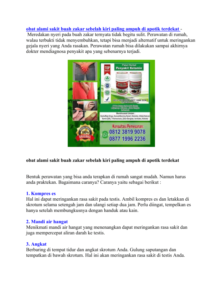 obat alami sakit buah zakar sebelah kiri paling ampuh di apotik terdekat Meredakan nyeri pada buah zakar ternyata tidak begitu sulit. Perawatan di rumah, walau terbukti tidak menyembuhkan, tetapi bisa menjadi alternatif untuk meringankan gejala nyeri yang Anda rasakan. Perawatan rumah bisa dilakukan sampai akhirnya dokter mendiagnosa penyakit apa yang sebenarnya terjadi. obat alami sakit buah zakar sebelah kiri paling ampuh di apotik terdekat Bentuk perawatan yang bisa anda terapkan di rumah sangat mudah. Namun harus anda praktekan. Bagaimana caranya? Caranya yaitu sebagai berikut : 1. Kompres es Hal ini dapat meringankan rasa sakit pada testis. Ambil kompres es dan letakkan di skrotum selama setengah jam dan ulangi setiap dua jam. Perlu diingat, tempelkan es hanya setelah membungkusnya dengan handuk atau kain. 2. Mandi air hangat Menikmati mandi air hangat yang menenangkan dapat meringankan rasa sakit dan juga mempercepat aliran darah ke testis. 3. Angkat Berbaring di tempat tidur dan angkat skrotum Anda. Gulung saputangan dan tempatkan di bawah skrotum. Hal ini akan meringankan rasa sakit di testis Anda. 4. Celana pendukung atletik Anda dapat memakai pembungkus kain di sekitar skrotum atau celana pendukung atletik untuk menghindari cedera lebih lanjut pada testis. Ini juga akan membantu menyingkirkan ketidaknyamanan. obat alami sakit buah zakar sebelah kiri paling ampuh di apotik terdekat Penyebab Buah Zakar/Testis Sakit Apabila terjadi suatu infeksi baik itu di alat reproduksi kita atau di area sekitar alat reproduksi, ada kalanya testis kita terasa sakit dan nyeri, sehingga Anda perlu untuk mewaspadai gangguan tersebut. Inilah beberapa penyebab buah zakar (testis) sakit yang perlu Anda ketahui, di antaranya: 1. Radang testis Radang testis atau orchitis adalah peradangan yang terjadi akibat infeksi pada testis sehingga menyebabkan pembengkakan dan nyeri. Penyakit orchitis ini bisa menyebabkan nyeri pada buah zakar (testis), sehingga mengganggu kesuburan dan aktivitas seksual pada pria. 2. Epididimitis Peradangan yang terjadi pada saluran epididimis ini dikenal dengan istilah medis epididimitis.Epididimitis ini biasa disebabkan oleh infeksi bakteri yang dimulai dari uretra, prostat, atau kandung kemih. Apabila peradangan ini menyebar hingga ke testis, dapat menghambat dan mengganggu proses dari pembentukan sprema ini sendiri. Penyakit ini biasa dikenal dengan sebutan epididymo-orchitis. 3. Hernia inguinalis Ternyata tidak hanya epididimitis saja yang bisa membuat buah zakar sakit. Masalah kesehatan lainnya seperti hernia atau yang biasa disebut dengan turun bero paling umum terjadi dan muncul sebagai tonjolan di selangkangan atau skrotum. Hernia inguinalis terjadi karena usus turun pada bagian lemah pada otot dinding abdomen. Benjolan akibat penurunan usus (hernia) ini biasanya tidak terlalu bermasalah, apabila hanya sebagian kecil usus saja yang prolaps. 4. Hidrokel Penyebab ketiga yang bisa menyebabkan testis nyeri adalah hidrokel. Hidrokel disebabkan oleh penumpukan cairan pada satu atau dua testis pria yang menyebabkan skrotum (kantung testis) membesar. 5. Varikokel Buah zakar sakit adalah penyakit yang tidak diinginkan oleh pria mana pun. Salah satu hal yang bisa membuat testis sakit adalah problem kesehatan yang disebut sebagai varikokel. Varikokel merupakan salah satu gangguan kesehatan pada pembuluh darah di sekitar alat reproduksi pria, yaitu sekitar testis yang menjadi tempat diproduksinya sperma pada pria. 6. Torsi Kondisi ini terjadi ketika salah satu testis Anda terpelintir secara spontan di dalam skrotum yang menyebabkan penurunan aliran darah ke testis yang terpelintir. Kondisi ini juga sangat darurat dan memerlukan penanganan medik yang cepat. 7. Kanker testis Merupakan pertumbuhan cepat dan abnormal dari sel-sel normal testis menjadi sel ganas, yang bisa menyebabkan testis membesar dan nyeri. 8. Batu ureter Penyebab lain yang juga bisa menyebabkan buah zakar sakit adalah batu ureter. Batu ureter disebabkan akibat batu ginjal yang turun ke ureter. Gerakan peristaltik ureter mencoba mendorong batu ke distal menimbulkan kontraksi yang kuat sehingga menimbulkan nyeri pada bagian punggung belakang dan menjalar ke testis. 9. Cedera (trauma) di sekitar testis Trauma mekanis atau aktivitas fisik yang terlalu berat di sekitar selangkangan, dapat menyebabkan nyeri pada testis. Tingkat nyeri yang timbulkannya tergantung dari besarnya keparahan dan derajat trauma mekanis penyebabnya. Dalam keadaan darurat akibat trauma mekanis yang hebat, nyeri pada testis kadang perlu mendapatkan penanganan yang serius dari dokter. obat alami sakit buah zakar sebelah kiri paling ampuh di apotik terdekat Pengobatan yang tepat sangat diperlukan untuk menyembuhkan berbagai penyakit di atas. Jadi sebaiknya anda segera melakukan pemeriksaan dan pengobatan yang tepat dan cepat sebelum terlambat. Penelusuran yang terkait dengan obat alami sakit buah zakar sebelah kiri paling ampuh di apotik terdekat : obat alami buah zakar bengkak sebelah kiri, obat tradisional buah zakar bengkak sebelah kanan, "obat apotik buah zakar besar sebelah", obat nyeri testis di apotik, obat sakit buah zakar sebelah kiri, obat alami buah zakar sakit sebelah kanan, obat tradisional untuk buah zakar bengkak, obat tradisional benjolan di buah zakar Cara Alami Mengobati Buah Zakar Bengkak - Sakit Buah Zakar - Verikokel Hidrokel - Orchitis - Kencing Nanah/Gonore - ISK - Sipilis/Raja Singa Klamidia - Trikomoniasis Dan Penyakit Lainnya