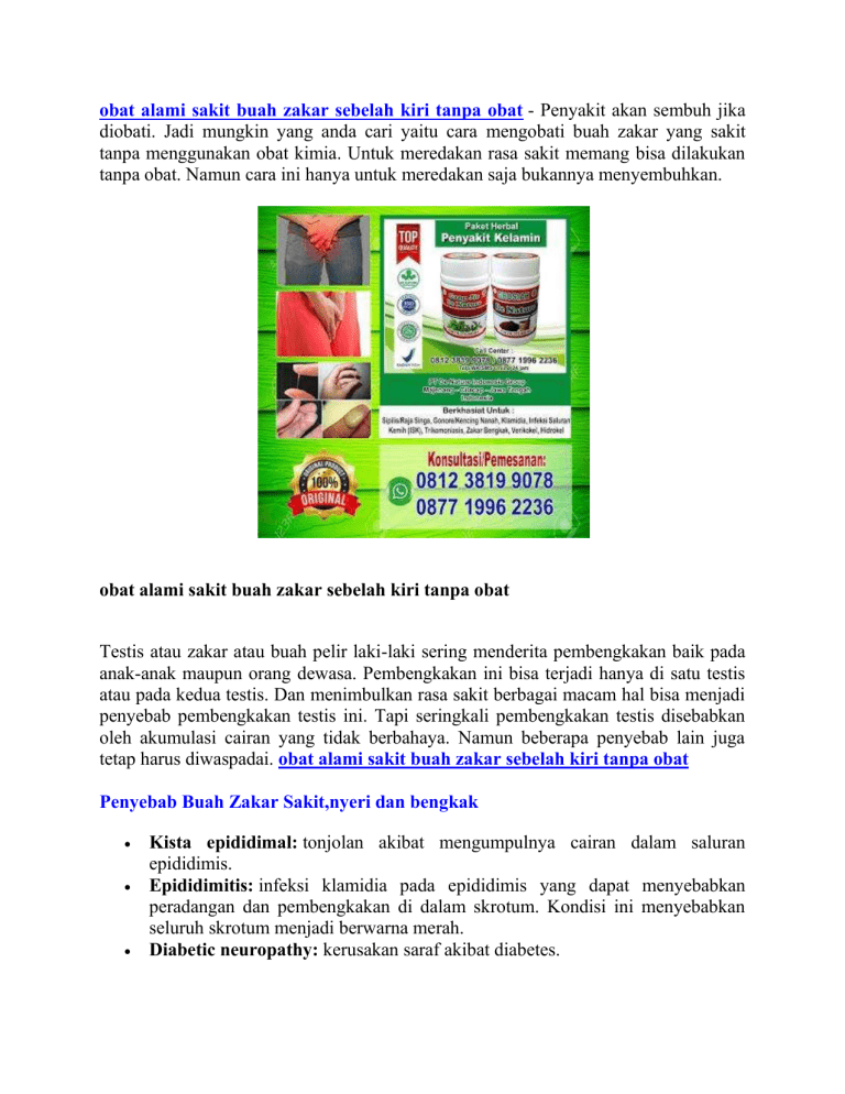 obat alami sakit buah zakar sebelah kiri tanpa obat - Penyakit akan sembuh jika diobati. Jadi mungkin yang anda cari yaitu cara mengobati buah zakar yang sakit tanpa menggunakan obat kimia. Untuk meredakan rasa sakit memang bisa dilakukan tanpa obat. Namun cara ini hanya untuk meredakan saja bukannya menyembuhkan. obat alami sakit buah zakar sebelah kiri tanpa obat Testis atau zakar atau buah pelir laki-laki sering menderita pembengkakan baik pada anak-anak maupun orang dewasa. Pembengkakan ini bisa terjadi hanya di satu testis atau pada kedua testis. Dan menimbulkan rasa sakit berbagai macam hal bisa menjadi penyebab pembengkakan testis ini. Tapi seringkali pembengkakan testis disebabkan oleh akumulasi cairan yang tidak berbahaya. Namun beberapa penyebab lain juga tetap harus diwaspadai. obat alami sakit buah zakar sebelah kiri tanpa obat Penyebab Buah Zakar Sakit,nyeri dan bengkak Kista epididimal: tonjolan akibat mengumpulnya cairan dalam saluran epididimis. Epididimitis: infeksi klamidia pada epididimis yang dapat menyebabkan peradangan dan pembengkakan di dalam skrotum. Kondisi ini menyebabkan seluruh skrotum menjadi berwarna merah. Diabetic neuropathy: kerusakan saraf akibat diabetes. Hydrocele: penumpukan cairan yang menyebabkan pembengkakan pada skrotum. Hernia inguinalis: penonjolan jaringan lunak, melalui bagian yang lemah atau robek di bagian bawah dinding perut di lipatan paha. Sehingga menyebabkan skrotum menjadi membesar. Batu ginjal. Kanker testikular. Testikel yang tertarik ke area di antara perut dan paha. Peradangan testikel atau orchitis. Massa skrotal: kelainan isi skrotum yang mengakibatkan bagian luar kulitnya bergantung pada bagian belakang penis. Spermatocele: pengumpulan cairan pada testikel. Testikel terpelintir: nyeri yang datang tiba-tiba pada testikel/buah zakar dapat menjadi gejala terjadinya testikel yang terpelintir. Kondisi ini dapat mengakibatkan terputusnya aliran darah sehingga memerlukan penanganan darurat. Cedera pada testikel. Infeksi saluran kencing. Testis yang tidak turun (cryptorchidism). Vasektomi atau sterilisasi pada pria. Varikokel: pembengkakan akibat pembesaran pembuluh pada skrotum. Benjolan dan pembengkakan pada testis: umumnya disebabkan oleh kondisi yang tidak bersifat kanker dan sebagian besar tidak memerlukan perawatan khusus. PENGOBATAN ALAMI RUMAHAN SAAT BUAH ZAKAR NYERI 1. Kompres es Hal ini dapat meringankan rasa sakit pada testisg. Ambil kompres es dan letakkan di skrotum selama setengah jam dan ulangi setiap dua jam. Perlu diingat, tempelkan es hanya setelah membungkusnya dengan handuk atau kain. 2. Mandi air hangat Menikmati mandi air hangat yang menenangkan dapat meringankan rasa sakit dan juga mempercepat aliran darah ke testis. 3. Angkat Berbaring di tempat tidur dan angkat skrotum Anda. Gulung saputangan dan tempatkan di bawah skrotum. Hal ini akan meringankan rasa sakit di testis Anda. 4. Celana pendukung atletik Anda dapat memakai pembungkus kain di sekitar skrotum atau celana pendukung atletik untuk menghindari cedera lebih lanjut pada testis. Ini juga akan membantu menyingkirkan ketidaknyamanan. Pengobatan yang biasa digunakan untuk mengobati buah zakar sakit dan atau bengkak yaitu dengan cara operasi, mengkonsumsi obat kimia dan mengkonsumsi obat herbal. Pilihlah obat dan pengobatan yang tepat yang aman untuk digunakan dan tidak berbahaya untuk tubuh. Penelusuran yang terkait dengan obat alami sakit buah zakar sebelah kiri tanpa obat : obat sakit buah zakar sebelah kiri, obat alami buah zakar bengkak sebelah kiri, obat alami buah zakar sakit sebelah kanan, obat tradisional benjolan di buah zakar, obat alami buah zakar bengkak sebelah kanan, buah zakar sakit sebelah kiri kenapa ya, "obat apotik buah zakar besar sebelah", cara mengatasi sakit buah zakar sebelah kiri Cara Alami Mengobati Buah Zakar Bengkak - Sakit Buah Zakar - Verikokel Hidrokel - Orchitis - Kencing Nanah/Gonore - ISK - Sipilis/Raja Singa Klamidia - Trikomoniasis Dan Penyakit Lainnya