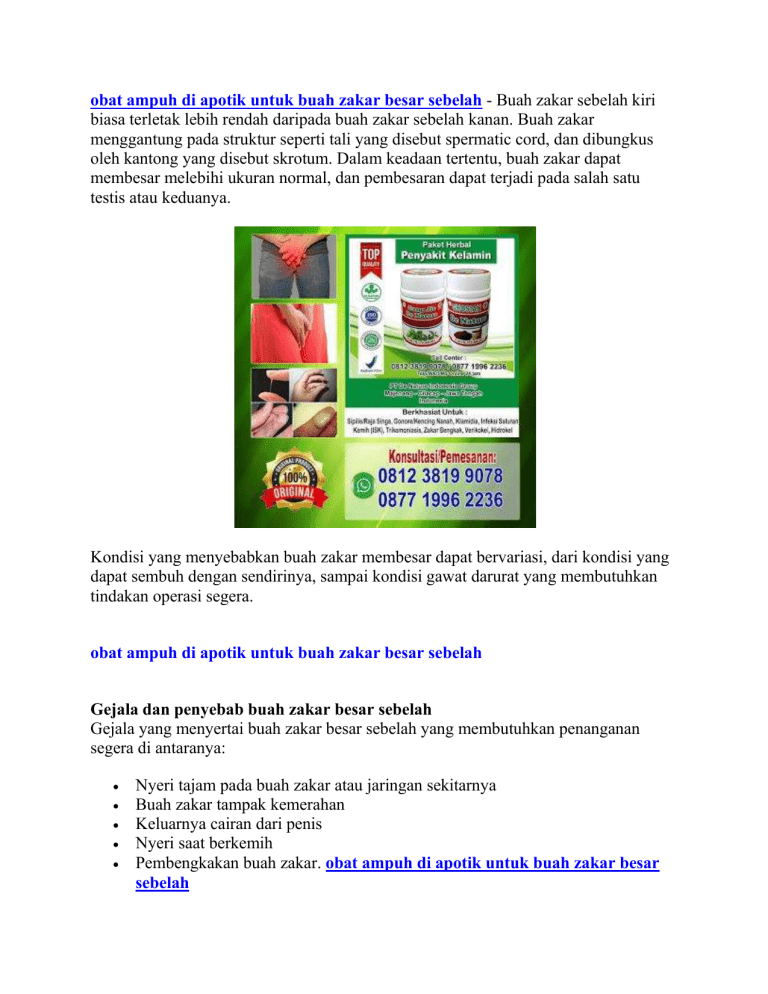 obat ampuh di apotik untuk buah zakar besar sebelah - Buah zakar sebelah kiri biasa terletak lebih rendah daripada buah zakar sebelah kanan. Buah zakar menggantung pada struktur seperti tali yang disebut spermatic cord, dan dibungkus oleh kantong yang disebut skrotum. Dalam keadaan tertentu, buah zakar dapat membesar melebihi ukuran normal, dan pembesaran dapat terjadi pada salah satu testis atau keduanya. Kondisi yang menyebabkan buah zakar membesar dapat bervariasi, dari kondisi yang dapat sembuh dengan sendirinya, sampai kondisi gawat darurat yang membutuhkan tindakan operasi segera. obat ampuh di apotik untuk buah zakar besar sebelah Gejala dan penyebab buah zakar besar sebelah Gejala yang menyertai buah zakar besar sebelah yang membutuhkan penanganan segera di antaranya: Nyeri tajam pada buah zakar atau jaringan sekitarnya Buah zakar tampak kemerahan Keluarnya cairan dari penis Nyeri saat berkemih Pembengkakan buah zakar. obat ampuh di apotik untuk buah zakar besar sebelah Sementara itu, terdapat beberapa hal yang menjadi penyebab buah zakar besar sebelah, di antaranya: 1. Trauma atau cedera Testis membengkak bisa terjadi karena adanya cedera atau luka, misalnya mengalami kecelakaan sehingga organ bawah terbentur. Karena banyak pria cenderung beraktivitas lebih banyak seperti berolahraga, kemungkinan cedera pada pria lebih besar. Selain itu, jika sebelumnya pernah melakukan operasi bedah di area genital seperti vasektomi, bisa jadi testis bengkak adalah efek samping dari hal tersebut, dan ini akan membaik dengan sendirinya. 2. Radang testis (orkitis) Orkitis adalah peradangan pada jaringan testis yang menyebabkah pembengkakan pada testis. Penyebab tersering orkitis adalah infeksi bakteri atau juga penyakit menular seksual (pada pria yang aktif secara seksual). Namun terkadang orkitis juga bisa disebabkan infeksi virus, biasanya pada anak-anak. Gejala dari orkitis ialah bengkak pada salah satu testis disertai rasa nyeri, demam ringan dan juga mual-mual. 3. Epididimitis Di belakang kedua testis terdapat semacam jaringan yang disebut epididimis, fungsinya adalah sebagai tempat pematangan sel sperma. Epididimitis berarti adanya peradangan pada jaringan ini sehingga membuat testis terlihat membesar. Ciri utama dari epididimitis adalah jika diraba akan terdapat semacam benjolan kecil terasa sakit ketika ditekan. Gejalanya akan sama seperti orkitis, namun selain itu epididimitis juga bisa menyebabkan adanya darah dalam sperma saat ejakulasi. 4. Varikokel Jika Anda mengetahui tentang penyakit varises, maka varikokel ini mirip dengan itu. Hanya saja varikokel terjadi pada pembuluh darah testis. Varikokel terjadi ketika pembuluh darah balik (vena) mengalami pembesaran, sehingga darah akan terkumpul dan tidak mengalir ke jantung. Akan tampak seperti tonjolan-tonjolan urat di samping atas kantung testis sebagaimana varises pada kaki. Varikokel umum dialami pria muda antara 15-25 tahun dan bisa menimbulkan gejala maupun tidak. Mereka yang mengalami gejala biasanya merasakan nyeri pada selangkangan dan salah satu testis (biasanya kiri) terlihat membesar. Varikokel dapat menyebabkan gangguan kesuburan dan produksi sperma menurun jika tidak segara diobati. Meski demikian, terkadang bisa hilang sendiri atau bisa juga membutuhkan operasi pembedahan. 5. Hernia inguinal Hernia inguinal terjadi ketika dinding perut bagian bawah melemah sehingga usus turun ke kantung testis atau bagian samping penis, menyebabkan testis terlihat lebih besar. Benjolan hernia ini muncul ketika duduk atau beraktivitas. terutama mengangkat benda-benda berat. Namun ketika posisi anda terlentang akan kembali normal dan masuk kembali ke perut. Pengobatan hernia satu-satunya ialah dengan melakukan operasi untuk memperbaiki dinding perut yang robek. 6. Kanker testis Pada beberapa kasus yang serius, testis bengkak merupakan gejala dari kanker testis, meski sangat jarang terjadi hanya 1% saja dari kasus kanker pada pria dan biasanya tidak menyebar. Kanker testis sangat umum pada pria usia 15-44 tahun. Gejala utama kanker testis termasuk pembesaran testis, benjolan di testis, nyeri tumpul dan juga testis teras berat. Kanker testis adalah salah satu jenis kanker yang bisa sembuh dengan pengobatan. Perawatannya termasuk operasi pengangkatan testis dan kemoterapi. Diagnosis lebih cepat berarti lebih dari 95% dapat sembuh total. 7. Torsio testis Torsio testis yaitu ketika testis mengalami puntiran sehingga menyebabkan aliran darah ke testis terhenti dan ini adalah kondisi darurat. Gejalanya termasuk nyeri yang parah secara tiba-tiba, kelemahan, bengkak dan pembesaran pada testis yang terpuntir. Penanganan dan juga perawatan sesegera mungkin sangat diperlukan untuk menyelamatkan testis. Penanganannya sering kali membutuhkan operasi. Jika segera ditangani (dalam waktu 6 jam) kemungkinan besar testis masih bisa diselamatkan. Tapi jika terlambat ditangani, tidak ada harapan untuk testis anda. obat ampuh di apotik untuk buah zakar besar sebelah Penanganan yang cepat tentunya akan lebih baik sebab ada beberapa kasus testis bengkak yang dapat berdampak serius dan menyebabkan komplikasi. Umumnya penyebab testis bengkak adalah hal-hal yang ringan tapi terkadang penyebabnya juga bisa bahaya dan perlu dilakukan tindakan operasi. Penelusuran yang terkait dengan obat ampuh di apotik untuk buah zakar besar sebelah : obat testis bengkak di apotik, "obat apotik buah zakar besar sebelah", obat alami buah zakar bengkak sebelah kiri, obat tradisional buah zakar bengkak sebelah kanan, obat nyeri testis di apotik, obat alami buah zakar bengkak sebelah kanan, obat alami sakit buah zakar sebelah kiri Cara Alami Mengobati Buah Zakar Bengkak - Sakit Buah Zakar - Verikokel Hidrokel - Orchitis - Kencing Nanah/Gonore - ISK - Sipilis/Raja Singa Klamidia - Trikomoniasis Dan Penyakit Lainnya
