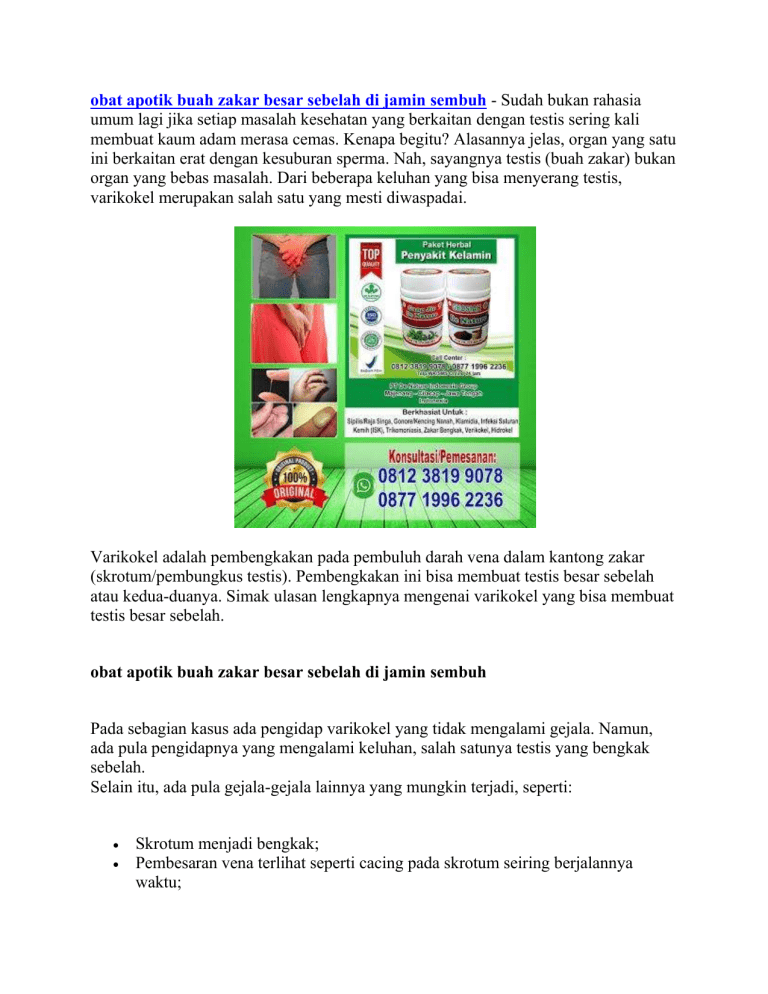 obat apotik buah zakar besar sebelah di jamin sembuh - Sudah bukan rahasia umum lagi jika setiap masalah kesehatan yang berkaitan dengan testis sering kali membuat kaum adam merasa cemas. Kenapa begitu? Alasannya jelas, organ yang satu ini berkaitan erat dengan kesuburan sperma. Nah, sayangnya testis (buah zakar) bukan organ yang bebas masalah. Dari beberapa keluhan yang bisa menyerang testis, varikokel merupakan salah satu yang mesti diwaspadai. Varikokel adalah pembengkakan pada pembuluh darah vena dalam kantong zakar (skrotum/pembungkus testis). Pembengkakan ini bisa membuat testis besar sebelah atau kedua-duanya. Simak ulasan lengkapnya mengenai varikokel yang bisa membuat testis besar sebelah. obat apotik buah zakar besar sebelah di jamin sembuh Pada sebagian kasus ada pengidap varikokel yang tidak mengalami gejala. Namun, ada pula pengidapnya yang mengalami keluhan, salah satunya testis yang bengkak sebelah. Selain itu, ada pula gejala-gejala lainnya yang mungkin terjadi, seperti: Skrotum menjadi bengkak; Pembesaran vena terlihat seperti cacing pada skrotum seiring berjalannya waktu; Rasa tidak nyaman pada skrotum; Nyeri makin bertambah saat berdiri atau melakukan aktivitas fisik dalam waktu lama. Nah, andaikan mengalami gejala-gejala di atas, segeralah temui dokter untuk mendapatkan saran dan penanganan yang tepat. obat apotik buah zakar besar sebelah di jamin sembuh Varikokel Mirip Varises pada Tungkai Coba tebak, kira-kira apa yang bisa membuat testis besar sebelah yang menjadi salah satu gejala varikokel? Menurut National Institutes of Health (NIH) - MedlinePlus, varikokel terbentuk ketika katup di dalam vena yang mengalir di sepanjang korda spermatika (struktur yang menggantungkan testis dalam skrotum) mencegah darah mengalir dengan baik. Kondisi ini membuat darah kembali naik, sehingga menyebabkan pembengkakan dan pelebaran pembuluh darah. Pembuluh darah yang membawa darah dari testis ke penis seharusnya enggak teraba atau terasa. Namun, pembuluh darah dan vena tampak seperti banyak cacing dalam skrotum bila varikokel menyerang seseorang. Boleh dibilang, kondisi mirip dengan varises pada tungkai. Masih menurut NIH, dalam kebanyakan kasus varikokel lebih sering terjadi pada pria usia 15 hingga 25. pembengkakannya sering ditemukan pada skrotum sebelah kiri. Sedangkan varikokel pada pria yang lebih tua lain lagi ceritanya. Kondisi ini yang muncul tiba-tiba pada kelompok ini, bisa disebabkan oleh tumor ginjal. Tumor ini yang menghalangi aliran darah vena dan menekan pembuluh vena. obat apotik buah zakar besar sebelah di jamin sembuh Varikokel Bisa Bikin Mandul, Masa Sih? Berbicara varikokel sebenarnya enggak cuma menyoal testis besar sebelah saja. Menurut dalam jurnal NIH - Current Issues in Adolescent Varicocele: Pediatric Urological Perspectives, varikokel merupakan penyebab paling umum dari infertilitas. Kok bisa? Alasannya varikokel bisa membuat suhu di sekitar testis tinggi. Nah, hal ini yang mengganggu pembentukan, fungsi, dan pergerakan sperma. Namun, untungnya kondisi ini mungkin bisa diatasi lewat pembedahan. Selain masalah kemandulan, varikokel juga bisa membuat testis menyusut. Kok bisa? Jadi katup pembuluh vena yang rusak bisa menyebabkan darah terkumpul dan menekan vena. Hal ini dapat meningkatkan paparan toksin dalam darah. Nah, kondisi ini yang mengakibatkan kerusakan pada testis, termasuk penyusutan. Tuh, seram kan? Jadi, jika kamu memiliki keluhan pada testis atau masalah kesehatan, sebaiknya segera periksakan ke rumah sakit terdekat. Penelusuran yang terkait dengan obat apotik buah zakar besar sebelah di jamin sembuh : obat tradisional buah zakar bengkak sebelah kanan, obat testis bengkak di apotik, obat alami buah zakar bengkak sebelah kiri, obat alami buah zakar bengkak sebelah kanan, obat nyeri testis di apotik Cara Alami Mengobati Buah Zakar Bengkak - Sakit Buah Zakar - Verikokel Hidrokel - Orchitis - Kencing Nanah/Gonore - ISK - Sipilis/Raja Singa Klamidia - Trikomoniasis Dan Penyakit Lainnya