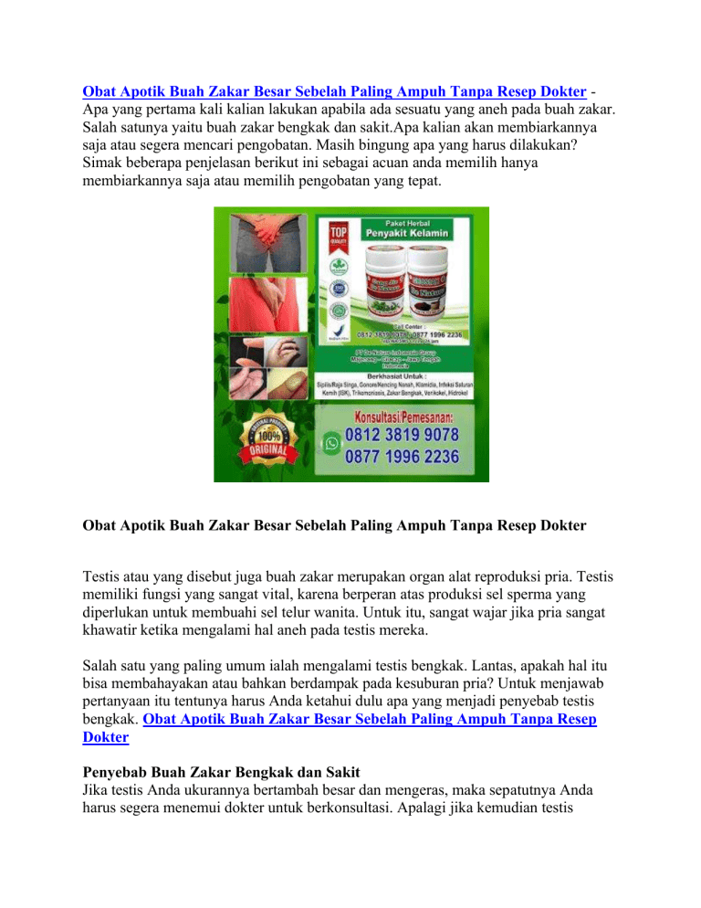 Obat Apotik Buah Zakar Besar Sebelah Paling Ampuh Tanpa Resep Dokter Apa yang pertama kali kalian lakukan apabila ada sesuatu yang aneh pada buah zakar. Salah satunya yaitu buah zakar bengkak dan sakit.Apa kalian akan membiarkannya saja atau segera mencari pengobatan. Masih bingung apa yang harus dilakukan? Simak beberapa penjelasan berikut ini sebagai acuan anda memilih hanya membiarkannya saja atau memilih pengobatan yang tepat. Obat Apotik Buah Zakar Besar Sebelah Paling Ampuh Tanpa Resep Dokter Testis atau yang disebut juga buah zakar merupakan organ alat reproduksi pria. Testis memiliki fungsi yang sangat vital, karena berperan atas produksi sel sperma yang diperlukan untuk membuahi sel telur wanita. Untuk itu, sangat wajar jika pria sangat khawatir ketika mengalami hal aneh pada testis mereka. Salah satu yang paling umum ialah mengalami testis bengkak. Lantas, apakah hal itu bisa membahayakan atau bahkan berdampak pada kesuburan pria? Untuk menjawab pertanyaan itu tentunya harus Anda ketahui dulu apa yang menjadi penyebab testis bengkak. Obat Apotik Buah Zakar Besar Sebelah Paling Ampuh Tanpa Resep Dokter Penyebab Buah Zakar Bengkak dan Sakit Jika testis Anda ukurannya bertambah besar dan mengeras, maka sepatutnya Anda harus segera menemui dokter untuk berkonsultasi. Apalagi jika kemudian testis bengkak yang Anda alami diikuti dengan gejala seperti rasa nyeri, sakit pinggang atau sulit buang air kecil. Penanganan yang cepat tentunya akan lebih baik sebab ada beberapa kasus testis bengkak yang dapat berdampak serius dan menyebabkan komplikasi. Umumnya penyebab testis bengkak adalah hal-hal yang ringan tapi terkadang penyebabnya juga bisa bahaya. Lantas, apa penyebab testis bengkak? 1. Trauma atau cedera Testis membengkak bisa terjadi karena adanya cedera atau luka, misalnya mengalami kecelakaan sehingga organ bawah terbentur. Karena banyak pria cenderung beraktivitas lebih banyak seperti berolahraga, kemungkinan cedera pada pria lebih besar. Selain itu, jika sebelumnya pernah melakukan operasi bedah di area genital seperti vasektomi, bisa jadi testis bengkak adalah efek samping dari hal tersebut, dan ini akan membaik dengan sendirinya. 2. Radang testis (orkitis) Orkitis adalah peradangan pada jaringan testis yang menyebabkah pembengkakan pada testis. Penyebab tersering orkitis adalah infeksi bakteri atau juga penyakit menular seksual (pada pria yang aktif secara seksual). Namun terkadang orkitis juga bisa disebabkan infeksi virus, biasanya pada anak-anak. Gejala dari orkitis ialah bengkak pada salah satu testis disertai rasa nyeri, demam ringan dan juga mual-mual. Penyakit ini perlu segera dilakukan pengobatan yang tepat. 3. Epididimitis Di belakang kedua testis terdapat semacam jaringan yang disebut epididimis, fungsinya adalah sebagai tempat pematangan sel sperma. Epididimitis berarti adanya peradangan pada jaringan ini sehingga membuat testis terlihat membesar. Ciri utama dari epididimitis adalah jika diraba akan terdapat semacam benjolan kecil terasa sakit ketika ditekan. Gejalanya akan sama seperti orkitis, namun selain itu epididimitis juga bisa menyebabkan adanya darah dalam sperma saat ejakulasi. Sebaiknya jangan menunda pengobatan jika mengalami penyakit yang satu ini. 4. Varikokel Jika Anda mengetahui tentang penyakit varises, maka varikokel ini mirip dengan itu. Hanya saja varikokel terjadi pada pembuluh darah testis. Varikokel terjadi ketika pembuluh darah balik (vena) mengalami pembesaran, sehingga darah akan terkumpul dan tidak mengalir ke jantung. Akan tampak seperti tonjolan-tonjolan urat di samping atas kantung testis sebagaimana varises pada kaki. Varikokel umum dialami pria muda antara 15-25 tahun dan bisa menimbulkan gejala maupun tidak. Mereka yang mengalami gejala biasanya merasakan nyeri pada selangkangan dan salah satu testis (biasanya kiri) terlihat membesar. Varikokel dapat menyebabkan gangguan kesuburan dan produksi sperma menurun jika tidak segara diobati. Meski demikian, terkadang bisa hilang sendiri atau bisa juga membutuhkan operasi pembedahan. 5. Hernia inguinal Hernia inguinal terjadi ketika dinding perut bagian bawah melemah sehingga usus turun ke kantung testis atau bagian samping penis, menyebabkan testis terlihat lebih besar. Benjolan hernia ini muncul ketika duduk atau beraktivitas. terutama mengangkat benda-benda berat. Namun ketika posisi anda terlentang akan kembali normal dan masuk kembali ke perut. Pengobatan hernia satu-satunya ialah dengan melakukan operasi untuk memperbaiki dinding perut yang robek. 6. Torsio testis Torsio testis yaitu ketika testis mengalami puntiran sehingga menyebabkan aliran darah ke testis terhenti dan ini adalah kondisi darurat. Gejalanya termasuk nyeri yang parah secara tiba-tiba, kelemahan, bengkak dan pembesaran pada testis yang terpuntir. Penanganan dan juga perawatan sesegera mungkin sangat diperlukan untuk menyelamatkan testis. Penanganannya sering kali membutuhkan operasi. Jika segera ditangani (dalam waktu 6 jam) kemungkinan besar testis masih bisa diselamatkan. Tapi jika terlambat ditangani, tidak ada harapan untuk testis anda. 7. Kanker testis Pada beberapa kasus yang serius, testis bengkak merupakan gejala dari kanker testis, meski sangat jarang terjadi hanya 1% saja dari kasus kanker pada pria dan biasanya tidak menyebar. Kanker testis sangat umum pada pria usia 15-44 tahun. Gejala utama kanker testis termasuk pembesaran testis, benjolan di testis, nyeri tumpul dan juga testis teras berat. Kanker testis adalah salah satu jenis kanker yang bisa sembuh dengan pengobatan. Perawatannya termasuk operasi pengangkatan testis dan kemoterapi. Diagnosis lebih cepat berarti lebih dari 95% dapat sembuh total. Penelusuran yang terkait dengan Obat Apotik Buah Zakar Besar Sebelah Paling Ampuh Tanpa Resep Dokter : obat alami buah zakar bengkak sebelah kiri, obat tradisional buah zakar bengkak sebelah kanan, obat alami buah zakar bengkak sebelah kanan, obat nyeri testis di apotik Cara Alami Mengobati Buah Zakar Bengkak 
