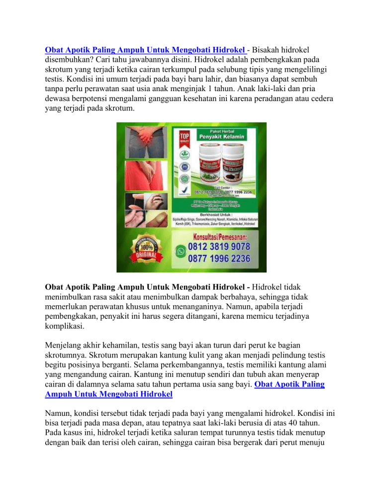 Obat Apotik Paling Ampuh Untuk Mengobati Hidrokel - Bisakah hidrokel disembuhkan? Cari tahu jawabannya disini. Hidrokel adalah pembengkakan pada skrotum yang terjadi ketika cairan terkumpul pada selubung tipis yang mengelilingi testis. Kondisi ini umum terjadi pada bayi baru lahir, dan biasanya dapat sembuh tanpa perlu perawatan saat usia anak menginjak 1 tahun. Anak laki-laki dan pria dewasa berpotensi mengalami gangguan kesehatan ini karena peradangan atau cedera yang terjadi pada skrotum. Obat Apotik Paling Ampuh Untuk Mengobati Hidrokel - Hidrokel tidak menimbulkan rasa sakit atau menimbulkan dampak berbahaya, sehingga tidak memerlukan perawatan khusus untuk menanganinya. Namun, apabila terjadi pembengkakan, penyakit ini harus segera ditangani, karena memicu terjadinya komplikasi. Menjelang akhir kehamilan, testis sang bayi akan turun dari perut ke bagian skrotumnya. Skrotum merupakan kantung kulit yang akan menjadi pelindung testis begitu posisinya berganti. Selama perkembangannya, testis memiliki kantung alami yang mengandung cairan. Kantung ini menutup sendiri dan tubuh akan menyerap cairan di dalamnya selama satu tahun pertama usia sang bayi. Obat Apotik Paling Ampuh Untuk Mengobati Hidrokel Namun, kondisi tersebut tidak terjadi pada bayi yang mengalami hidrokel. Kondisi ini bisa terjadi pada masa depan, atau tepatnya saat laki-laki berusia di atas 40 tahun. Pada kasus ini, hidrokel terjadi ketika saluran tempat turunnya testis tidak menutup dengan baik dan terisi oleh cairan, sehingga cairan bisa bergerak dari perut menuju skrotum. Selain itu, penyakit ini juga bisa terjadi karena peradangan atau cedera pada skrotum, seperti akibat dari epididimitis atau kondisi lainnya. Satu-satunya gejala yang menjadi indikasi hidrokel adalah skrotum yang mengalami pembengkakan. Hal ini karena hidrokel tidak menimbulkan rasa sakit, sehingga gejala hampir tidak bisa terdiagnosis dengan baik. Pada pria dewasa, dapat terasa berat pada bagian ini. Pada beberapa kasus, pembengkakan akan lebih buruk di pagi hari dibandingkan saat malam. Obat Apotik Paling Ampuh Untuk Mengobati Hidrokel KOMPLIKASI HIDROKEL Segera hubungi dokter apabila kamu merasakan rasa sakit yang begitu para pada bagian skrotum. Meski bisa sembuh dengan sendirinya, beberapa orang mengalami komplikasi yang cukup serius. Apa saja? Torsio Testis Torsio testis terjadi ketika testis berubah bentuk menjadi agak bengkok, biasanya sebagai akibat dari cedera atau kecelakaan. Gangguan kesehatan ini termasuk ke dalam keadaan darurat medis karena menyebabkan suplai darah tersumbat ke testis dan bisa berujung pada infertilitas jika tidak segera ditangani. Infeksi atau Tumor Infeksi atau tumor akibat dari hidrokel yang parah bisa berhubungan dengan berkurangnya produksi sperma dan kemampuannya untuk membuahi sel telur. Ini, tentu saja, mengarah pada penurunan kesuburan untuk pria. Hernia Inguinalis Disebut juga turun berok, hernia inguinalis merupakan menonjolnya jaringan lunak yang berada di dalam tubuh melalui bagian yang lebih lemah, atau terjadinya robek jaringan lunak pada perut bagian bawah, dekat dengan lipatan pada paha bagian depan. Akibatnya, muncul tonjolan pada area selangkangan yang terasa ketika kamu melakukan aktivitas berat. Obat Apotik Paling Ampuh Untuk Mengobati Hidrokel Obat Apotik Paling Ampuh Untuk Mengobati Hidrokel - Itu tadi tiga penyakit serius yang diawali dari hidrokel yang tidak ditangani dengan baik atau justru terlambat penanganan. Jadi, jika kamu merasa ukuran testis berbeda dan berat pada salah satu sisi, jangan ragu untuk langsung bertanya pada dokter atau kepada ahli kesehatan. Cepatlah berkonsultasi kepada dokter atau kepada kami agar segera ditemukan solusinya. Obat Apotik Paling Ampuh Untuk Mengobati Hidrokel Penelusuran yang terkait dengan Obat Apotik Paling Ampuh Untuk Mengobati Hidrokel : daun obat hidrokel, tanaman obat untuk hidrokel, obat tradisional hidrokel, mengobati hidrokel dengan jeruk nipis, cara mengobati hidrokel dengan jeruk nipis, hidrokel sembuh, jeruk nipis untuk hidrokel, biaya operasi hidrokel 2018 Cara Alami Mengobati Buah Zakar Bengkak - Sakit Buah Zakar - Verikokel Hidrokel - Orchitis - Kencing Nanah/Gonore - ISK - Sipilis/Raja Singa Klamidia - Trikomoniasis Dan Penyakit Lainnya