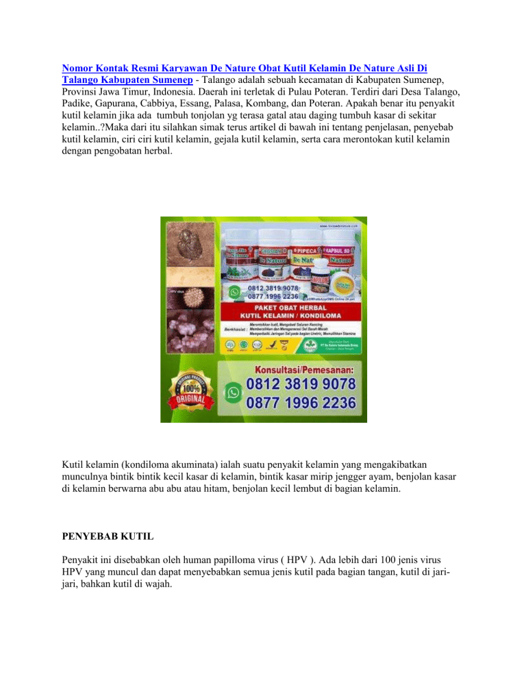 Nomor Kontak Resmi Karyawan De Nature Obat Kutil Kelamin De Nature Asli Di Talango Kabupaten Sumenep - Talango adalah sebuah kecamatan di Kabupaten Sumenep, Provinsi Jawa Timur, Indonesia. Daerah ini terletak di Pulau Poteran. Terdiri dari Desa Talango, Padike, Gapurana, Cabbiya, Essang, Palasa, Kombang, dan Poteran. Apakah benar itu penyakit kutil kelamin jika ada tumbuh tonjolan yg terasa gatal atau daging tumbuh kasar di sekitar kelamin..?Maka dari itu silahkan simak terus artikel di bawah ini tentang penjelasan, penyebab kutil kelamin, ciri ciri kutil kelamin, gejala kutil kelamin, serta cara merontokan kutil kelamin dengan pengobatan herbal. Kutil kelamin (kondiloma akuminata) ialah suatu penyakit kelamin yang mengakibatkan munculnya bintik bintik kecil kasar di kelamin, bintik kasar mirip jengger ayam, benjolan kasar di kelamin berwarna abu abu atau hitam, benjolan kecil lembut di bagian kelamin. PENYEBAB KUTIL Penyakit ini disebabkan oleh human papilloma virus ( HPV ). Ada lebih dari 100 jenis virus HPV yang muncul dan dapat menyebabkan semua jenis kutil pada bagian tangan, kutil di jarijari, bahkan kutil di wajah. Kutil pada kelamin umumnya akan menginfeksi manusia tidak pandang bulu, baik wanita dan pria bisa terkena kutil kelamin, akan tapi biasanya wanita lebih rentan terkena penyakit HPV genital ini. Nomor Kontak Resmi Karyawan De Nature Obat Kutil Kelamin De Nature Asli Di Talango Kabupaten Sumenep Penyakit kondiloma akuminata atau kutil kelamin dapat ditularkan dari orang ke orang melalui kontak kulit ke kulit. Hal ini biasanya meliputi aktivitas seksual, seperti: - Seks vaginal. - Seks anal. - Oral seks. - Seks toys. 10 GEJALA KUTIL PADA PRIA & WANITA 1. Terasa Gatal Pada Kelamin. 2. Tonjolan Kutil Berisi Daging. 3. Bentuk Kutil Kecil. 4. Bengkak sekitar kelamin 5. Mirip Jengger Ayam. 6. Seperti Kembang Kol. 7. Nyeri Pada Kelamin. 8. Tumbuh Benjolan Kecil Kasar Di Kelamin Secara Bergerombol. 9. Di Wanita Kutil Kelamin Muncul Di Bibir Vagina, Serviks, Vagina. 10.Warna Kutil Pada Kelamin Hitam Agak Kemerahan, Abu-Abu Agak Kemerahan, Cokelat Agak Kemerahan Dan Juga Merah. Bisa dilihat di chanel youtube kami : Review Lengkap Aturan Pemakaian Obat Kutil Kelamin De Nature Yang Benar OBAT KUTIL KELAMIN ASLI ORIGINAL Informasi untuk kenyamanan anda, bahwa Produk dari perusahaan kami ini sudah memiliki: - Bersertifikat ISO 9001:2015 - Ijin Resmi Perusahaan dari Kementerian Kesehatan - Ijin BPOM, yang artinya sudah lulus Uji Stabilitas Produk - Sertifikat Halal MUI, sehingga kehalalannya bisa dipertanggung jawabkan - Apoteker Yang berpengalaman - Sudah melewati Proses Sortir Bahan Baku, Guna Menjaga Mutu Produk - Proses Produksi Sesuai Alur CPOTB (Cara Pembuatan Obat Tradisional Yang Baik Dan Benar) Penelusuran yang terkait : de nature penipu obat kutil kelamin de nature paket 2 testimoni de nature kutil kelamin review obat kutil kelamin de nature testimoni obat kutil kelamin de nature rekening resmi de nature obat kutil kelamin alami yang ampuh Baca Juga : Obat Kutil Denature