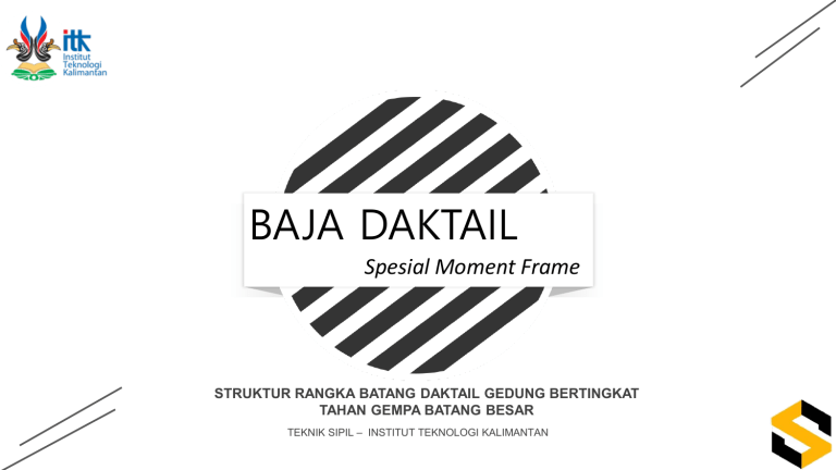 BAJA DAKTAIL Spesial Moment Frame STRUKTUR RANGKA BATANG DAKTAIL GEDUNG BERTINGKAT TAHAN GEMPA BATANG BESAR TEKNIK SIPIL – INSTITUT TEKNOLOGI KALIMANTAN INTRODUCTION Alvin Renaldi 07171007 Melsy Pasarrin 07171043 Spesial Moment Frame STRUKTUR RANGKA BATANG DAKTAIL GEDUNG BERTINGKAT TAHAN GEMPA BATANG BESAR Hidajat Sugihardjo M, 2007 LATAR BELAKANG Letak Indonesia yang merupakan pertemuan tiga lempeng yaitu lempeng Indo-Australia, le mpeng Pasifik dan lempeng Eurasia, menyeba bkan hampir semua wilayah Indonesia memp unyai resiko gempa tektonik tinggi). PENDAHULUAN Standar baja Indonesia, sistem struktur baja harus dapat digolongkan dalam salah satu dari lima sistem, yaitu : Sistem Dinding Penumpu, Sistem Rangka Bangunan, Sistem Rangka Pemikul Momen, Sistem Ganda dan Sistem Bangunan Kolom Kantilever. Sistem Struktur Rangka Batang Daktail Untuk Gedung Bertingkat Ta han Gempa Bentang Besar dimasukkan dalam golongan Sistem Ran gka Pemikul Momen (baik biasa atau konvensional maupun khusus) yang berdiri sendiri maupun Sistem Ganda, dimana bersama rangka pemikul beban gravitasi, bersama-sama memikul beban lateral. Baja Daktail Spesial Moment Frame SISTEM RANGKA PEMIKUL MOMEN Filosofi Konvensional “Balok Kuat Kolom Lemah” Dan “Bentang yang Besar” Hal ini tidak dianjurkan. Pada analisis numerik riwayat waktu dengan beban beberapa reka man gempa, dibuktikan bahwa sendi-sendi plastik terjadi pada kolo m-kolom, seperti terlihat pada gambar 1 di atas Baja Daktail Spesial Moment Frame SISTEM RANGKA PEMIKUL MOMEN Untuk memperbaiki kinerja sistem rangka batang sebagai balok pem ikul momen akibat gempa kuat ada beberapa cara : • Yang pertama, panel Vierendeel ditambahkan di sekitar tengah-be ntang sebagai segmen yang daktail. Segmen ini bekerja seolah-ol ah sebagai fuse (pemberi peringatan) daktail yang berfungsi men disipasi energi gempa dengan cara berdeformasi lentur inelastik. Baja Daktail Spesial Moment Frame RANGKA BATANG KONVENSIONAL • Perubahan bentuk sistem yang kedua adalah dengan tambaha n batang diagonal bentuk-X (yang selanjutnya disebut bresingX) yang ditempatkan pada panel-panel sekitar tengah-bentang rangka. Setelah bresing-X tak berfungsi, beban gempa akan di pikul sendiri oleh batang-batang tepi atas dan bawah seperti f enomena rangka batang dengan segmen Vierendeel. Baja Daktail Spesial Moment Frame KEUNTUNGAN BALOK RANGKA BAJA • Memerlukan detail sambungan lebih sederhana, • Rasio antara berat sendiri terhadap daya dukung kecil (cocok untuk bentang-bentang besar) • Mempunyai ruang untuk utilitas yang lebih besar. Baja Daktail Spesial Moment Frame PERKEMBANGAN BALOK BAJA Baja Daktail Spesial Moment Frame Pada saat ini di Jepang telah berkembang material baja baru, dinamakan Baja Sangat Lunak (Low Yield Stress Steel). Konfigurasi penampang BAT berupa pelat strip (atau penamp ang lain) dari baja sangat lunak atau lunak sebagai bresing in ti yang dimasukkan dalam selongsong tabung kotak dari baja normal dengan atau tanpa material nirlekat, yang berfungsi s ebagai elemen pengekang lateral seperti terlihat pada Gamba r 2. Dari konfigurasi BAT ini dihasilkan kapasitas leleh tekan re latif sama dengan kapasitas leleh tariknya. KONFIGURASI PENAMPANG BAT Modifikasi struktur yang lain adalah deng an mengganti bresing-X dengan BAT (yan g selanjutnya disebut Sistem Rangka Bata ng berelemen BAT atau disingkat SRBBAT) . Baja Daktail Spesial Moment Frame Modifikasi ini menghasilkan kinerja inelastik akibat beban gempa lebih baik d ibandingkan sistem rangka konvensional, balok solid, rangka batang tipe bres ing-X maupun rangka tipe Vierendeel. Simpangan dan drift ratio nya mengec il sedang daktilitasnya meningkat. Skema sistem struktur SRBBAT seperti terli hat pada Gambar 2. TEORI DASAR SISTEM RANGKA Teori dasar sistem rangka batang daktail ini secara umum adalah disipasi ener gi gempa dilewatkan pada suatu segmen daktail di tengah bentang yang bersi fat inelastik. Pada rangka Vierendeel, jika Mmaks adalah momen maksimum ujung segmen daktail dan Mnc adalah momen nominal batang tepi (chords). elemen-elemen ini kekuatannya harus diperbesar dengan overstrength factor, ξ. Untuk rangka batang bresing-X dan SRBBAT besarnya faktor kuat cadang adal ah 1,5. Baja Daktail Spesial Moment Frame TEORI DASAR SISTEM RANGKA Besarnya Mmaks pada rangka Vierendeel dapat dihitung dengan persama an (2), jika L adalah panjang balok, Ls adalah panjang segmen daktail dan dengan asumsi bahwa rasio simpangan tingkat struktur dapat mencapai 3 %. Baja Daktail Spesial Moment Frame Pada SRBPMK tipe bresing-X Py= gaya aksial leleh bresing-X ; Pcr= gaya tekan kritis bresing-X ; φ = rasio kekuatan pasca tekuk terhadap tekuk awal bresing-X (0,2-0,5); α = sudut kemiringan bresing-X terhadap horisontal; Mp = kapasitas momen plastik dari batang-batang tepi rangka batang, ma ka kapasitas geser ultimit yg disediakan oleh segmen khusus, • Vp (dimana Vp harus lebih besar dari gaya geser ultimit akibat gempa, Vu) Sedang pada SRBBAT karena kapasitas tekan dan tarik yang sama pada BAT, b esarnya Vp dihitung dengan persamaan • • • • • Baja Daktail Spesial Moment Frame TEORI DASAR SISTEM RANGKA Model material sikliknya adalah elastoplastik bilinier dengan penguatan reg angan, dengan simplikasi tanpa memperhitungkan efek Bauschinger. Baja Daktail Spesial Moment Frame Untuk pemodelan kolom dan batang-batang tepi atas dan bawah, menggu nakan elemen balok-kolom seperti pada Gambar (3c) dengan koordinat titik A adalah (0,9 ; 0,2). KOMBINASI Dalam disain BAT kombinasi kekakuan dan kekuatan pengekang la teral harus terletak pada daerah aman, sehingga pada kejadian ini bresing inti sebagai peredam tidak mengalami tekuk, tetapi berdef ormasi plastik. disain BAT dimensinya harus terletak pada daerah a man dari diagram interaksi Gambar 4. Baja Daktail Spesial Moment Frame METODOLOGI Metode yang digunakan untuk mempelajari perilaku inelastik ra ngka batang daktail adalah • secara analitik dan • eksperimental. Baja Daktail