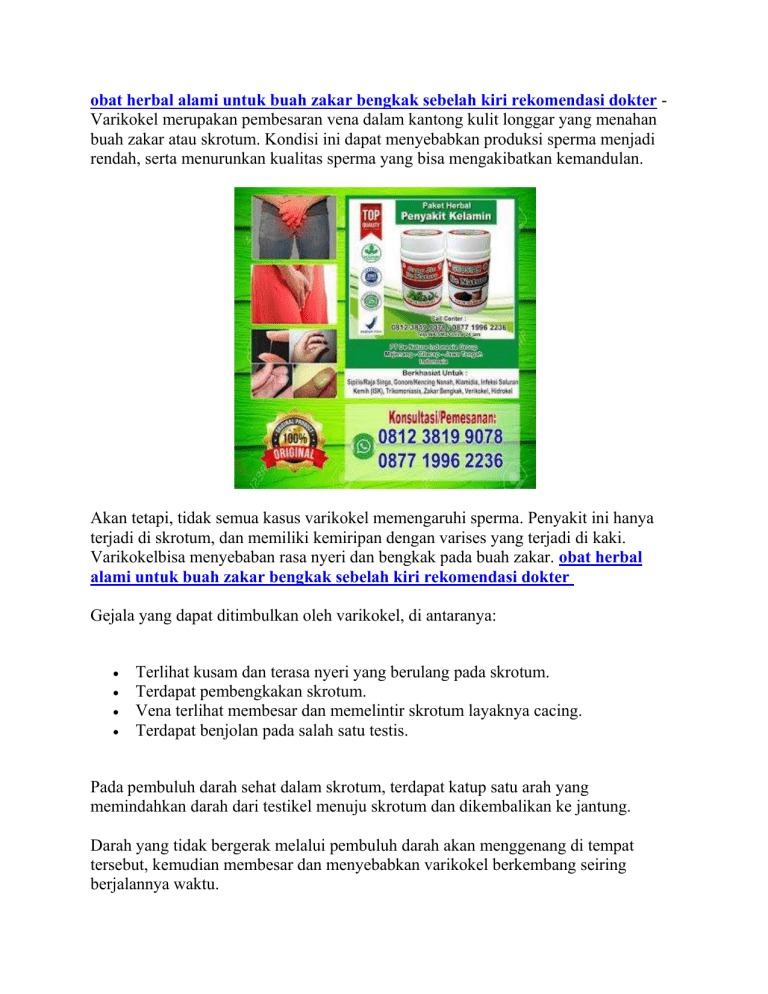 obat herbal alami untuk buah zakar bengkak sebelah kiri rekomendasi dokter Varikokel merupakan pembesaran vena dalam kantong kulit longgar yang menahan buah zakar atau skrotum. Kondisi ini dapat menyebabkan produksi sperma menjadi rendah, serta menurunkan kualitas sperma yang bisa mengakibatkan kemandulan. Akan tetapi, tidak semua kasus varikokel memengaruhi sperma. Penyakit ini hanya terjadi di skrotum, dan memiliki kemiripan dengan varises yang terjadi di kaki. Varikokelbisa menyebaban rasa nyeri dan bengkak pada buah zakar. obat herbal alami untuk buah zakar bengkak sebelah kiri rekomendasi dokter Gejala yang dapat ditimbulkan oleh varikokel, di antaranya: Terlihat kusam dan terasa nyeri yang berulang pada skrotum. Terdapat pembengkakan skrotum. Vena terlihat membesar dan memelintir skrotum layaknya cacing. Terdapat benjolan pada salah satu testis. Pada pembuluh darah sehat dalam skrotum, terdapat katup satu arah yang memindahkan darah dari testikel menuju skrotum dan dikembalikan ke jantung. Darah yang tidak bergerak melalui pembuluh darah akan menggenang di tempat tersebut, kemudian membesar dan menyebabkan varikokel berkembang seiring berjalannya waktu. Meski demikian, tidak ada penyebab pasti dari varikokel. Varikokel tidak selalu dapat dilihat saat berbaring. Oleh karena itu, dokter akan memeriksa testis Anda saat berdiri dan berbaring. Pemeriksaan USG skrotum juga mungkin dilakukan untuk membantu mengukur vena spermatika, agar mendapatkan gambaran rinci dan akurat tentang kondisi organ tersebut. Tes pencitraan lebih lanjut bisa diambil untuk memastikan sekaligus menyingkirkan kemungkinan adanya tumor. obat herbal alami untuk buah zakar bengkak sebelah kiri rekomendasi dokter Jika varikokel menyebabkan nyeri, atrofi, infertilitas, dokter dapat melakukan terapiterapi berikut: Bedah laparaskopi. Dokter bedah membuat sayatan keci di perut dan melewati instrumen kecil melalui sayatan untuk melihat dan memperbaiki varikokel. Embolisasi varikokel. Prosedur operasi ini dilakukan dengan memasukkan kateter kecil ke pangkal paha. Pemasangan kateter ini bertujuan untuk menyumbat pembuluh darah di testis yang mengganggu aliran darah, serta memperbaiki varikokel dengan menyisipkan tabung pembuluh darah di selangkangan. Varikokelektomi. Prosedur operasi ini dilakukan dengan menjepit atau mengikat pembuluh darah yang tidak normal. Darah kemudian dapat mengalir dari sekitar pembuluh darah abnormal ke pembuluh darah yang normal. Penelusuran yang terkait dengan obat herbal alami untuk buah zakar bengkak sebelah kiri rekomendasi dokter : obat sakit buah zakar sebelah kiri, obat alami buah zakar bengkak sebelah kiri, obat tradisional benjolan di buah zakar, obat alami sakit buah zakar sebelah kiri, obat alami buah zakar bengkak sebelah kanan, "obat apotik buah zakar besar sebelah", obat alami buah zakar sakit sebelah kanan, cara mengatasi sakit buah zakar sebelah kiri Cara Alami Mengobati Buah Zakar Bengkak - Sakit Buah Zakar - Verikokel Hidrokel - Orchitis - Kencing Nanah/Gonore - ISK - Sipilis/Raja Singa Klamidia - Trikomoniasis Dan Penyakit Lainnya