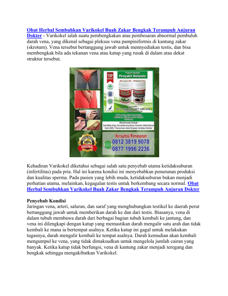Obat Herbal Sembuhkan Varikokel Buah Zakar Bengkak Terampuh Anjuran Dokter - Varikokel ialah suatu pembengkakan atau pembesaran abnormal pembuluh darah vena, yang dikenal sebagai pleksus vena pampiniformis di kantung zakar (skrotum). Vena tersebut bertanggung jawab untuk mennyediakan testis, dan bisa membengkak bila ada tekanan vena atau katup yang rusak di dalam atau dekat struktur tersebut. Kehadiran Varikokel diketahui sebagai salah satu penyebab utama ketidaksuburan (infertilitas) pada pria. Hal ini karena kondisi ini menyebabkan penurunan produksi dan kualitas sperma. Pada pasien yang lebih muda, ketidaksuburan bukan menjadi perhatian utama, melainkan, kegagalan testis untuk berkembang secara normal. Obat Herbal Sembuhkan Varikokel Buah Zakar Bengkak Terampuh Anjuran Dokter Penyebab Kondisi Jaringan vena, arteri, saluran, dan saraf yang menghubungkan testikel ke daerah perut bertanggung jawab untuk memberikan darah ke dan dari testis. Biasanya, vena di dalam tubuh membawa darah dari berbagai bagian tubuh kembali ke jantung, dan vena ini dilengkapi dengan katup yang memastikan darah mengalir satu arah dan tidak kembali ke mana ia bertempat asalnya. Ketika katup ini gagal untuk melakukan tugasnya, darah mengalir kembali ke tempat asalnya. Darah kemudian akan kembali mengumpul ke vena, yang tidak dimaksudkan untuk mengelola jumlah cairan yang banyak. Ketika katup tidak berfungsi, vena di kantung zakar menjadi teregang dan bengkak sehingga mengakibatkan Varikokel. Varikokel biasanya berkembang dari waktu ke waktu, mempengaruhi sebagian besar pasien berusia 15 sampai 25. Penelitian menunjukkan bahwa penyebab pasti pembentukan Varikokel tidak jelas, tetapi ada beberapa teori. Yang pertama disebutkan di atas, ketika katup dalam vena gagal berfungsi dengan baik dan menyebabkan darah, yang harus dialirkan ke jantung, mengalir kembali ke asalnya sehingga menyebabkan pembengkakan pembuluh darah. Banyak ahli kesehatan juga percaya bahwa ketidakseimbangan susunan tubuh (asimetri anatomi) juga dapat menyebabkan perbedaan varises testi dalam vena spermatika kanan dan kiri, atau ketidakseimbangan, dapat meningkatkan tekanan pada satu sisi testis. Efek Nutcracker, di sisi lain, berpendapat bahwa vena ginjal kiri, yang dimulai dari sisi ginjal kiri, menjadi tertekan atau terjepit. Hal ini kemudian menyebabkan tekanan abnormal pada vena spermatika kiri, karena mencoba memberikan darah kembali ke jantung pasien. Obat Herbal Sembuhkan Varikokel Buah Zakar Bengkak Terampuh Anjuran Dokter Gejala utama Varikokel dapat tidak ditemukan selama bertahun-tahun, terutama karena gejala tidak terlalu jelas bagi pasien. Banyak pasien biasanya ditemukan saat pemeriksaan fisik rutin atau tes kesuburan. Namun, salah satu tanda yang lebih umum dari varikokel adalah benjolan di salah satu testis, atau pembengkakan abnormal pada kantung zakar. Setelah pemeriksaan lebih dekat, vena di kantung zakar terpuntir atau membesar, banyak pasien dan dokter melaporkan Varikokel muncul seperti "tas cacing" di bawah kulit. Pembengkakan vena juga bisa teraba, orang dapat merasakan pembengkakan dan terpuntirnya vena di kantung zakar. Kadang-kadang, Varikokel dapat menyebabkan rasa sakit di dalam kantung zakar atau rasa berat di testis. Menyusutnya testis pasien juga merupakan gejala yang umum, yang disebabkan oleh aliran darah yang tidak teratur dalam kantung zakar. Kadar normal testosteron yang abnormal juga bisa dialami oleh pasien, serta masalah perkemihan seperti pembesaran prostat jinak (Benign Prostatic Hyperplasia/BPH). Obat Herbal Sembuhkan Varikokel Buah Zakar Bengkak Terampuh Anjuran Dokter Siapa yang harus dikunjungi dan Jenis Penrawatan yang Tersedia Bila Anda mengamati salah satu gejala yang dijelaskan di atas, langkah terbaik adalah untuk membuat jadwal janji dengan dokter sesegera mungkin. Dalam banyak kasus, Varikokel dapat dengan mudah diamati dengan melihat atau disentuh jika pembengkakan cukup besar, dokter (biasanya seorang ahli urologi) tidak akan memerlukan tes khusus untuk memastikan kehadiran Varikokel. Namun, jika pembengkakan lebih kecil, dokter akan meminta Anda untuk berdiri, menarik nafas dalam-dalam dan manahannya di bawah untuk melihat apakah ada pembengkakan abnormal atau pembesaran di pembuluh darah kantung zakar. Jika pemeriksaan fisik tidak menunjukkan adanya pembengkakan abnormal pada kantung zakar, dokter kemudian bisa mengusulkan pemeriksaan USG kantung zakar. Tindakan pencitraan lanjut mungkin diperlukan untuk memastikan keberadaan dan tingkat Varikokel, serta memandu dokter dalam merumuskan rencana perawatan yang terbaik. Obat Herbal Sembuhkan Varikokel Buah Zakar Bengkak Terampuh Anjuran Dokter Ketika Varikokel terdiagnosis, ada beberapa pilihan perawatan yang tersedia. Dalam beberapa kasus, dokter mungkin menyarankan pasien untuk tidak berbuat apa-apa asalkan terbukti bahwa hal tersebut tidak merugikan alat kelamin dan fungsi reproduksi. Tetapi jika pembengkakan di vena kantung zakar menyebabkan kemandulan, rasa tidak nyaman, nyeri, atau menyusutnya testis, yang terbaik adalah untuk menjalani pengobatan untuk kondisi tersebut. Pembedahan adalah salah satu tindakan perawatan yang paling umum untuk Varikokel. Pembedahan bertujuan untuk menutup vena yang terkena dalam jaringan untuk memungkinkan aliran darah yang normal dan tepat. Pasien yang menderita ketidaksuburan karena pembengkakan vena kantung zakar dapat mengamati peningkatan jumlah dan kualitas sperma. Bedah terbuka, dipandu oleh USG Doppler, tetap populer untuk perawatan Varikokel. Bedah lubang kunci (laparoskopi) juga populer, di mana sayatan kecil dibuat di perut bagian bawah, dan instrumen kecil melewatinya untuk melihat dan menangani Varikokel. Metode perawatan lain adalah embolisasi perkutan, di mana tabung kecil dilewatkan melalui vena leher atau selangkangan. Tabung ini digunakan dengan alat kecil di mana cairan atau kumparan dilepaskan untuk memasukkan "blok" di vena untuk mencegah aliran balik. Embolisasi tidak sepopuler perawata